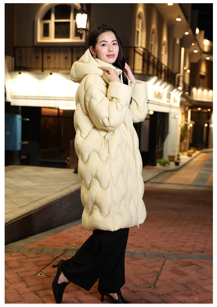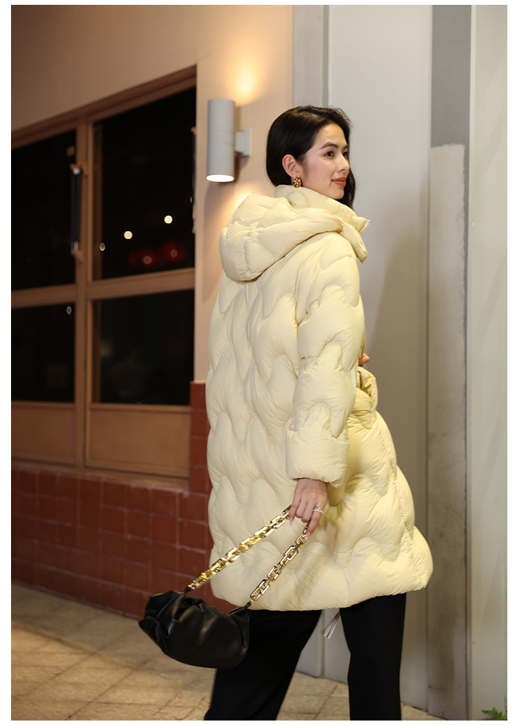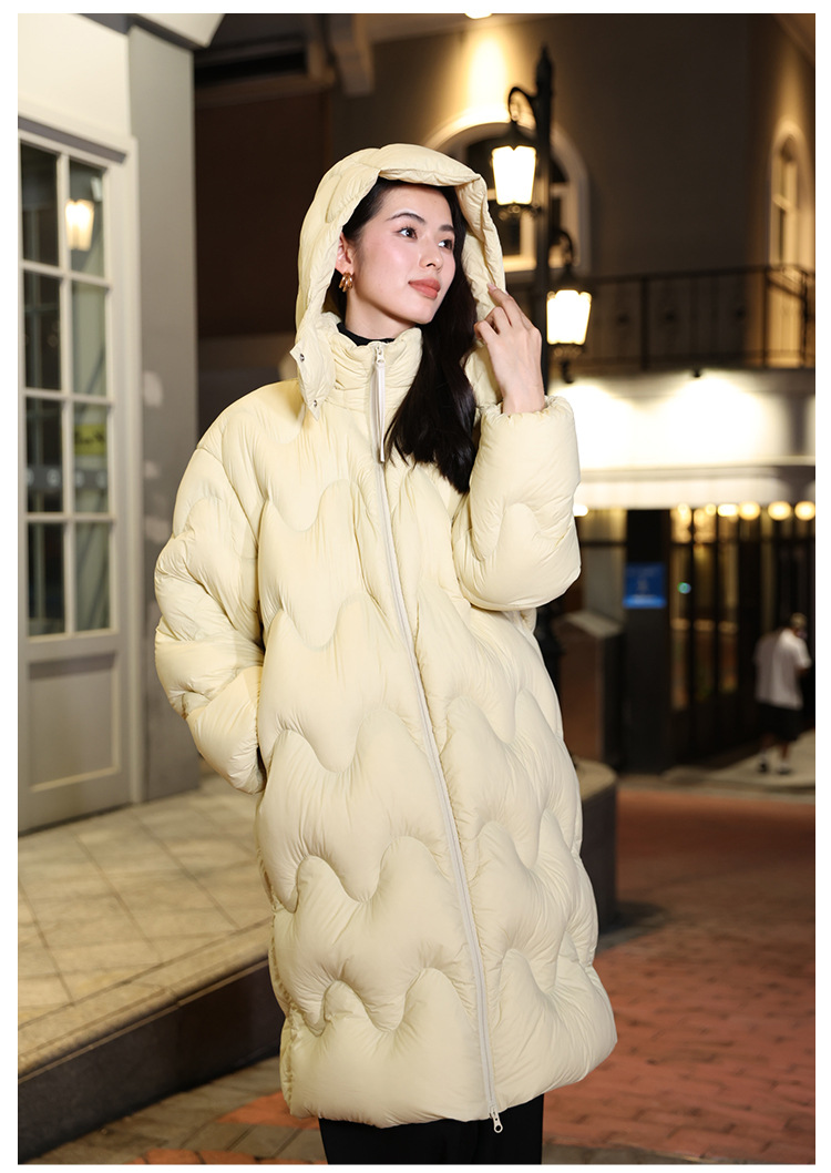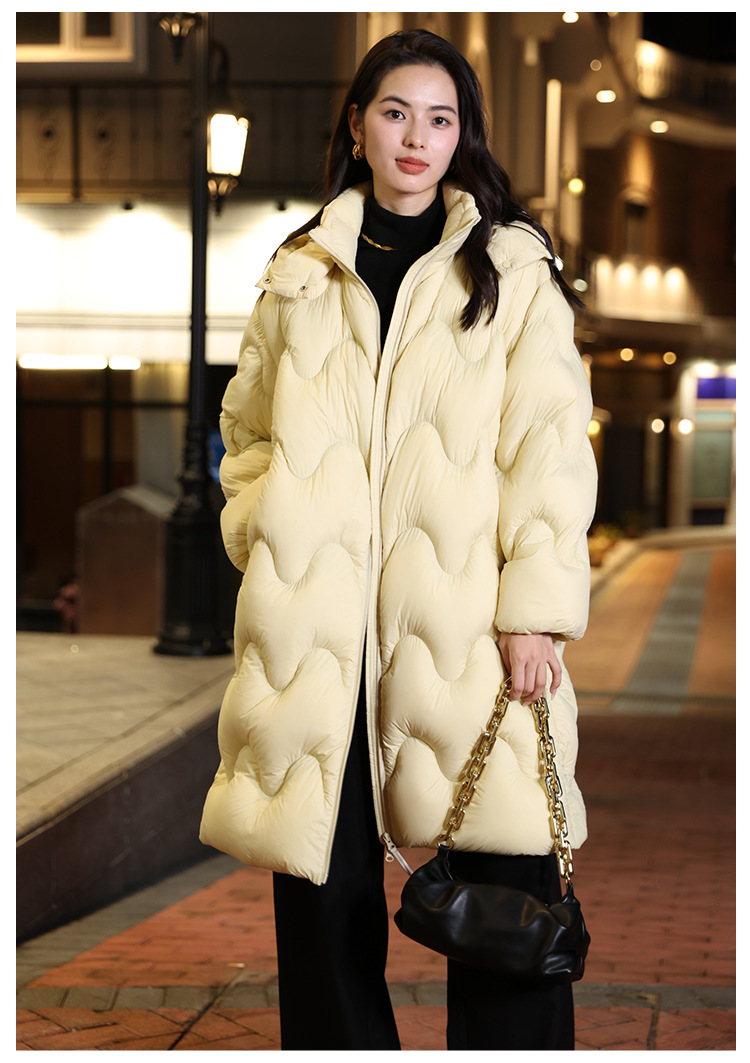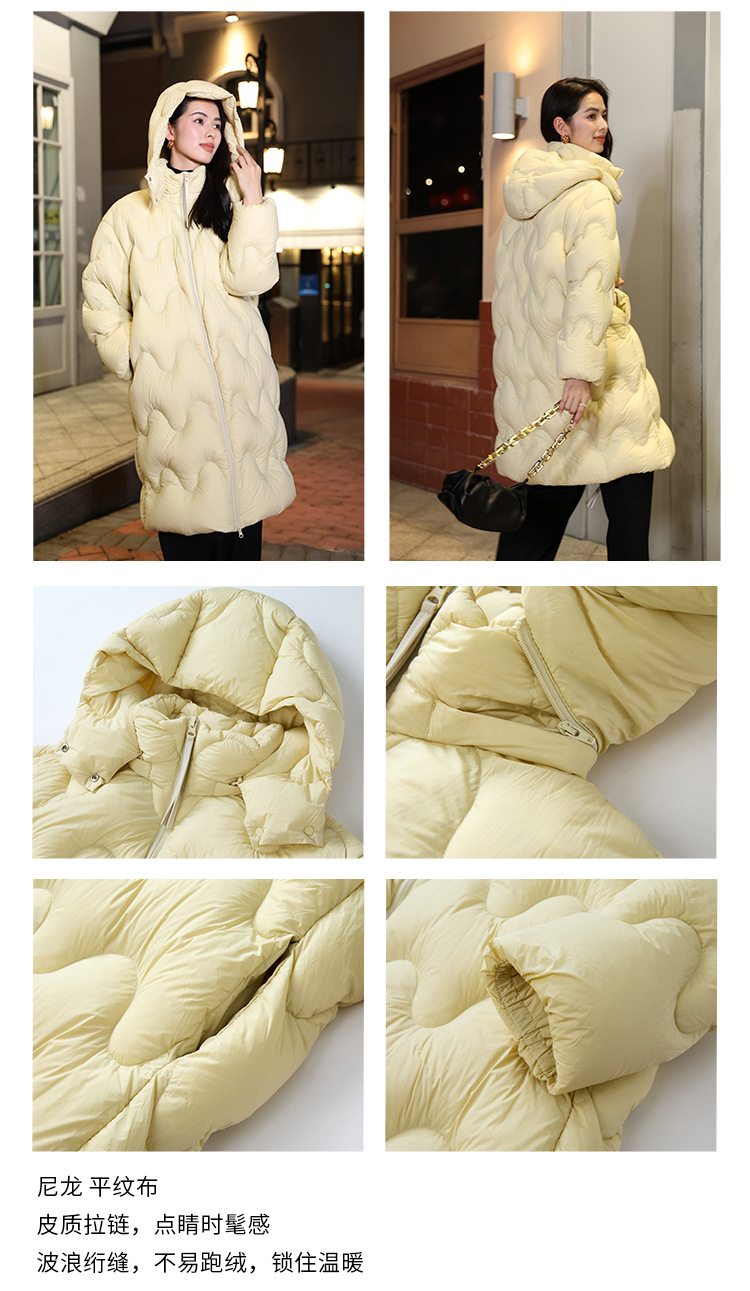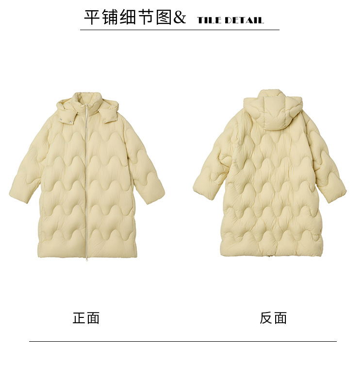 丁摩新品长款简约时尚波浪立体设计90白鸭绒连帽长袖加厚羽绒服女 ALW250188