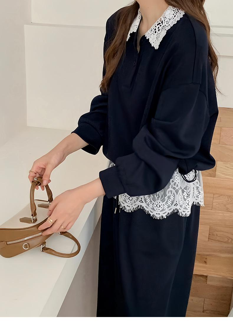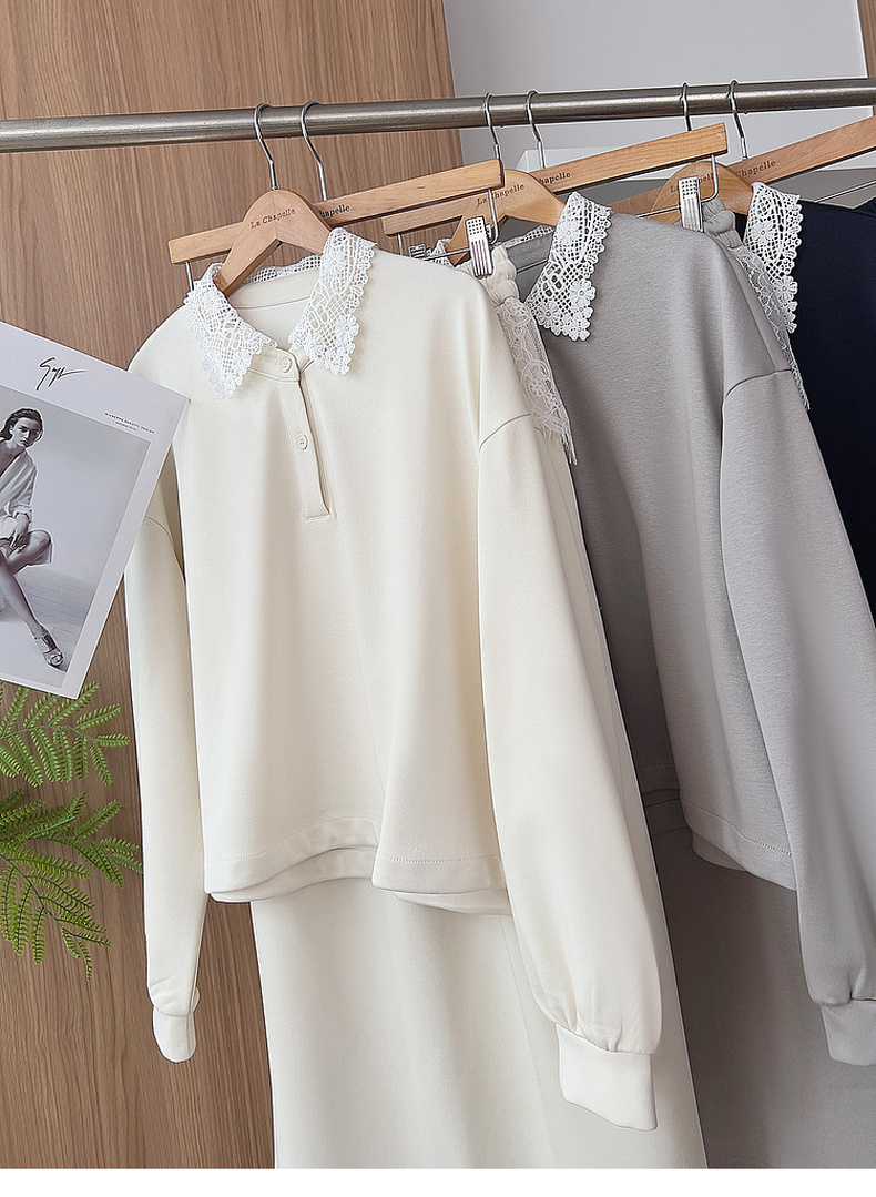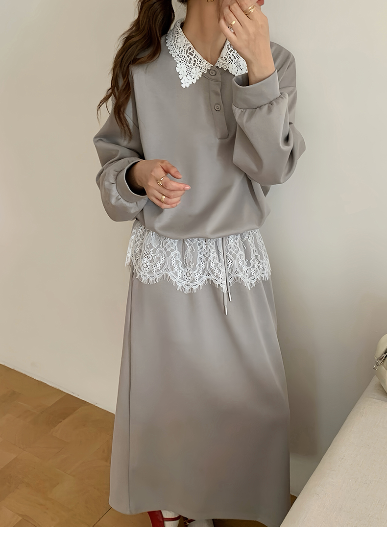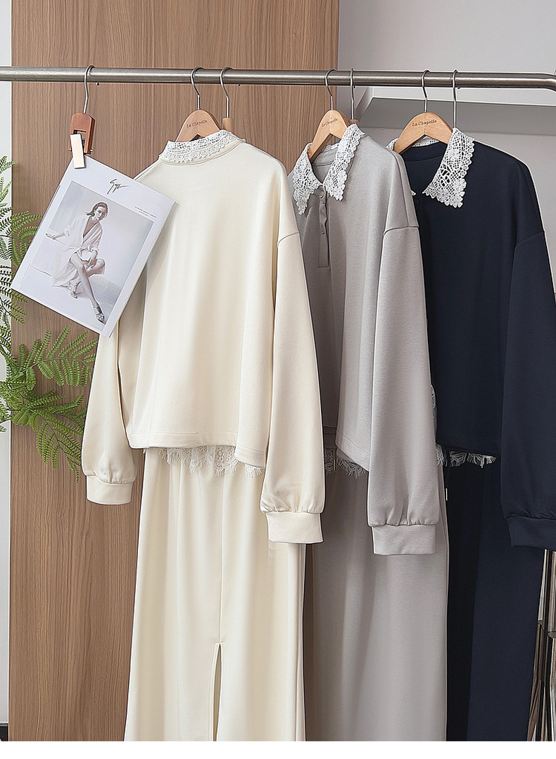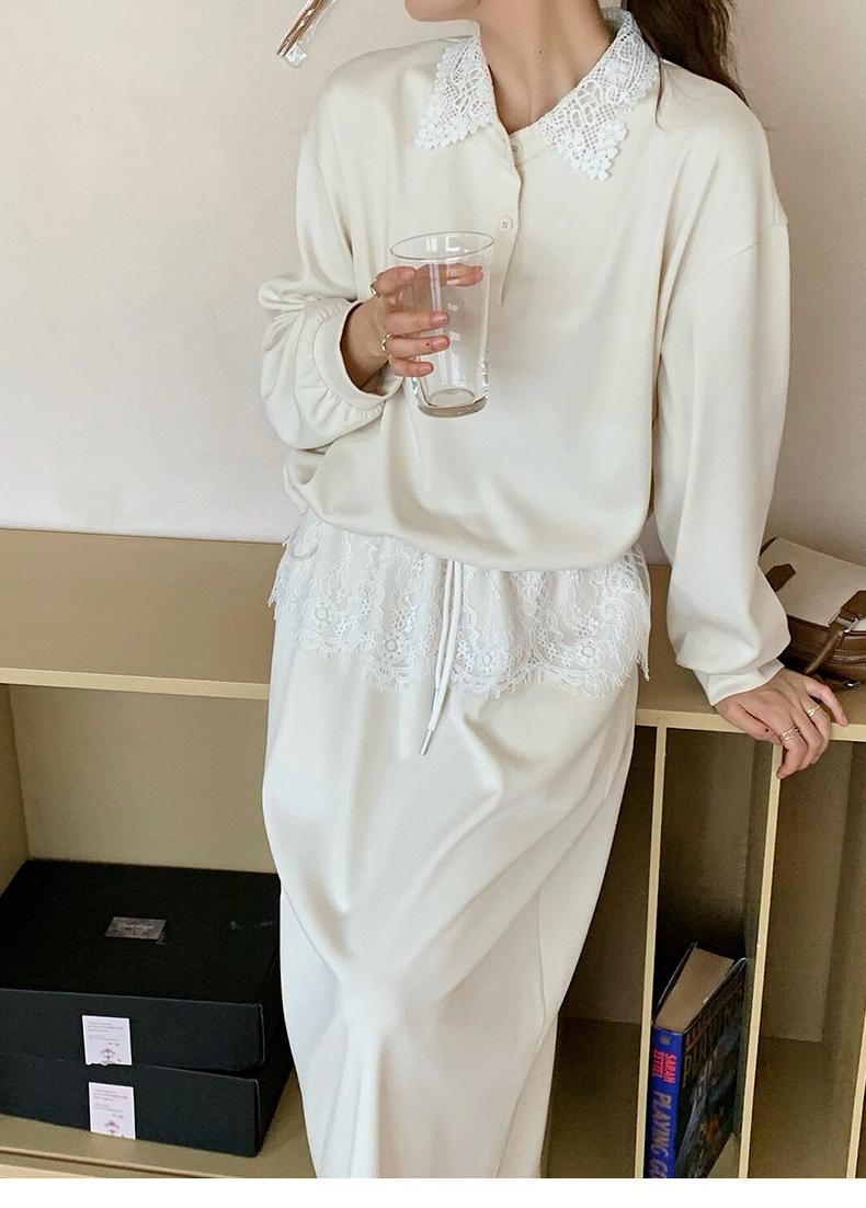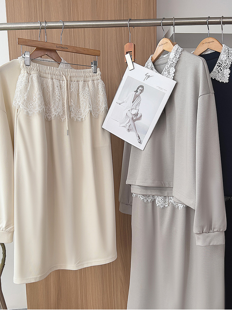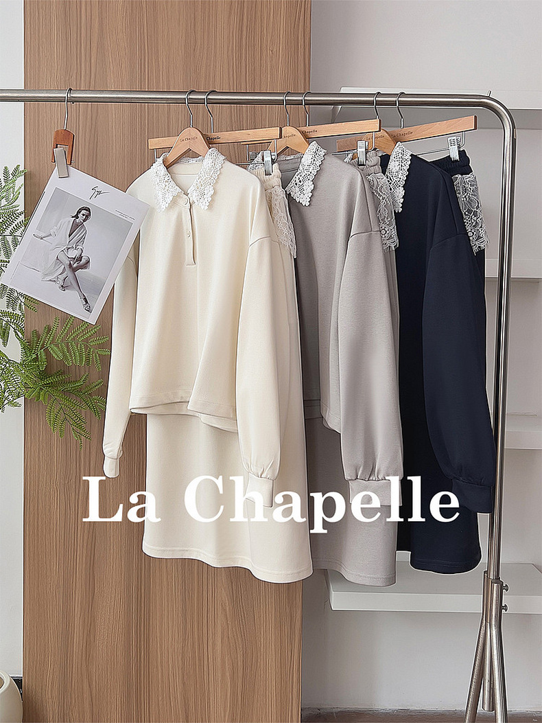专柜实拍【卫衣+半裙!两件】拉夏贝尔/La Chapelle高知穿搭!蕾丝翻领卫衣/松紧抽绳蕾丝拼接半裙减龄套装