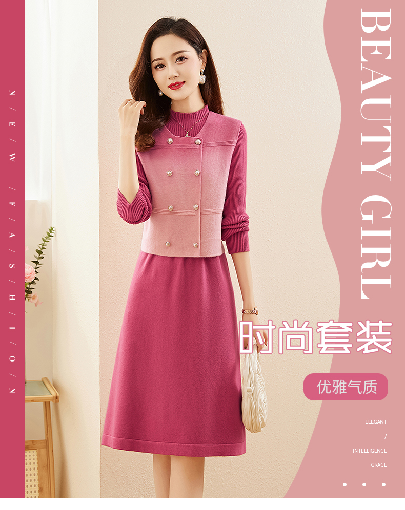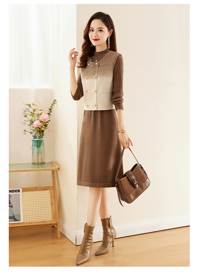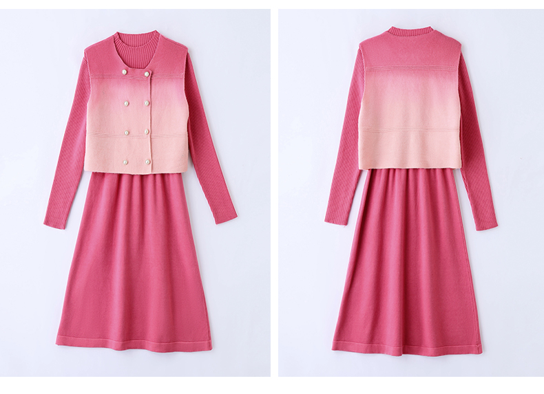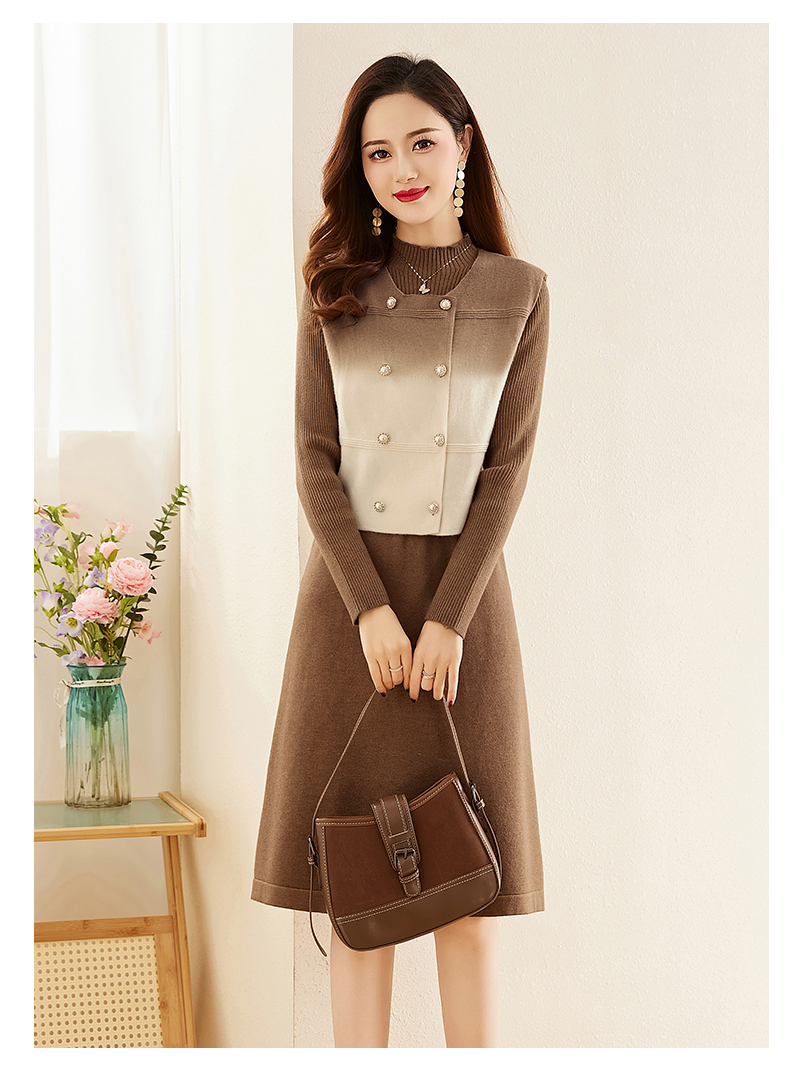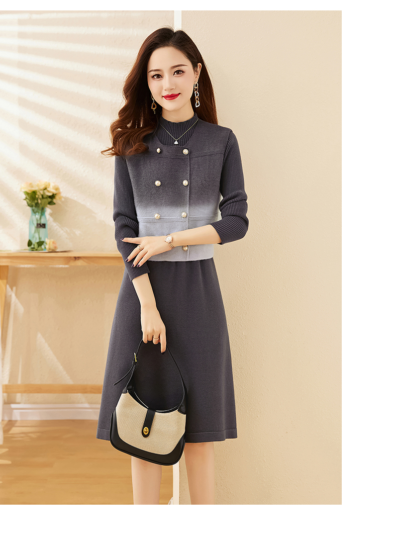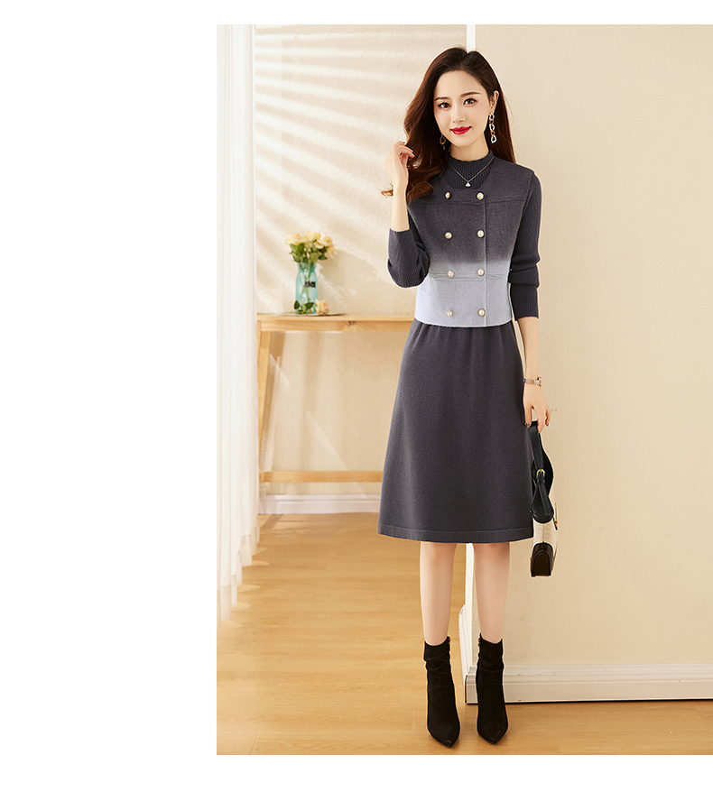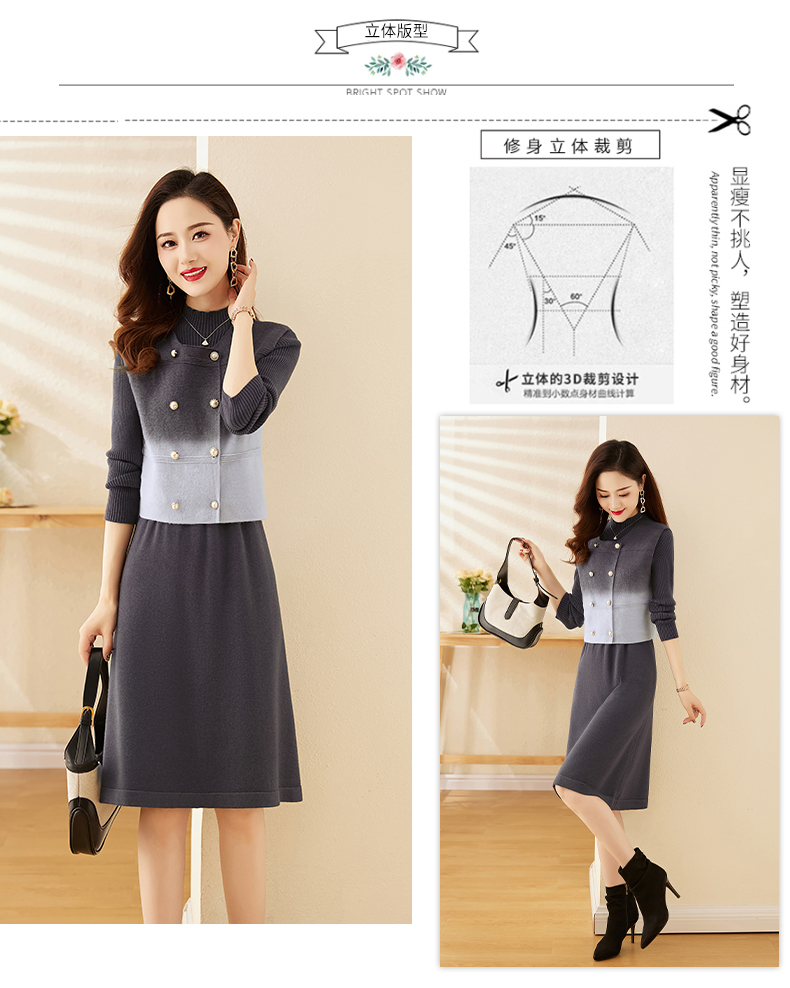 冬季新款,温柔风晕染渐变色百搭洋气双排扣两件套连衣裙HR-YBER106