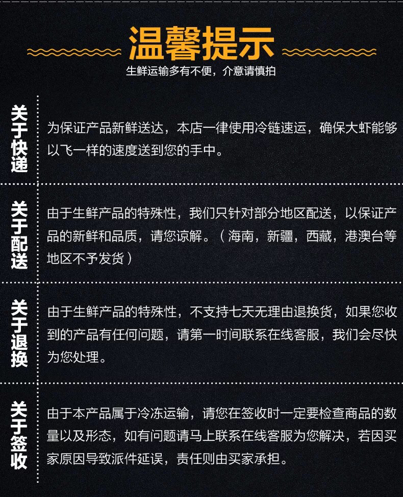 售后需知!重量有疑问请在签收2小时内称重并反馈售后!虾属于全程冷冻冰鲜,肉身娇嫩,到货请务必6小时内反馈售后!万不可放到云柜或者代收点过夜! 因客户主观原因,如:不好吃、没有想象中好、颜色形状不好看等不在理赔范围内!