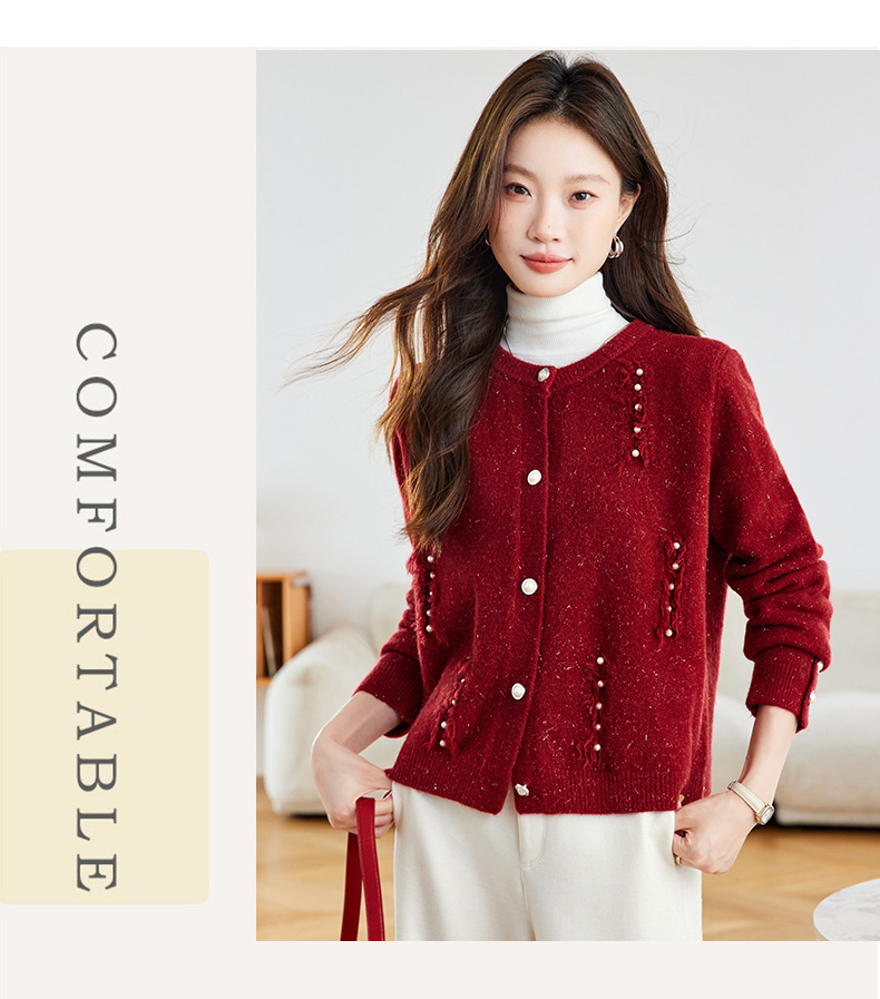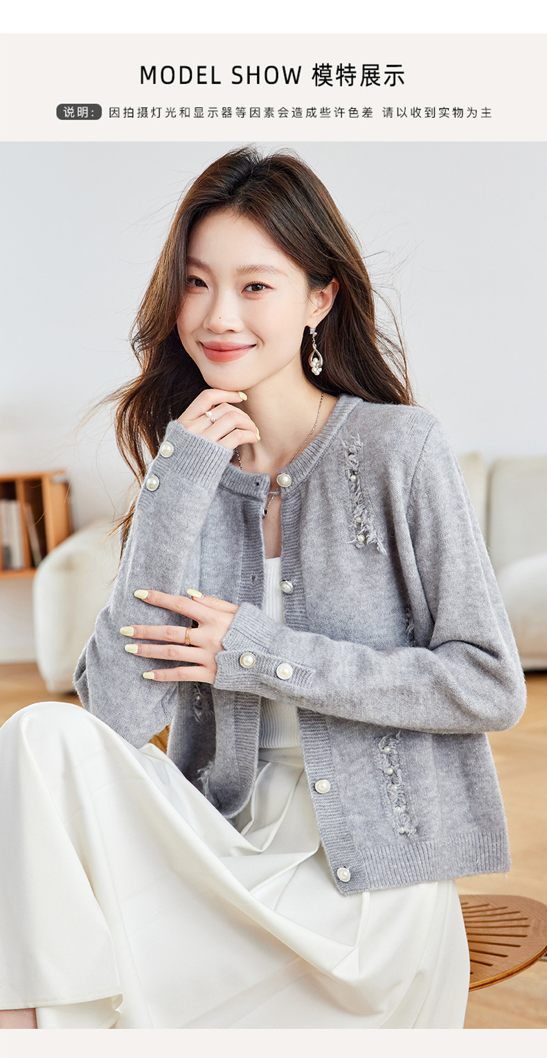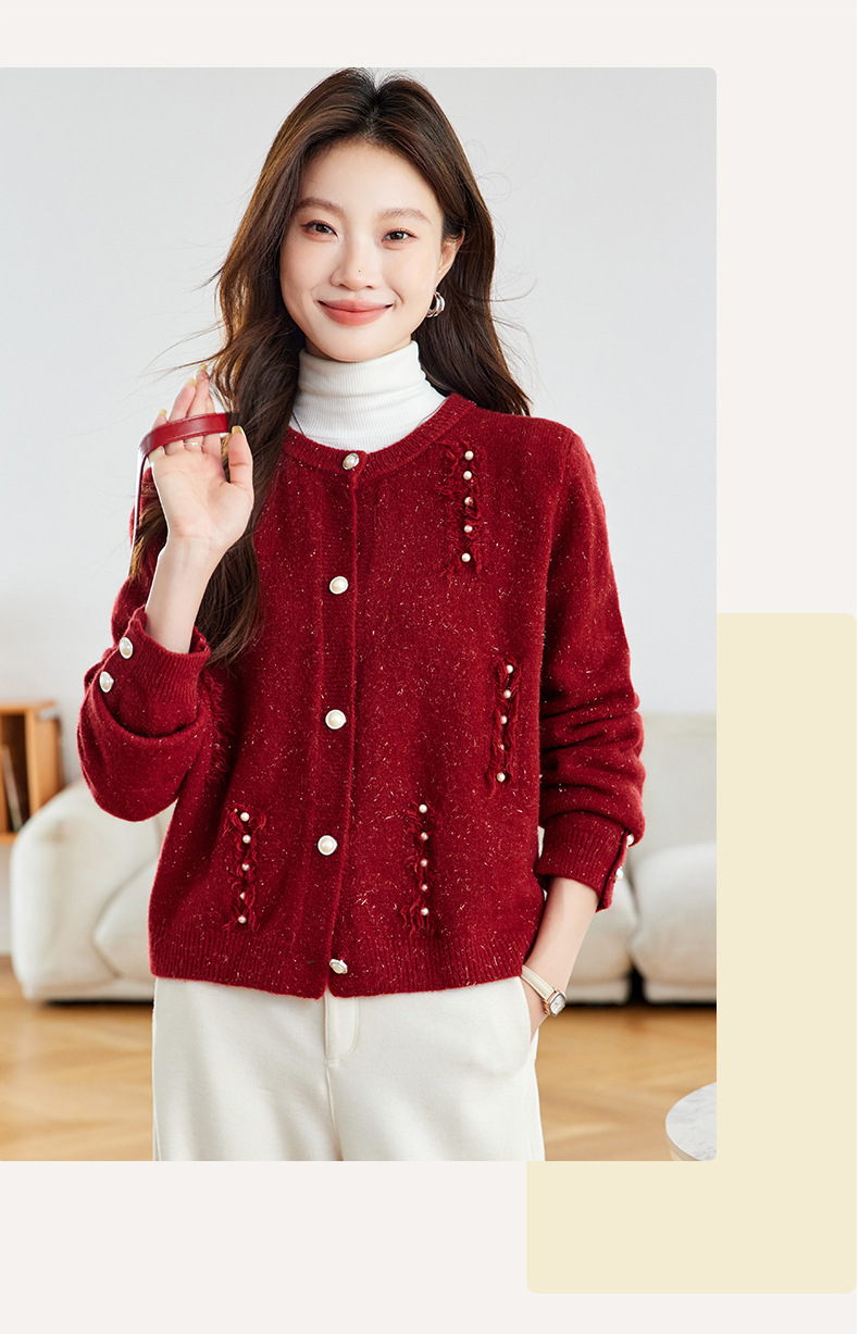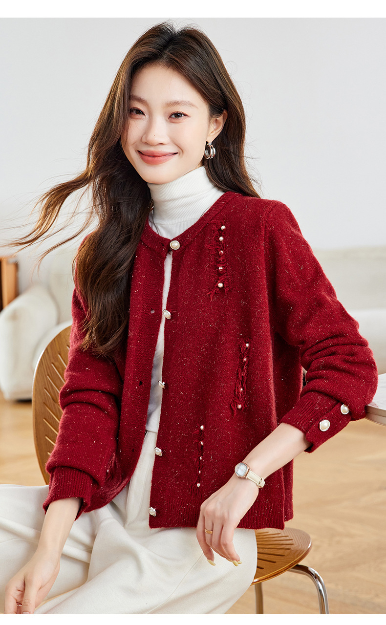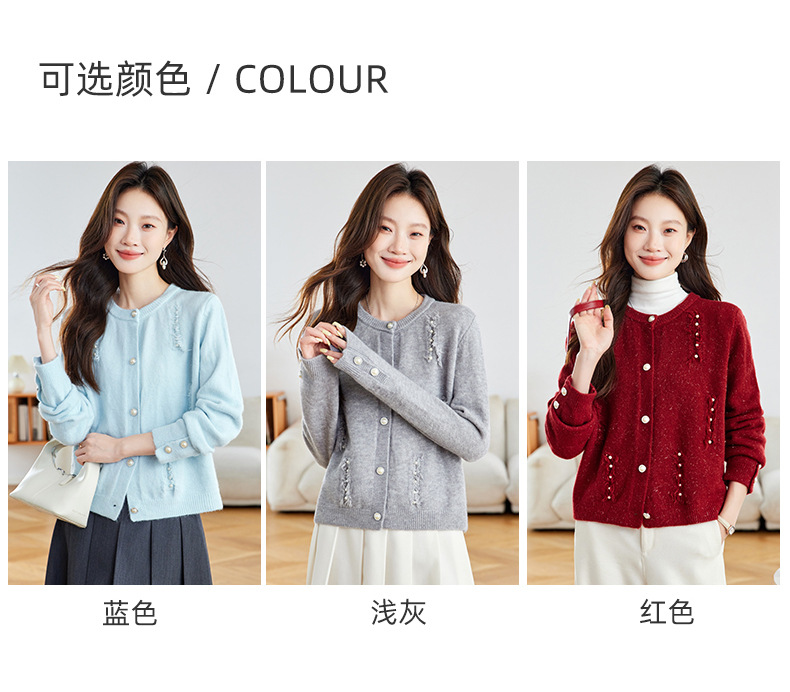 CC本命年羊毛针织开衫女春秋外搭宽松短款洋气上衣休闲圆领毛衣外套