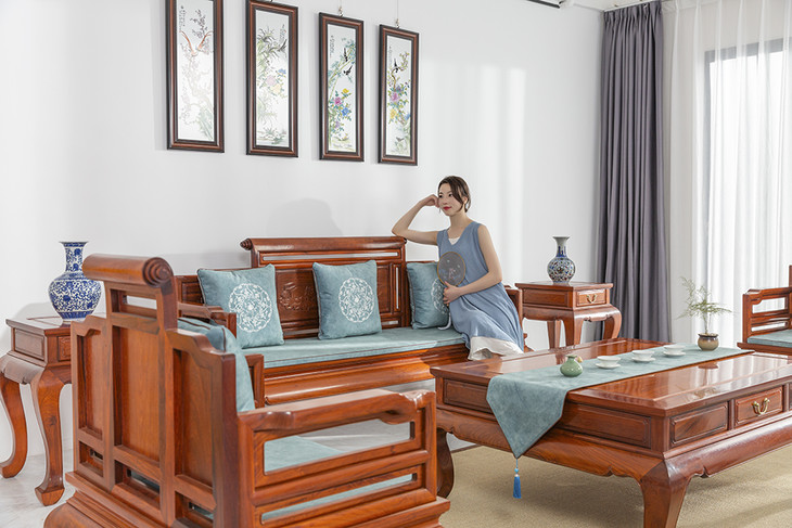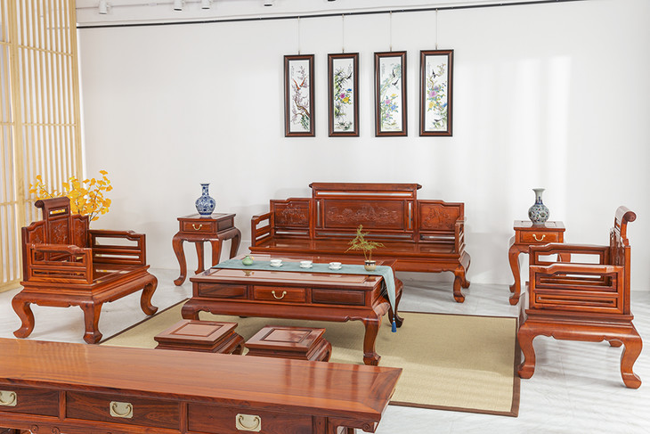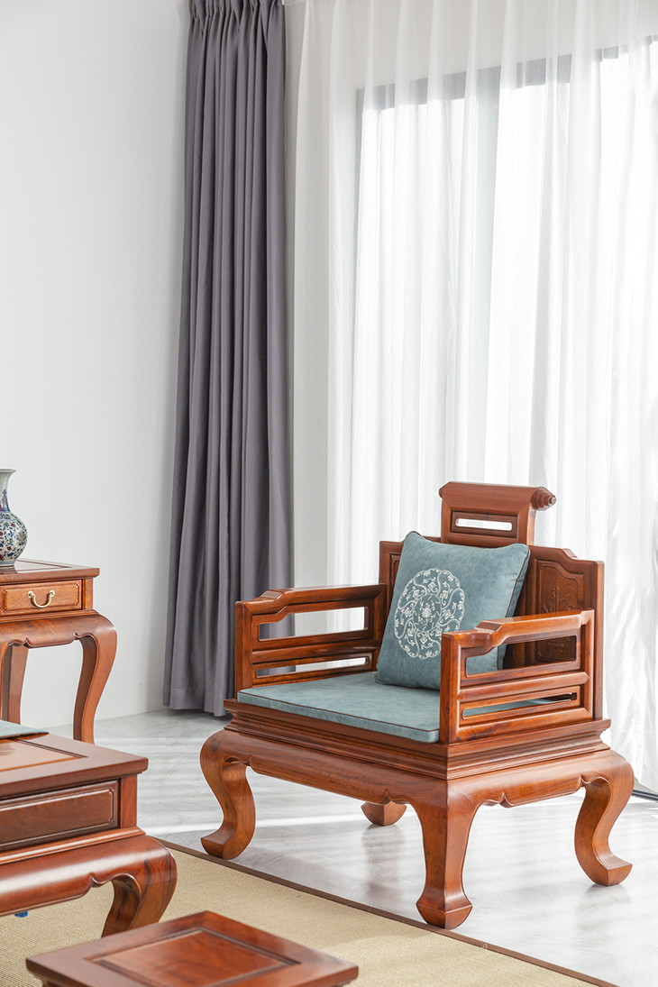 这款沙发采用卷书搭脑,清雅别致,增添了一份属于江南文人的书香气息,背板雕刻松鹤延年图案寓意吉祥,根据人体工程学设计加强了倚坐的舒适感,大茶几设有收纳抽屉,方便储物,端庄厚实,三弯腿,整体造型干净利落,婉转优美,意趣传统。