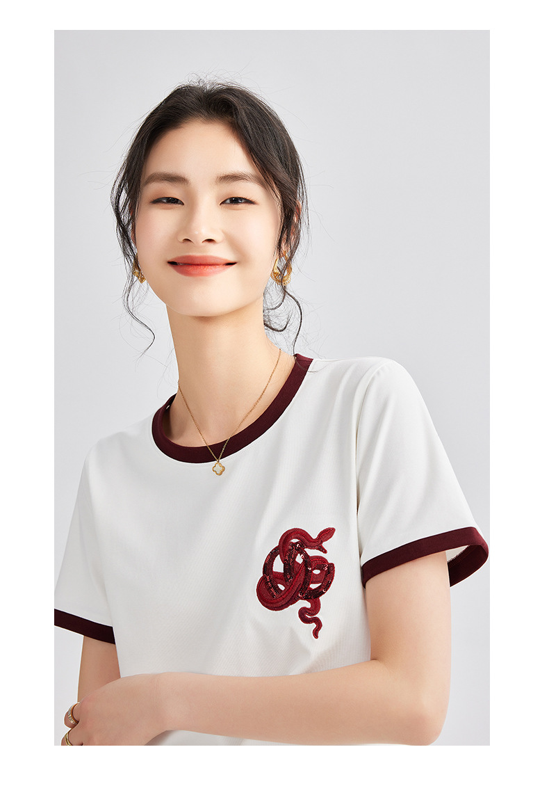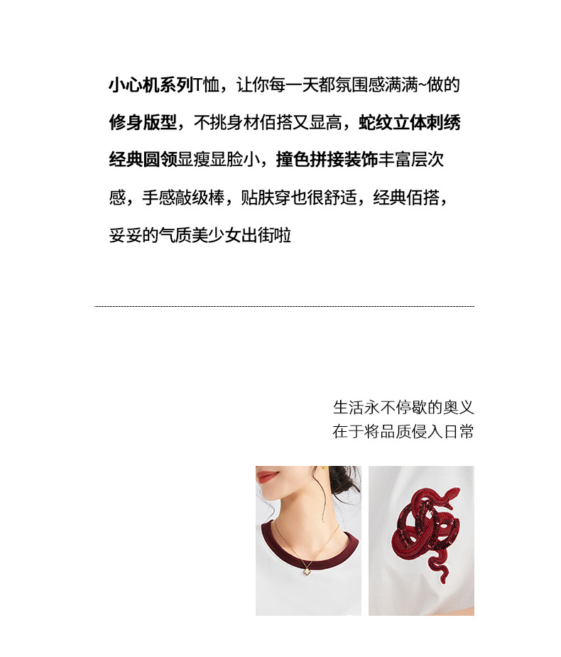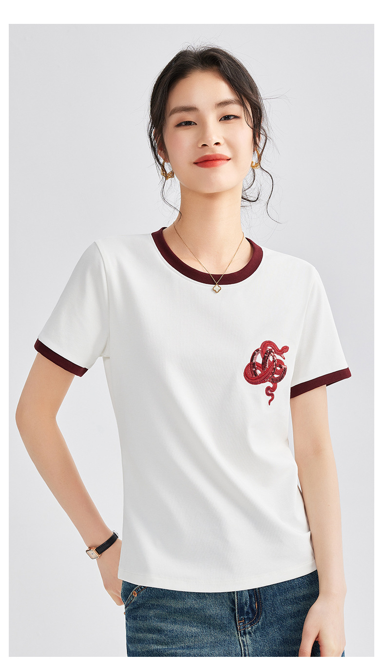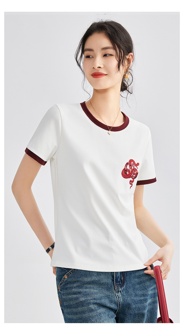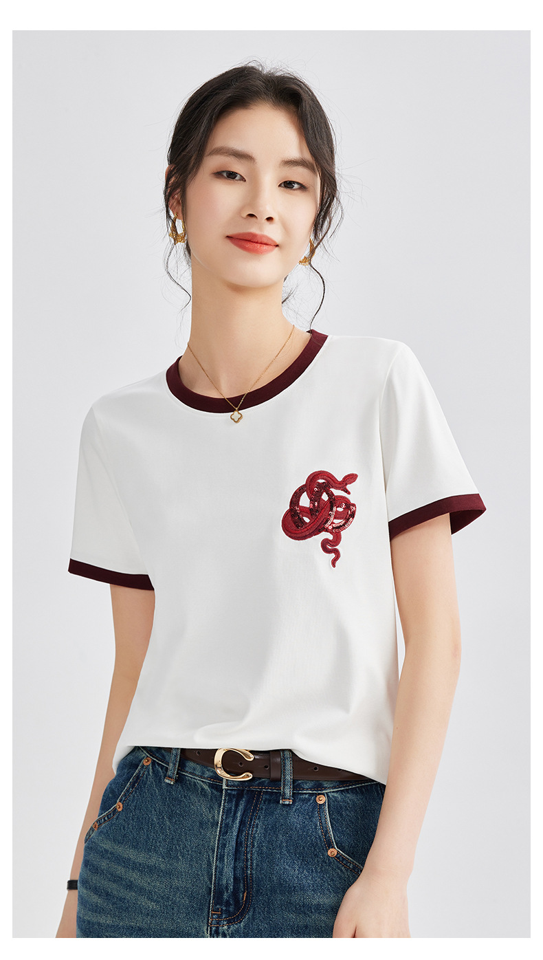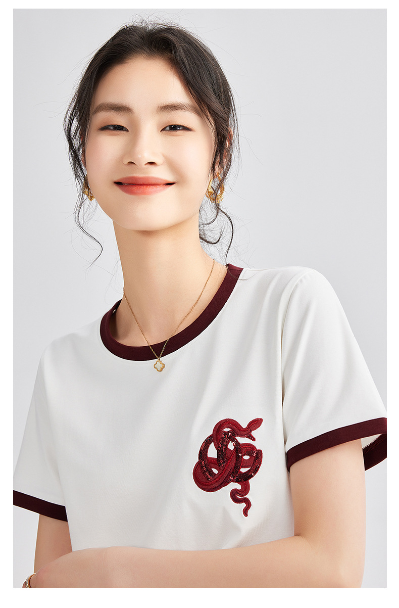 雀说春款蛇年刺绣T恤衫女时尚撞色圆领上衣宽松显瘦高级感短袖AL670
