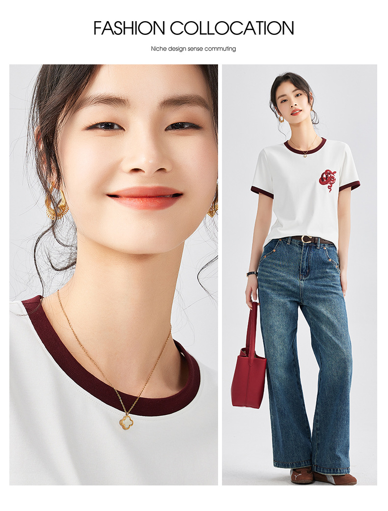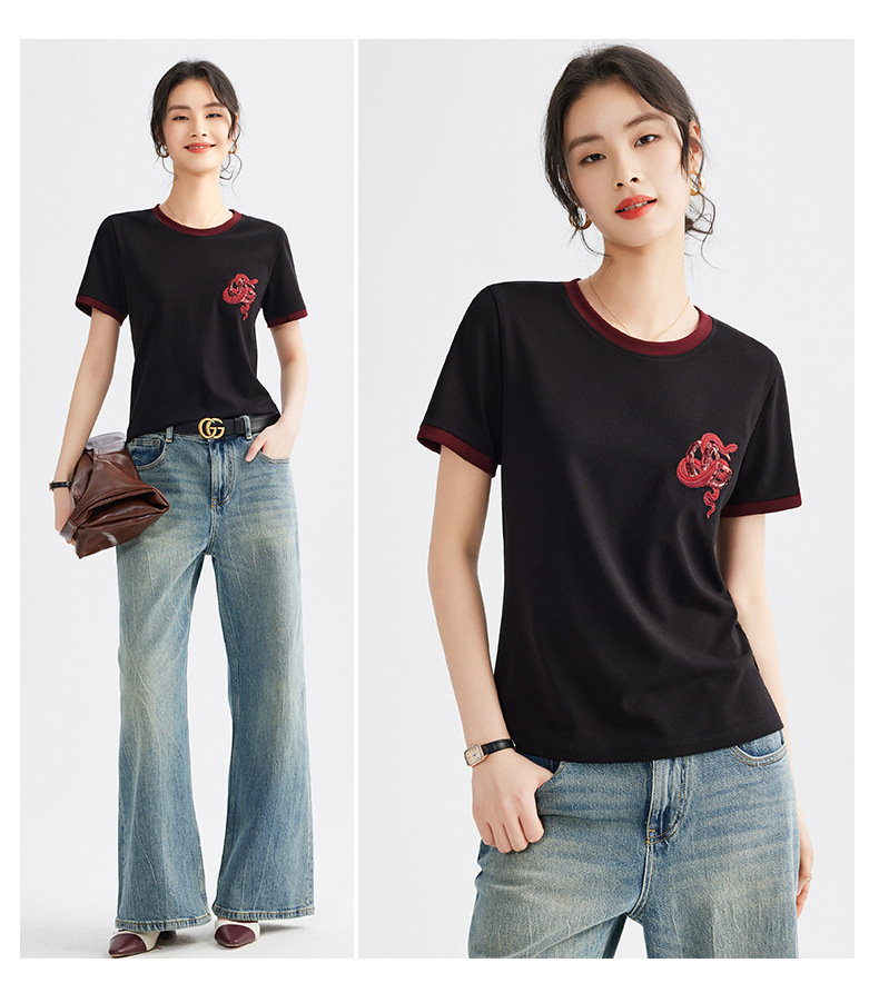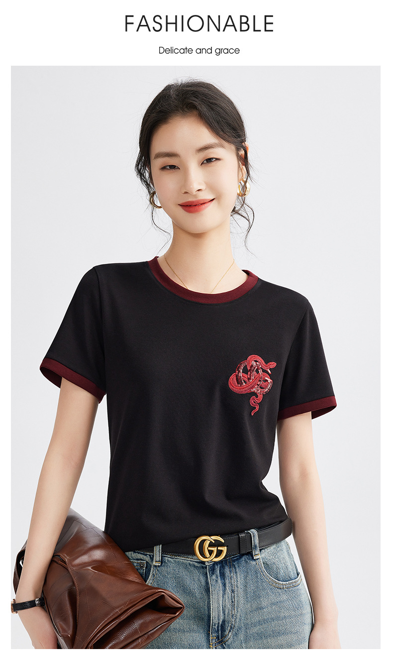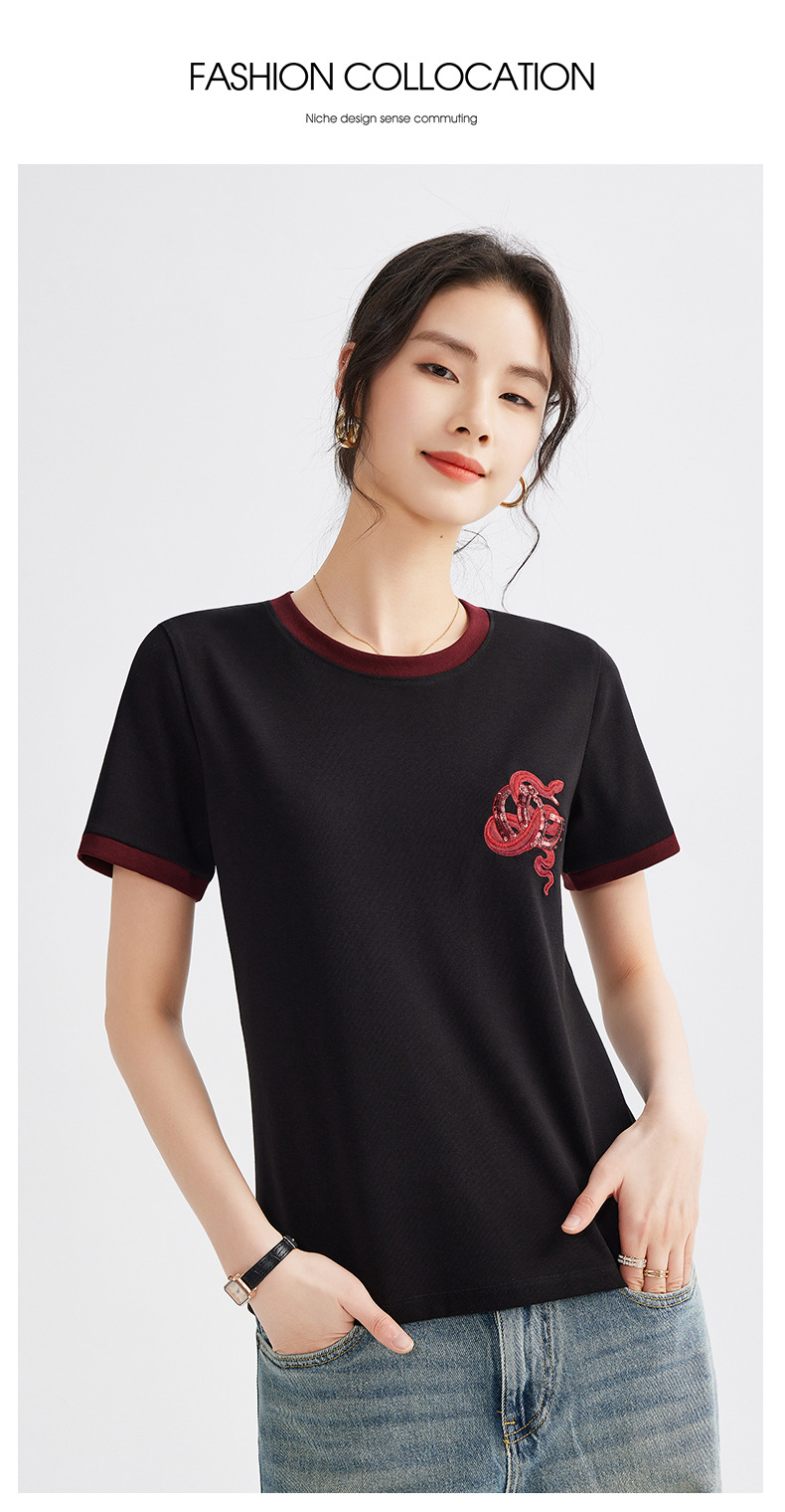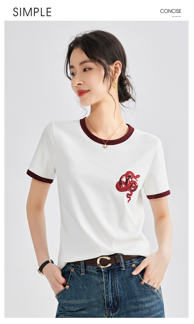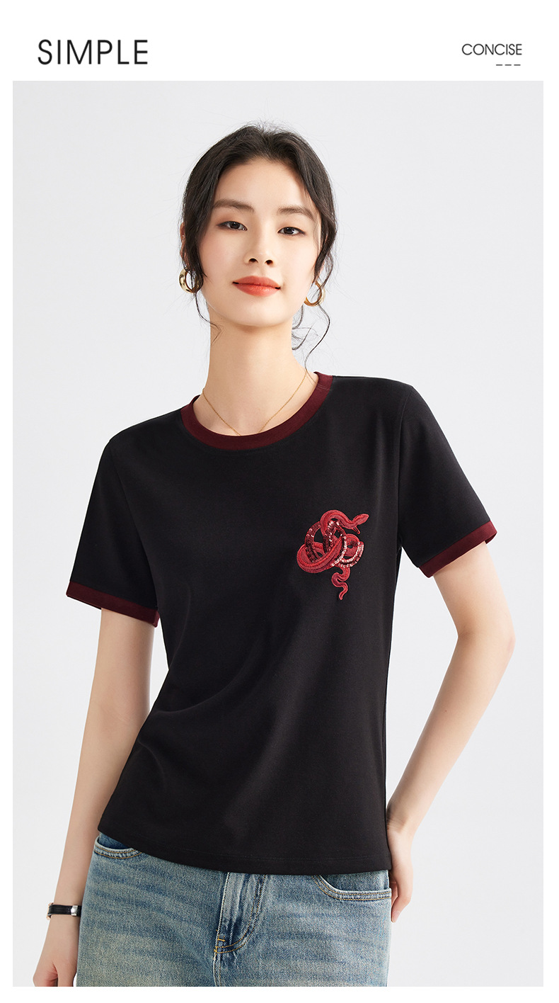 雀说春款蛇年刺绣T恤衫女时尚撞色圆领上衣宽松显瘦高级感短袖AL670