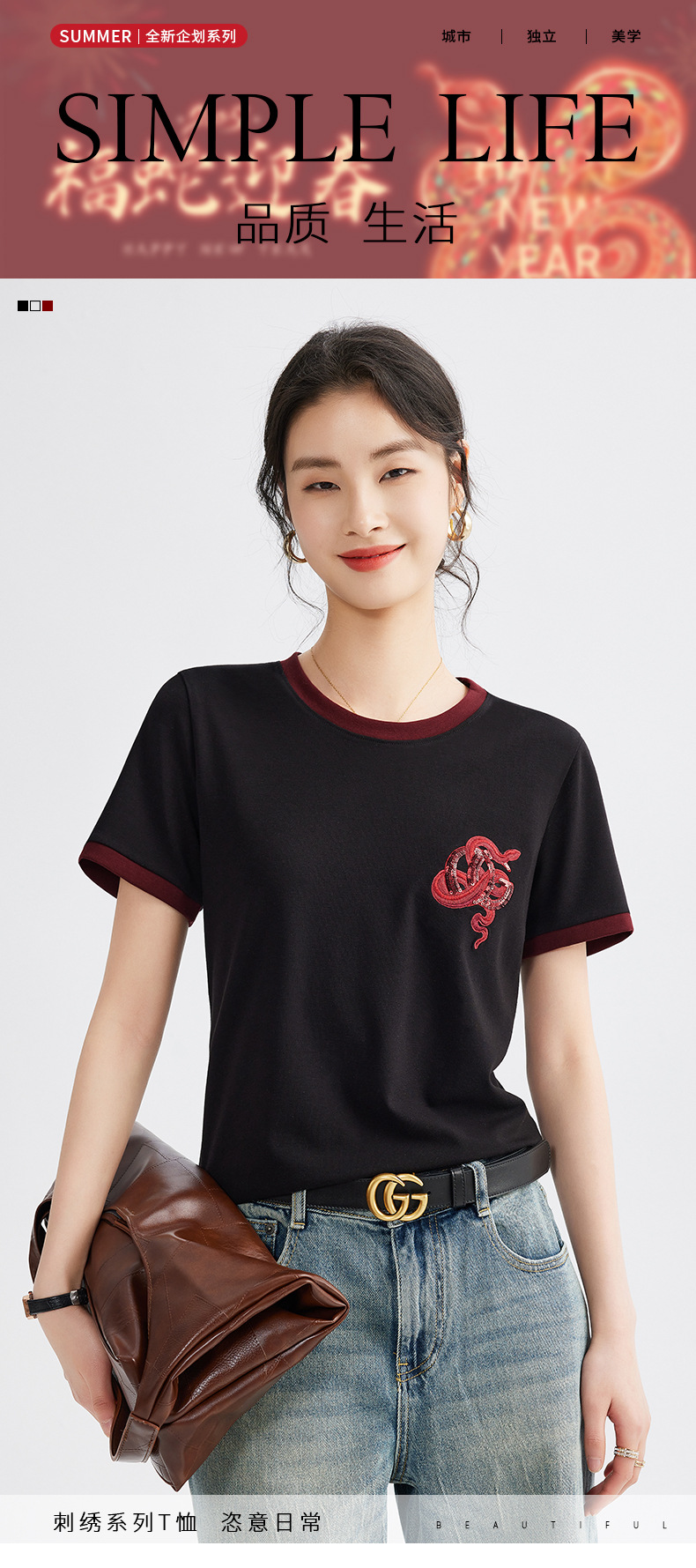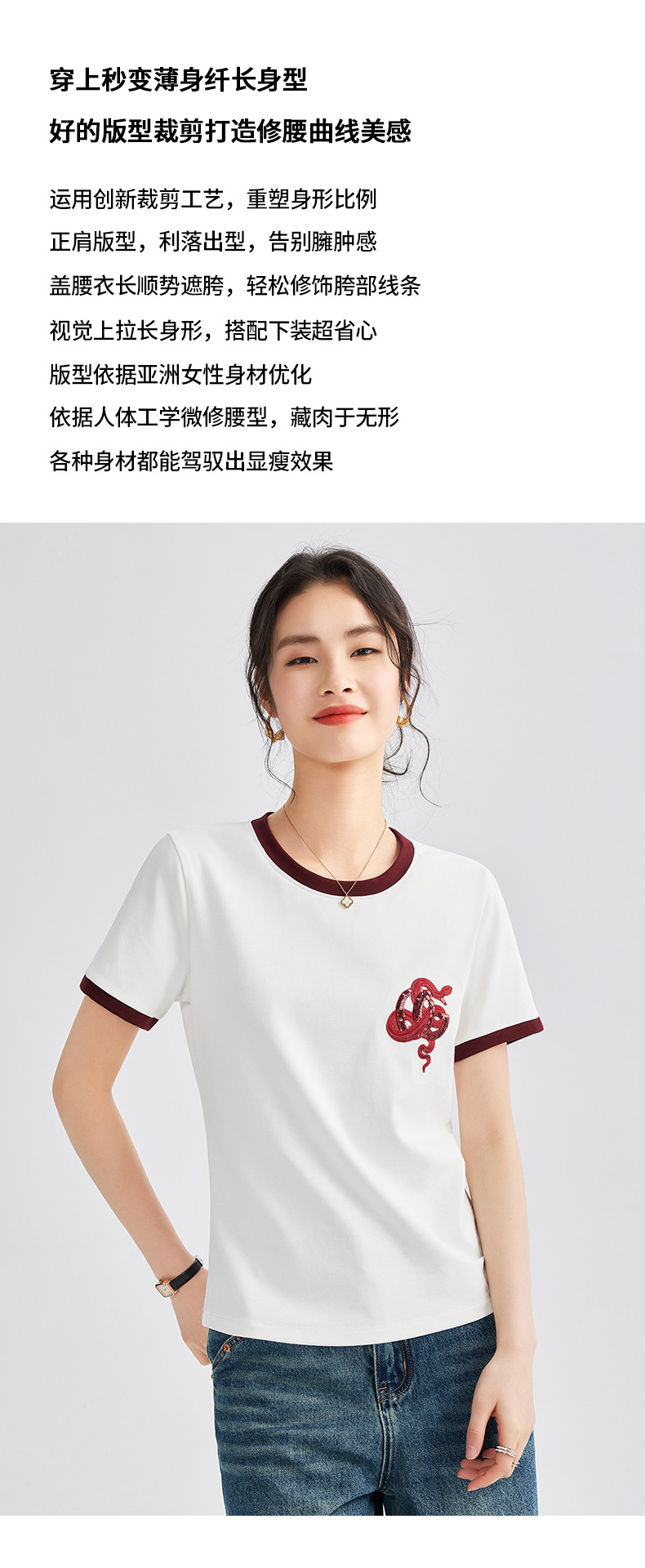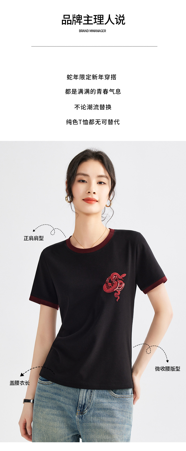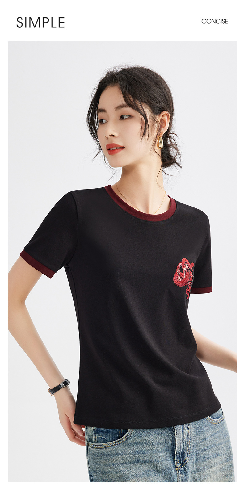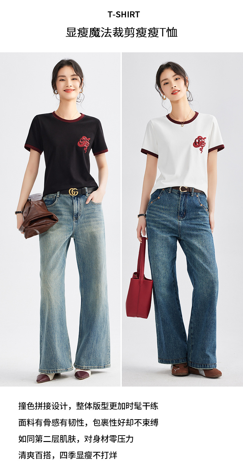 雀说春款蛇年刺绣T恤衫女时尚撞色圆领上衣宽松显瘦高级感短袖AL670