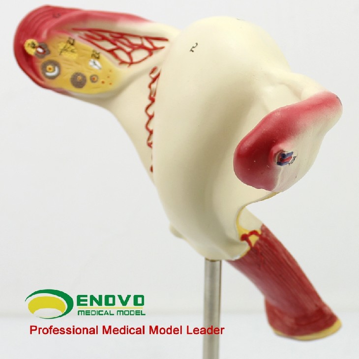 该模型显示子宫三层结构,子宫腔阴道示穹隆,左侧示卵巢、输卵管各部和子宫阔韧带的关系,右侧卵巢剖面示黄体、卵泡、子宫血管及子宫圆韧带等。专业的设计了数字指示标识