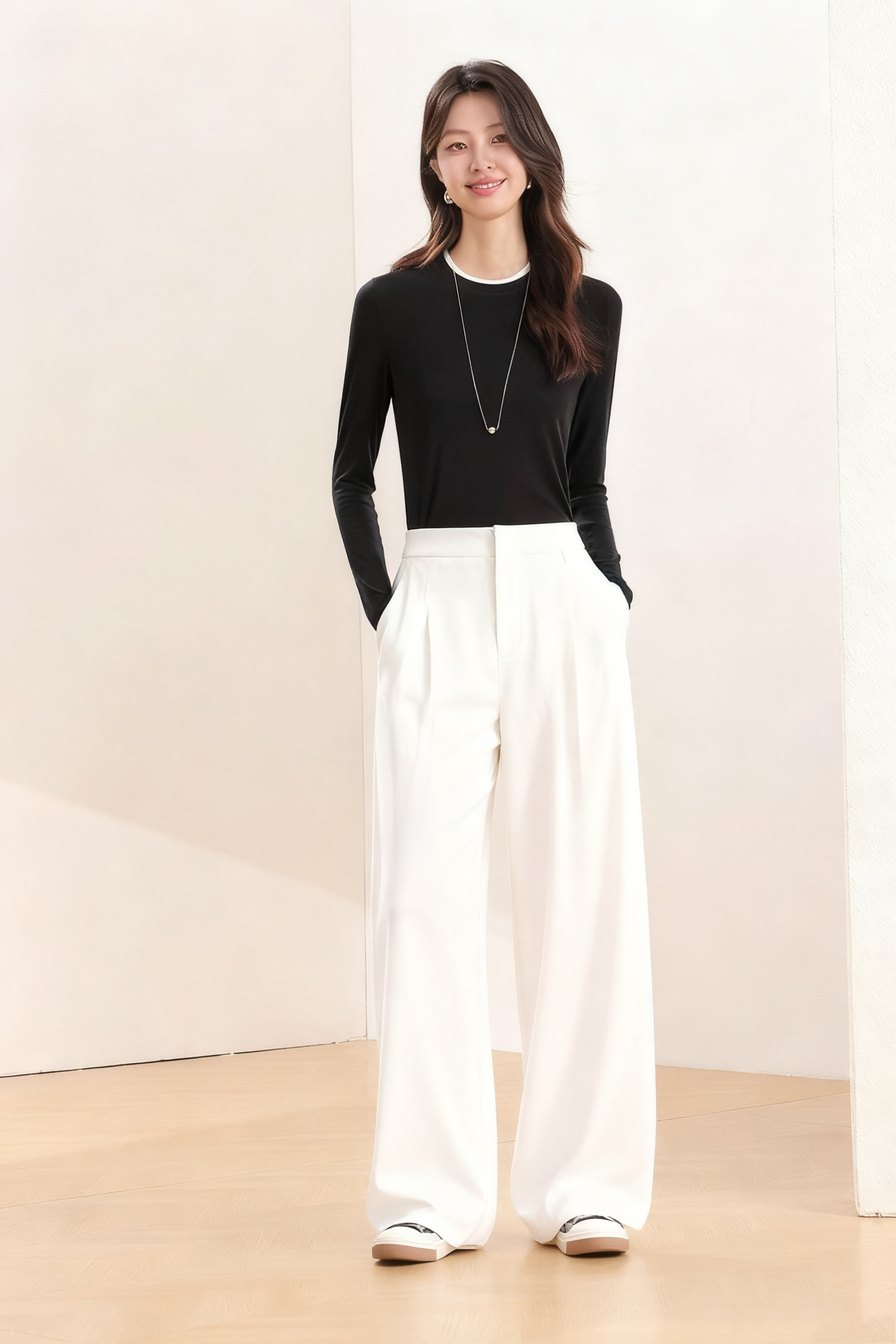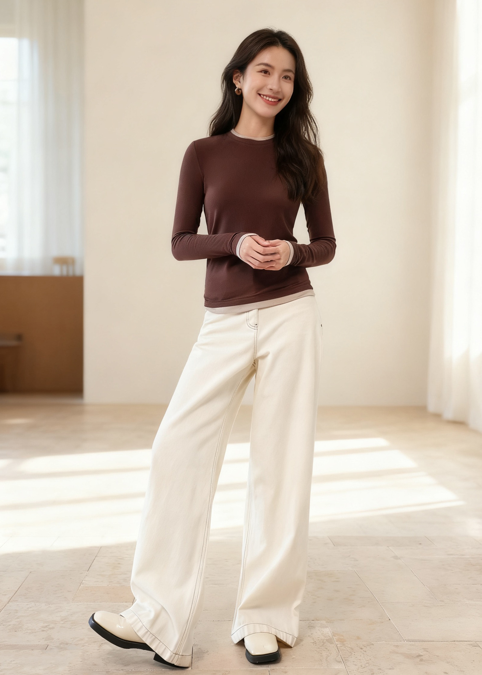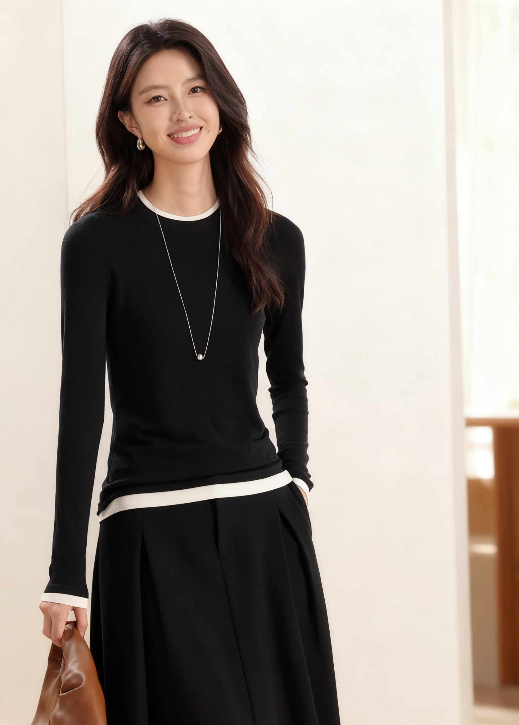 臣禾 【撞色小衫】薄丝光羊毛拼色打底衫套头针织衫 JZ253052075