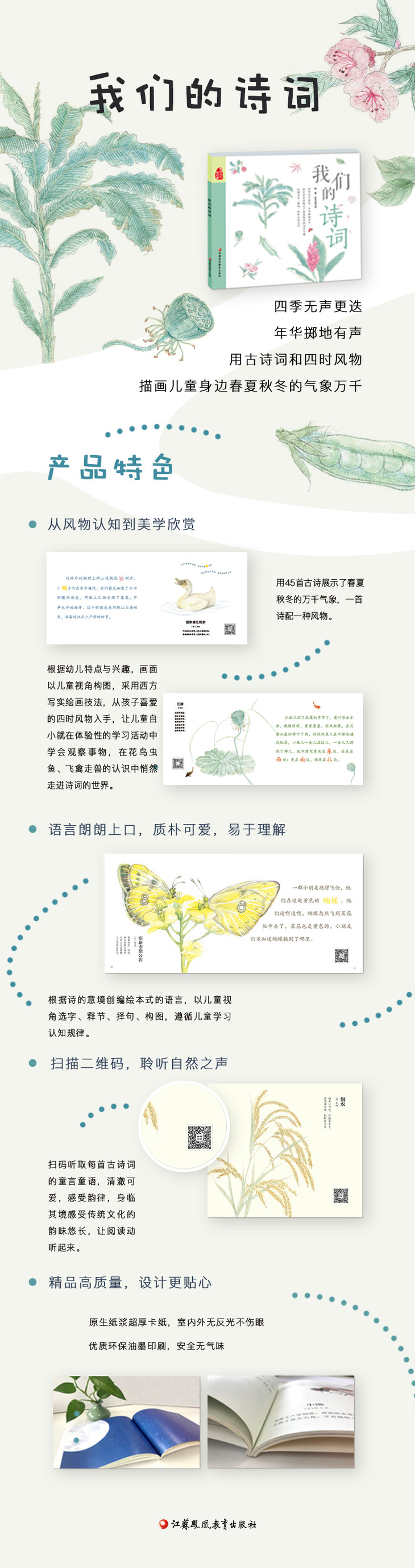 由45首中国古典诗词和45种四时风物组成,一首诗配一种风物;画面以儿童视角构图,根据诗的意境创编绘本式的语言,展现了儿童身边的春夏秋冬和四时美好,让幼儿在花鸟虫鱼、飞禽走兽中悄然走进诗词的世界,不知不觉中接受中国优秀传统文化的熏染。
