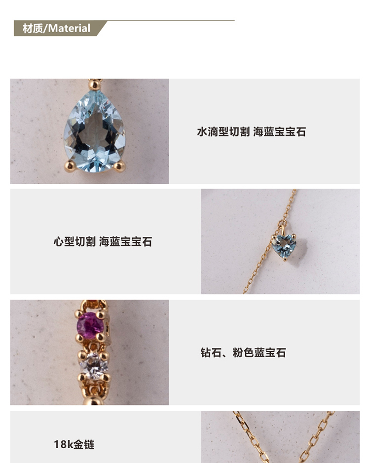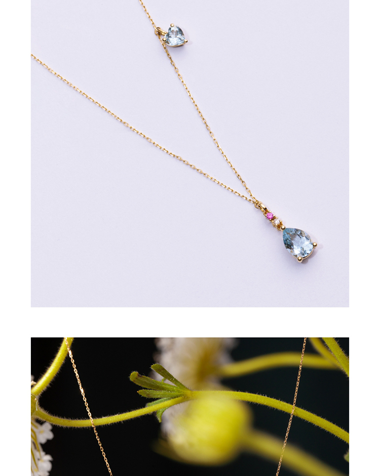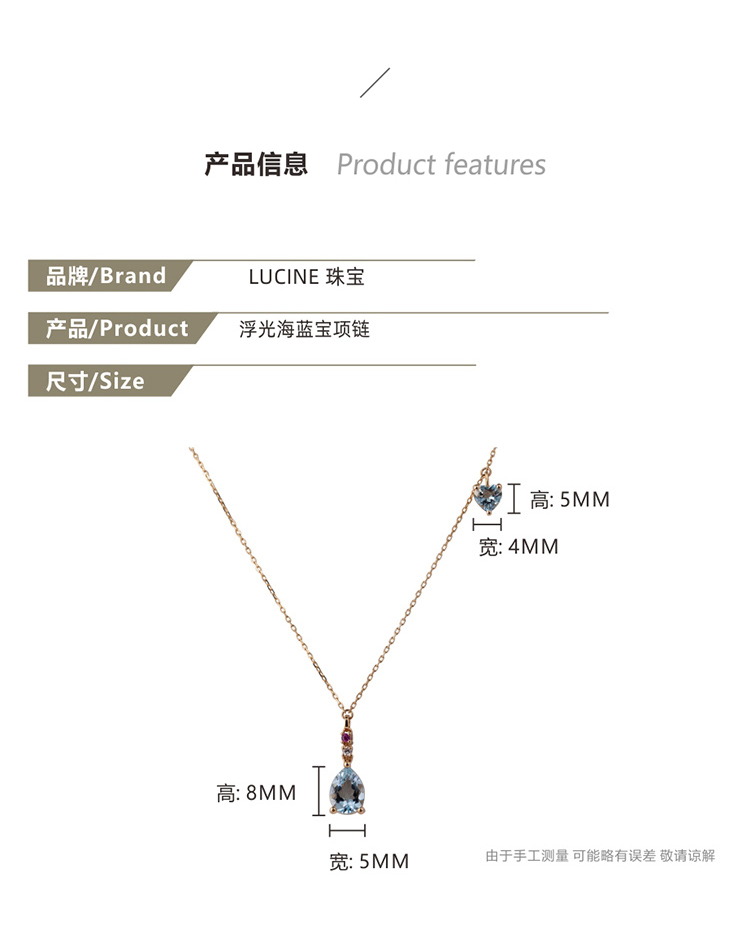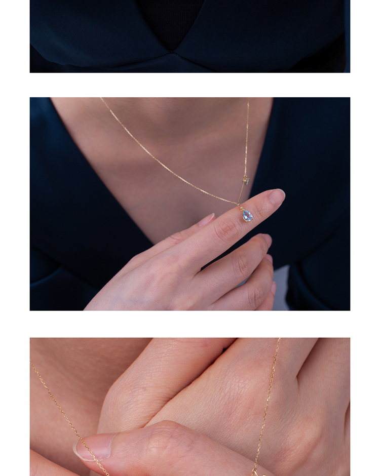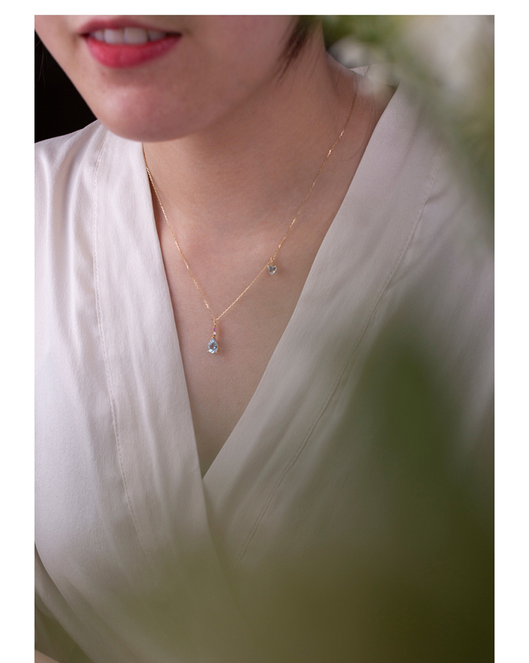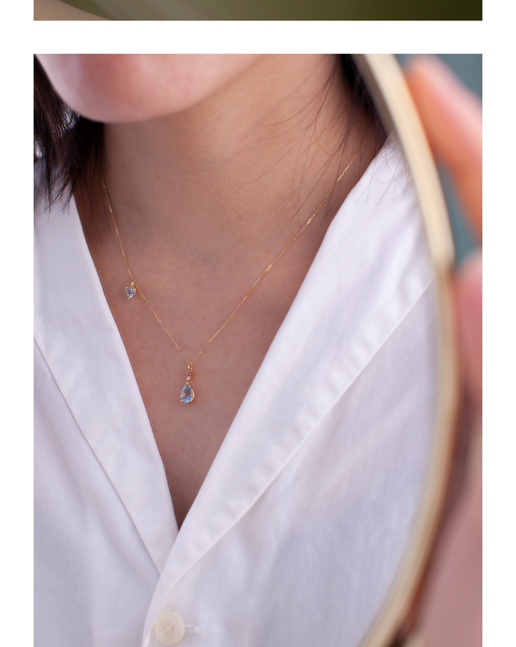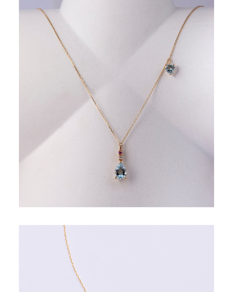 LUCINE 18k金天然海蓝宝石女项链镶钻吊坠生辰可调节日本彩宝细链
