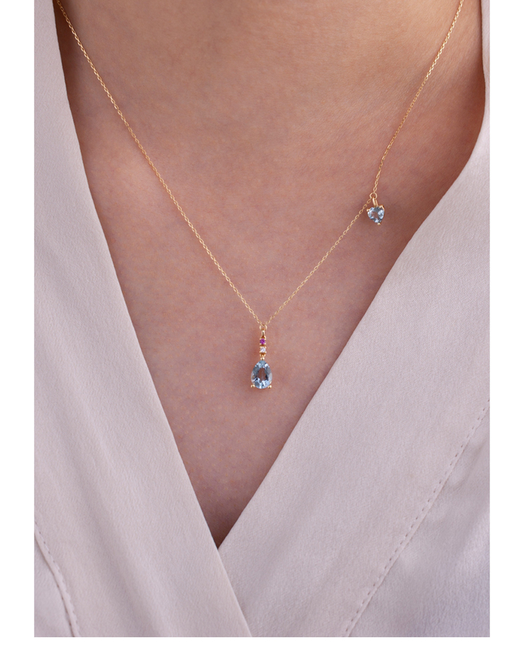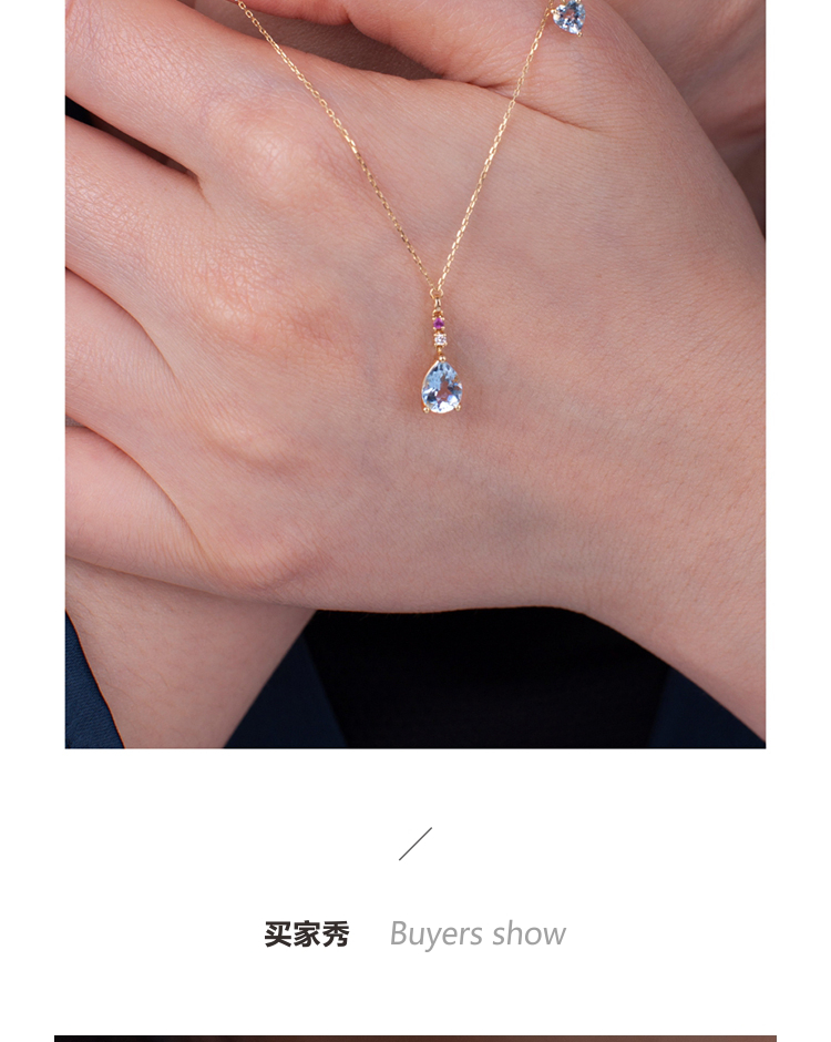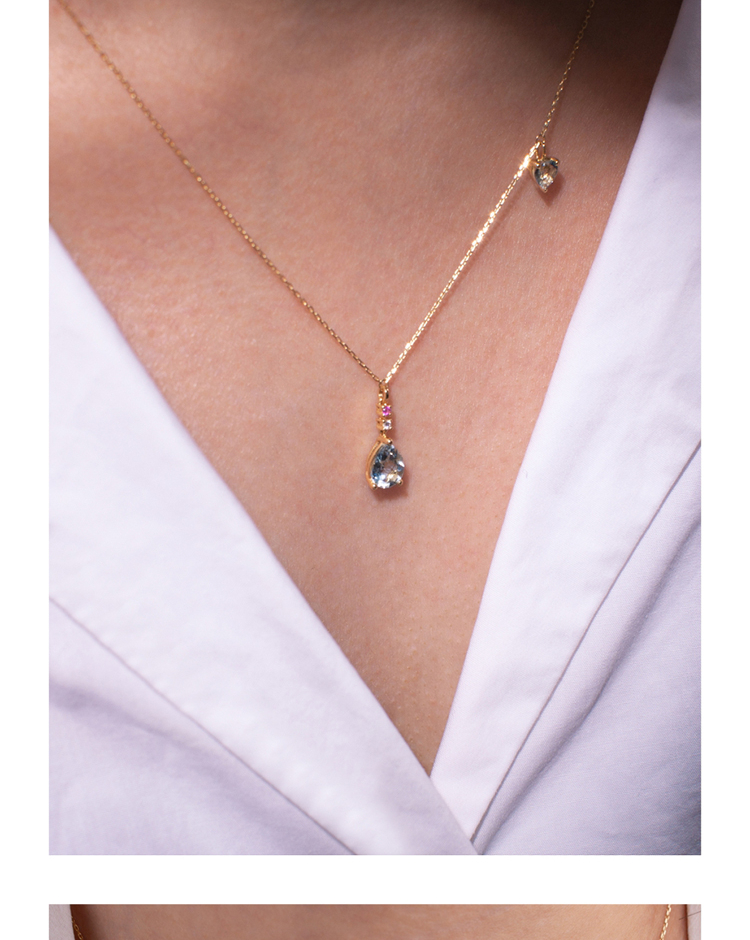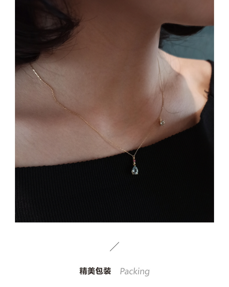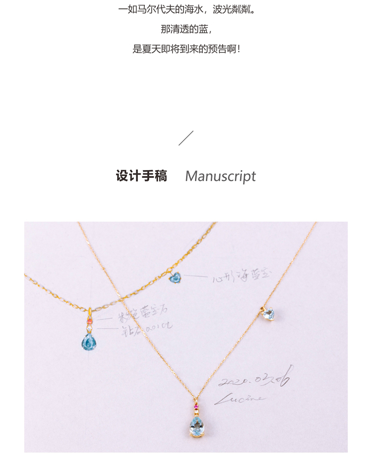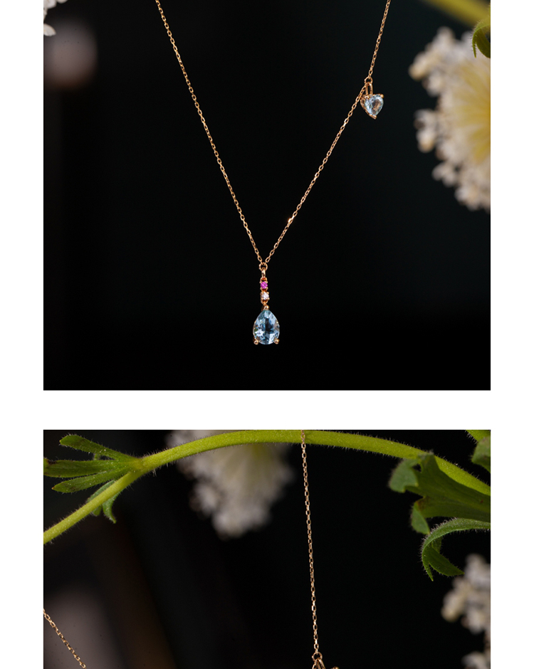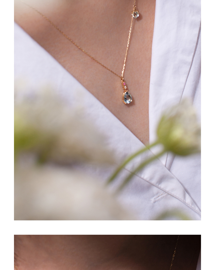 LUCINE 18k金天然海蓝宝石女项链镶钻吊坠生辰可调节日本彩宝细链