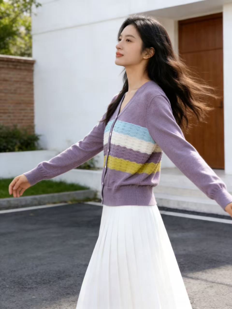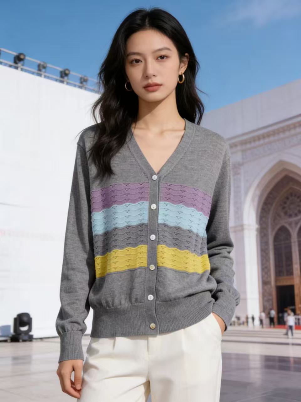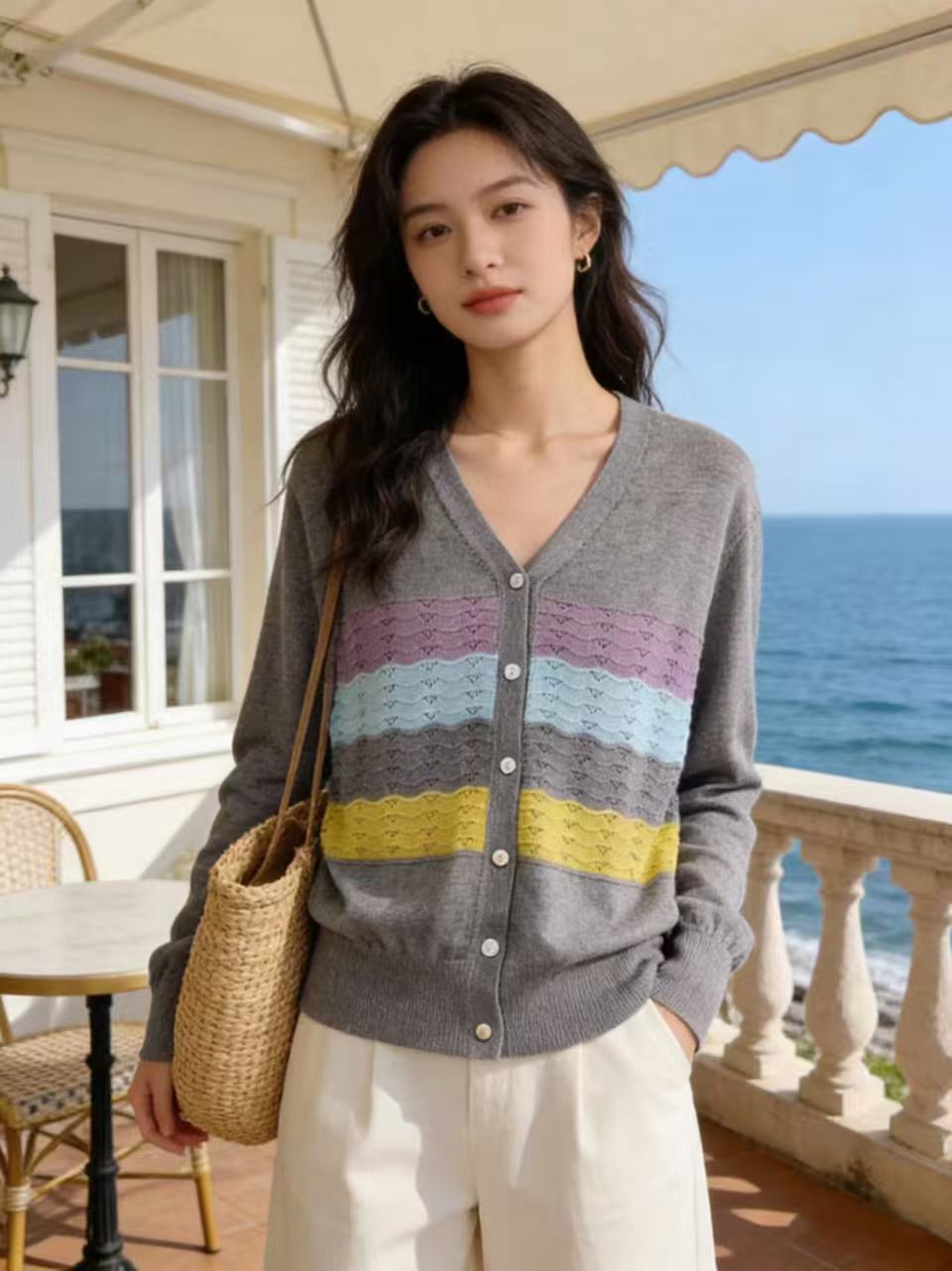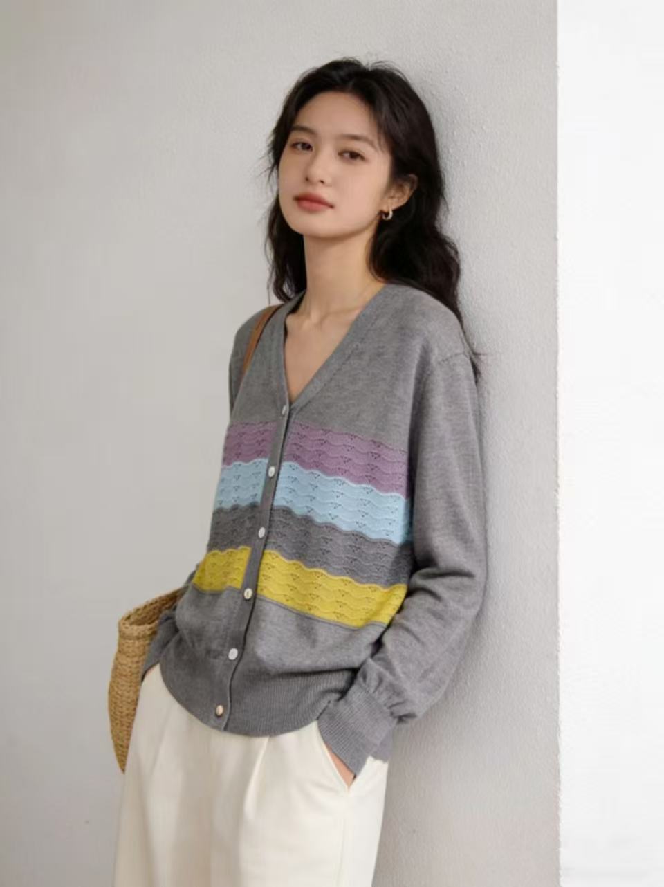 享8折优惠|五一大促羊毛衫!春薄款!品牌促➡️【自营】衣周期格亿(30%羊毛)8554 V领彩色条花纱拼色羊毛开衫-喜出