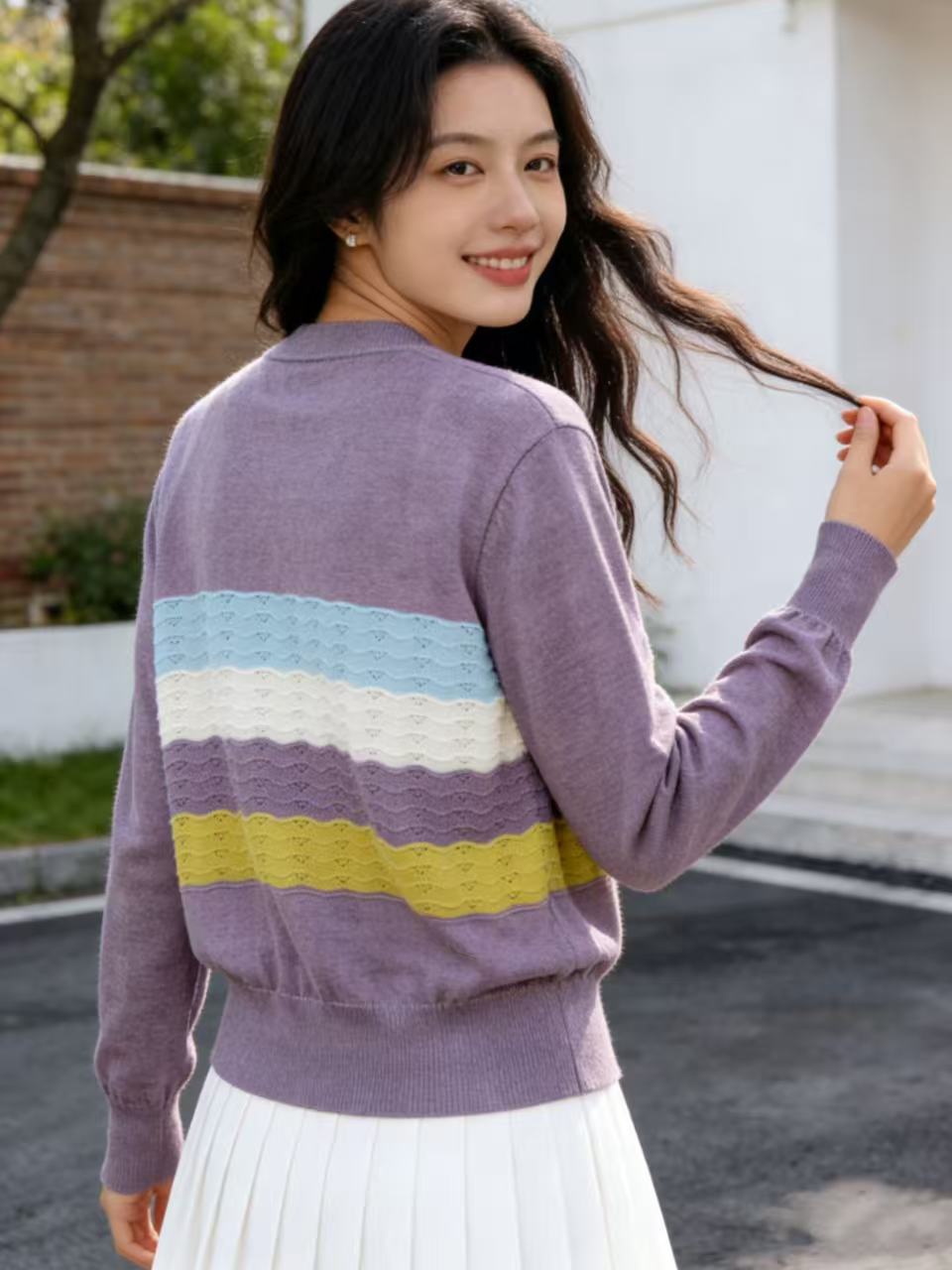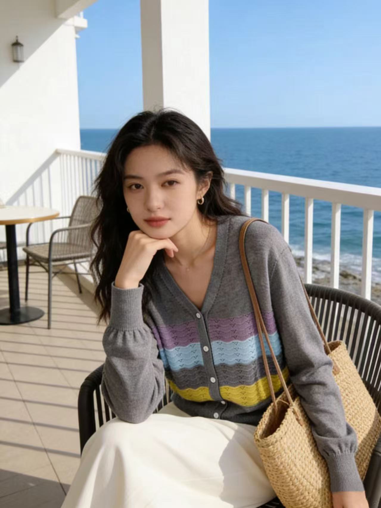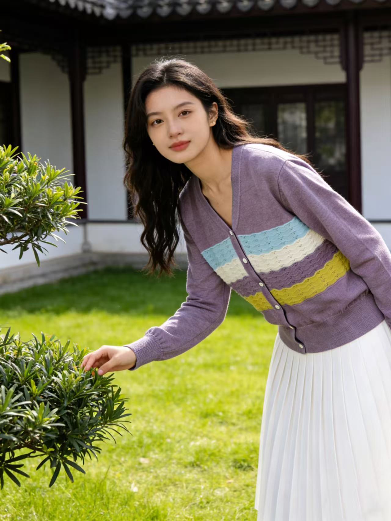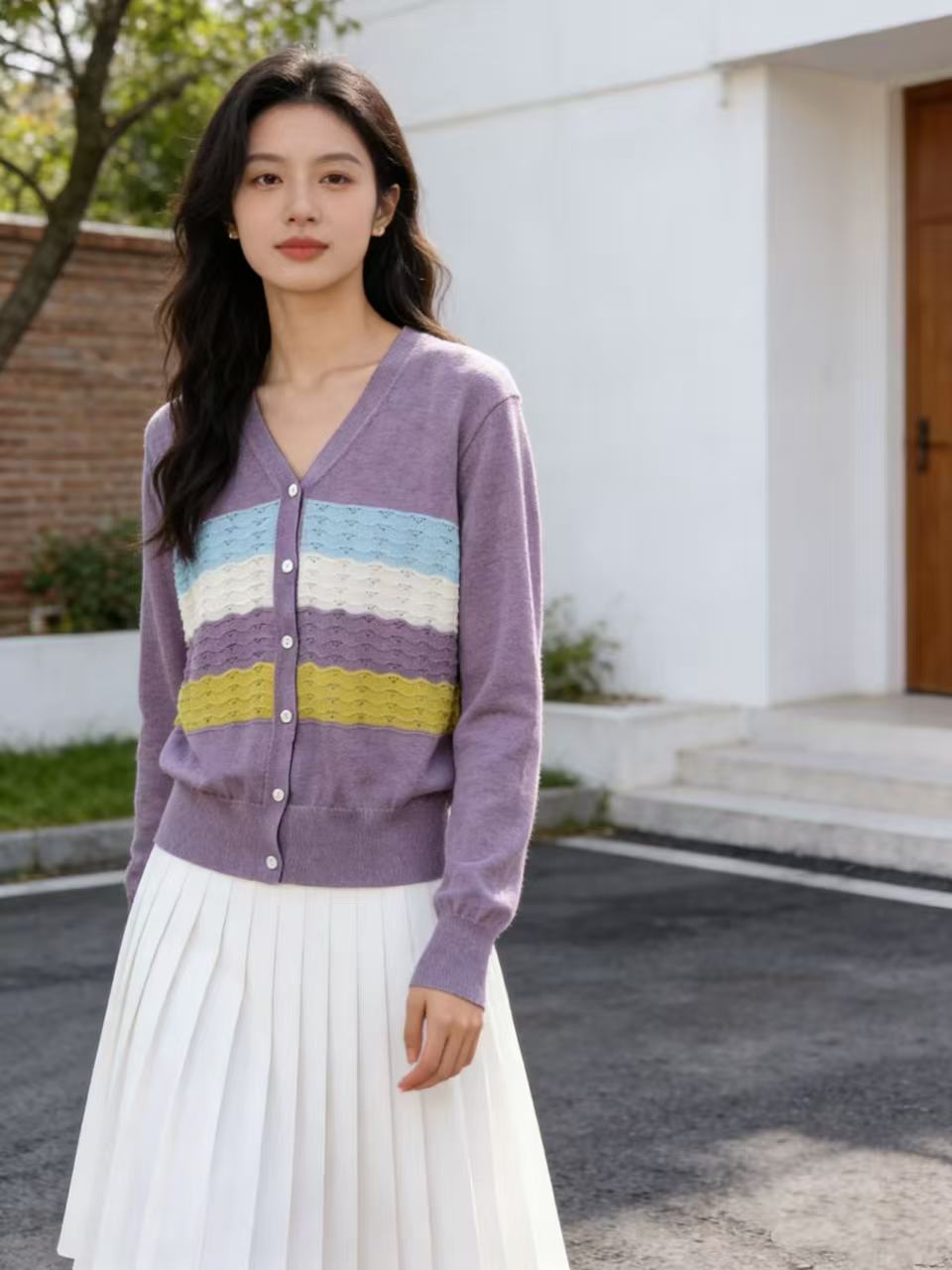 享8折优惠|五一大促羊毛衫!春薄款!品牌促➡️【自营】衣周期格亿(30%羊毛)8554 V领彩色条花纱拼色羊毛开衫-喜出