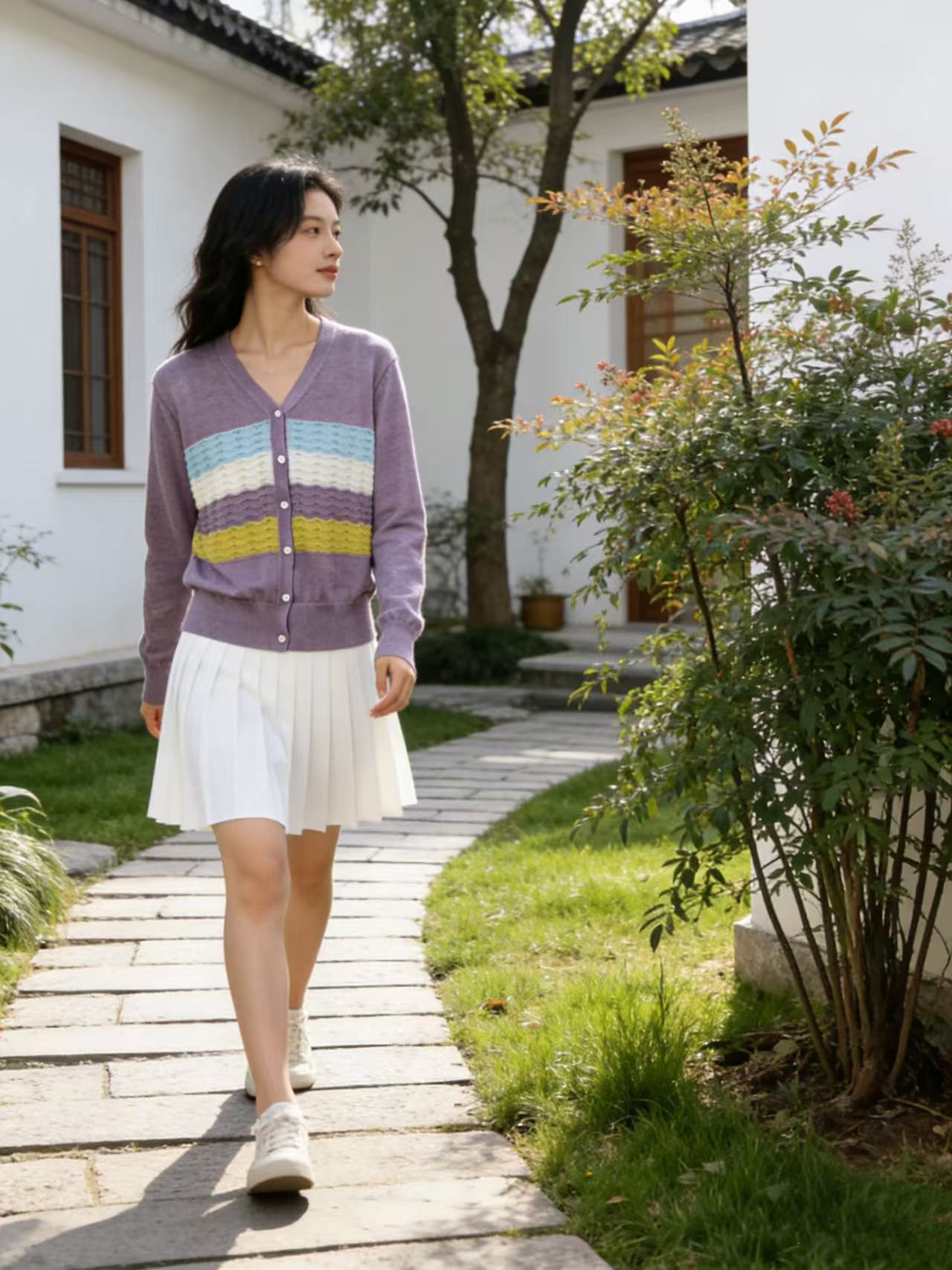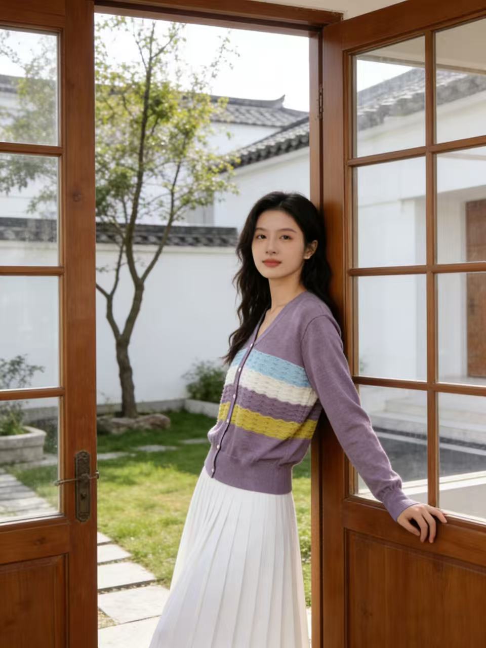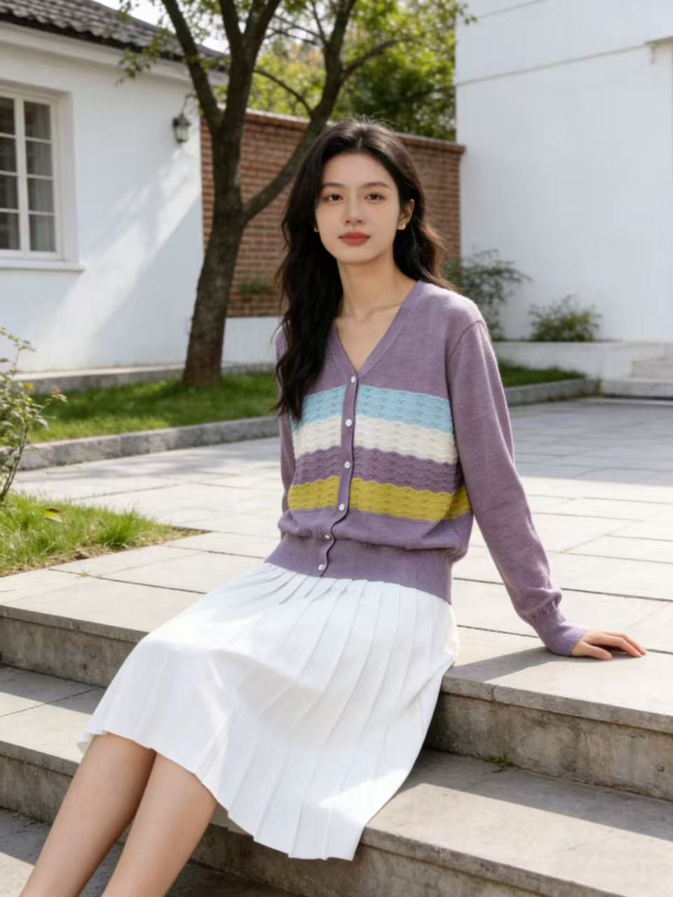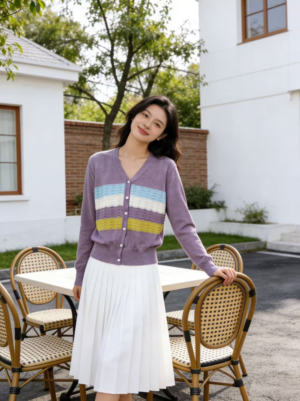 享8折优惠|五一大促羊毛衫!春薄款!品牌促➡️【自营】衣周期格亿(30%羊毛)8554 V领彩色条花纱拼色羊毛开衫-喜出