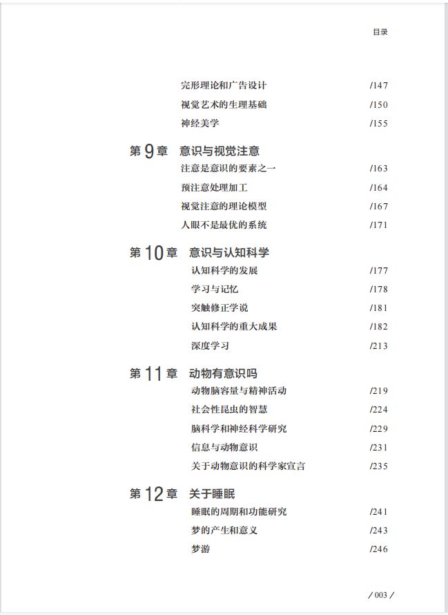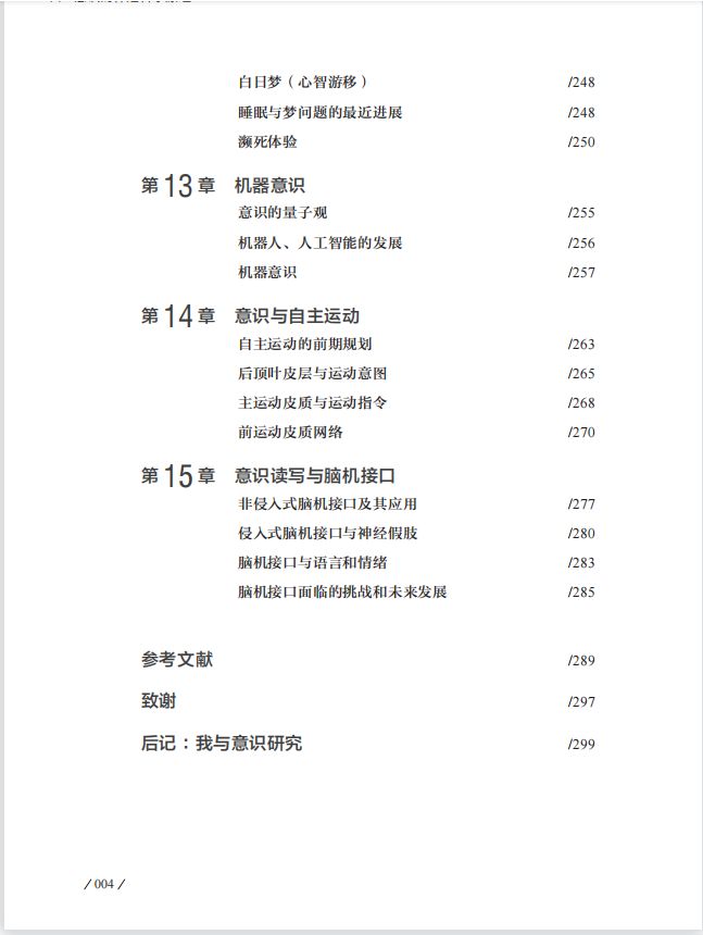 本书主要从意识的现有研究进展入手,共分为15章,介绍意识的科学问题研究的进展。第1~4章主要阐述意识的概念、意识与大脑的关系、意识的理论框架以及发展现状;第5~10章主要阐述意识问题与神经计算科学、与视觉、认知科学等的内在联系;第11~12章则着重阐述意识与人的睡眠和梦境的内在联系;第13章介绍机器意识的一些研究进展;第14~15章主要介绍当代意识研究的重要热点和方向,包括意识与自主运动控制以及意识读写与脑机接
