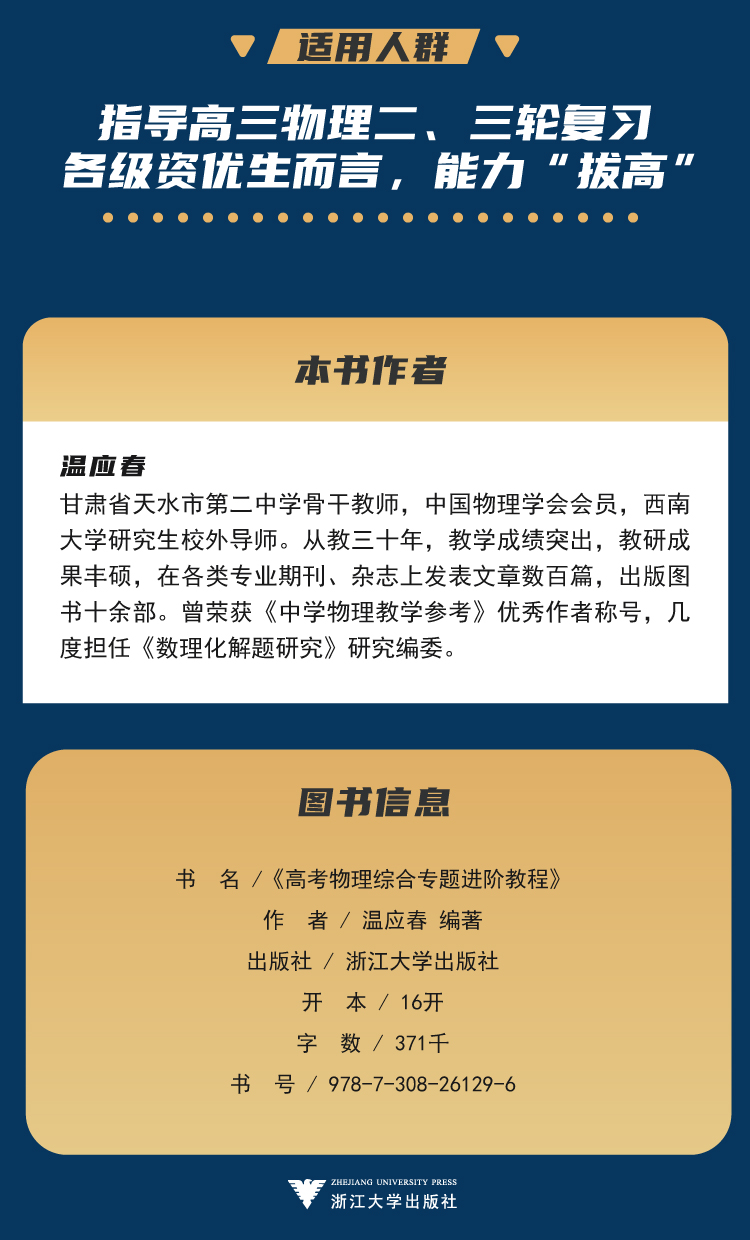温应春,甘肃省天水市第二中学骨干教师,中国物理学会会员,西南大学研究生校外导师。从教三十年,教学成绩突出,教研成果丰硕,在各类专业期刊、杂志上发表文章数百篇,出版图书十余部。曾荣获《中学物理教学参考》优秀作者称号,几度担任《数理化解题研究》研究编委。