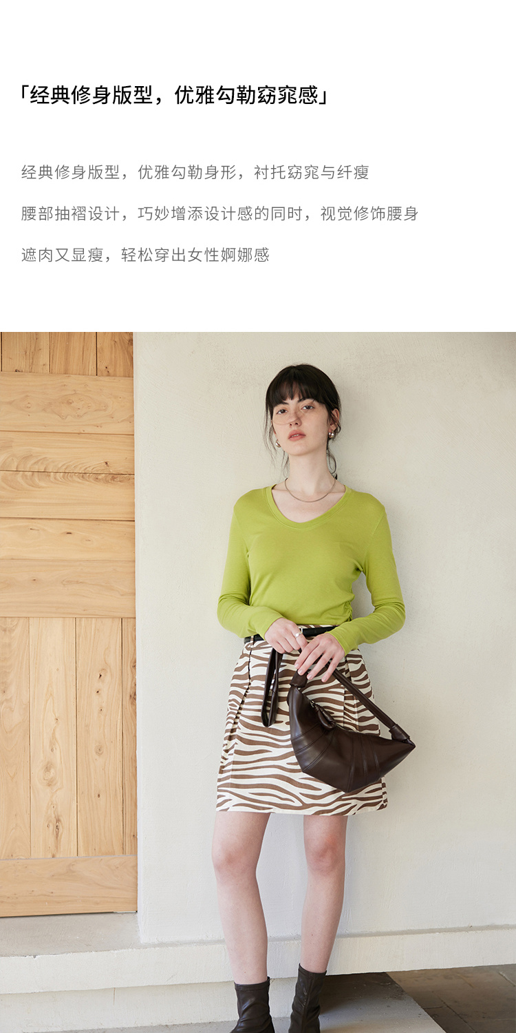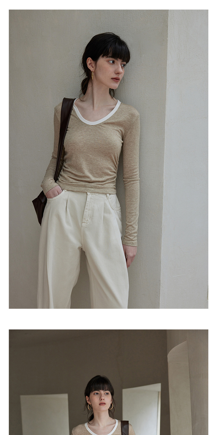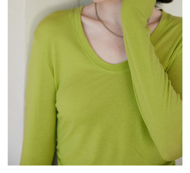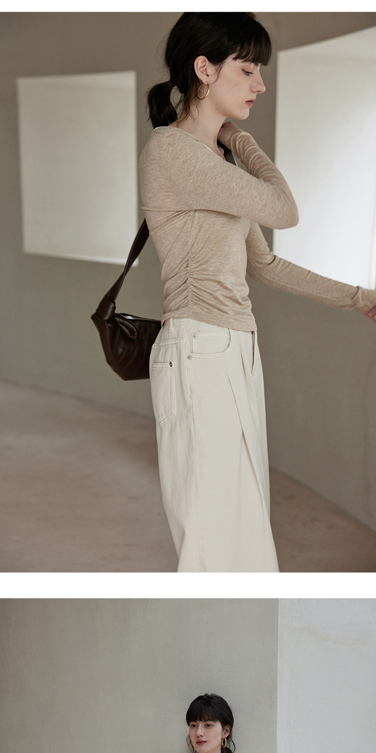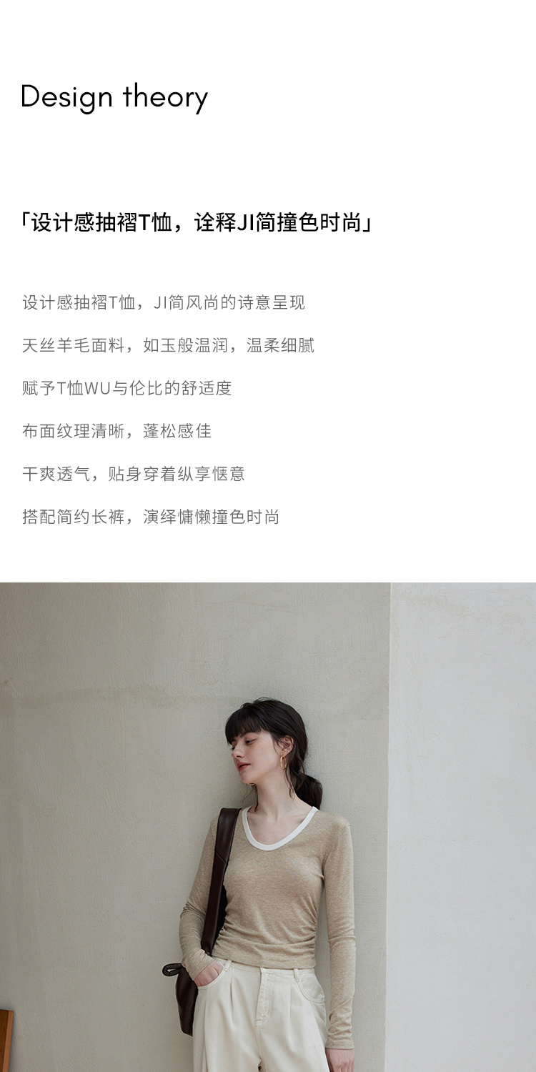 HeyDress天丝羊毛T恤女春季修身长袖内搭打底衫百搭圆领抽褶上衣