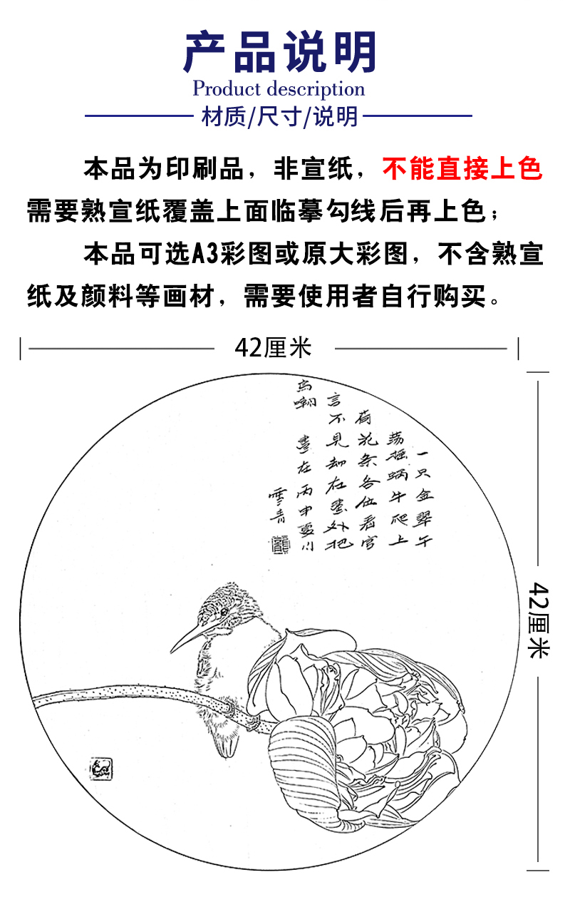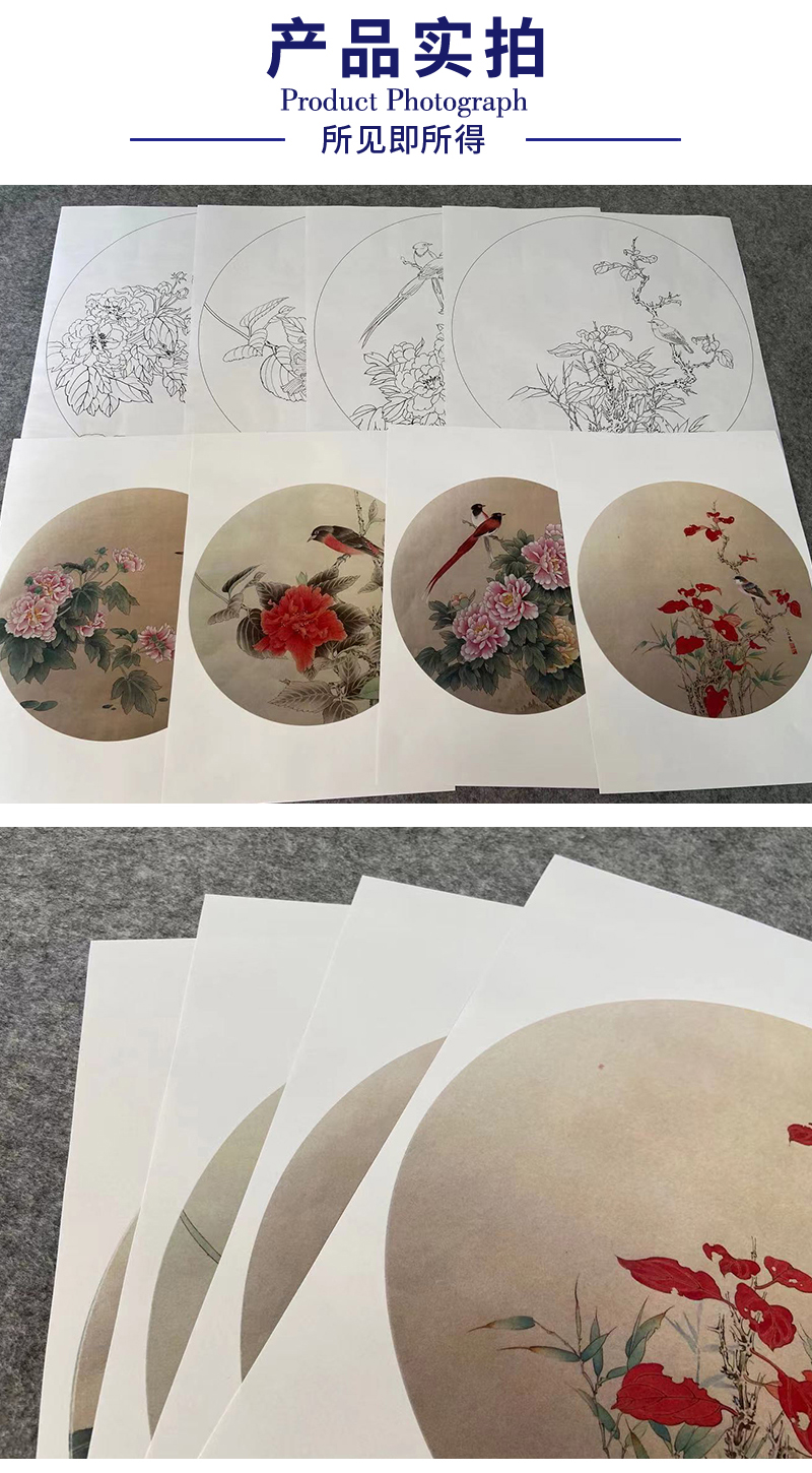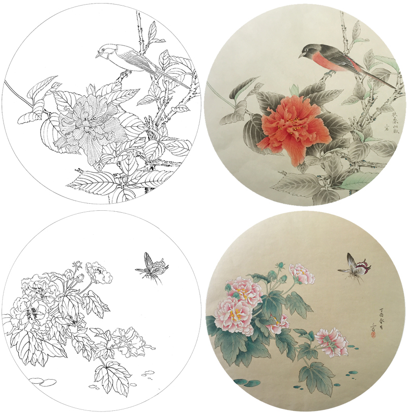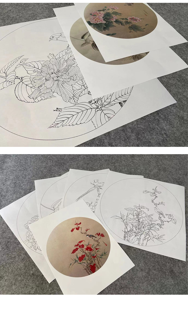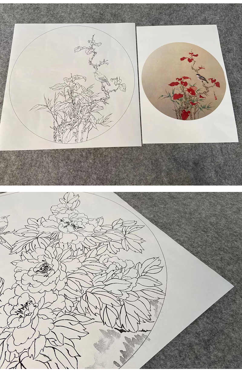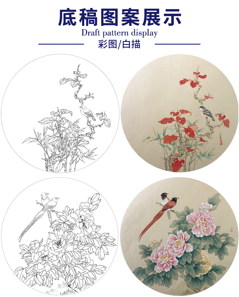 潘磊工笔画白描底稿牡丹蝴蝶一套四幅初学者尺寸42*42厘米TL04