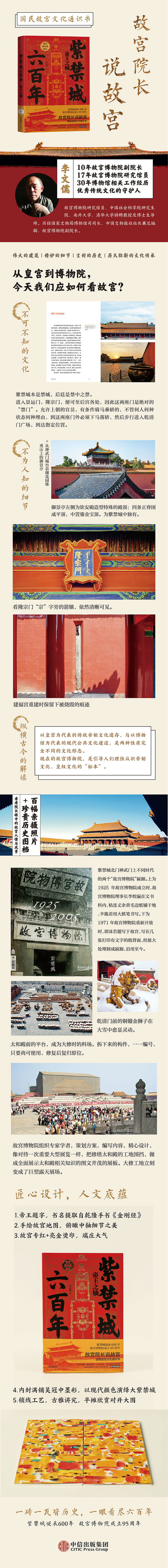 1.致敬紫禁城诞辰600年、故宫博物院成立95年!值得收藏的国民故宫文化通识书,至伟的建筑,精妙的细节,尘封的历史,历久弥新的文化传承,交织六百年时光,用深入浅出的文字娓娓道出故宫凝聚的人文精神。
