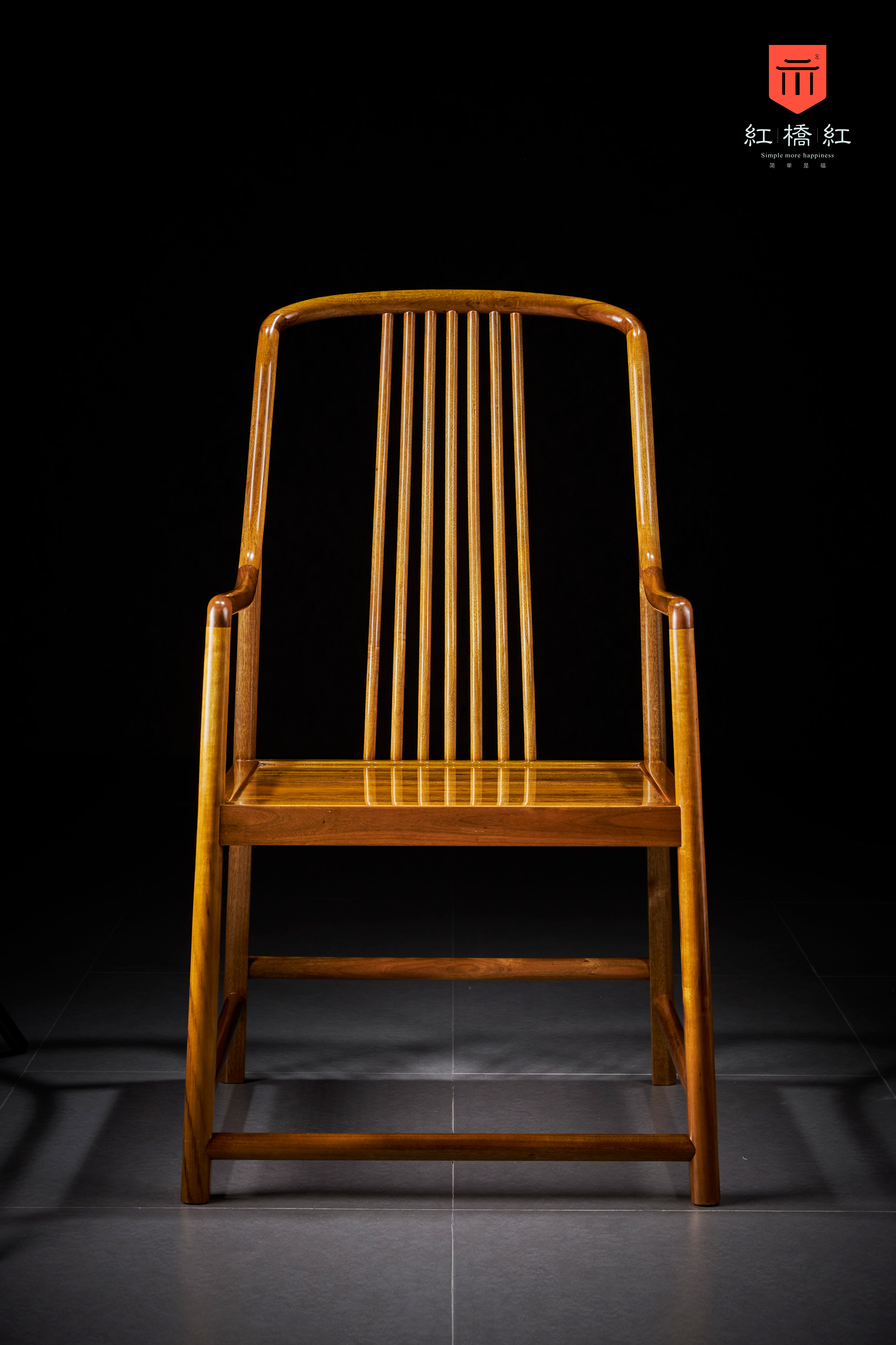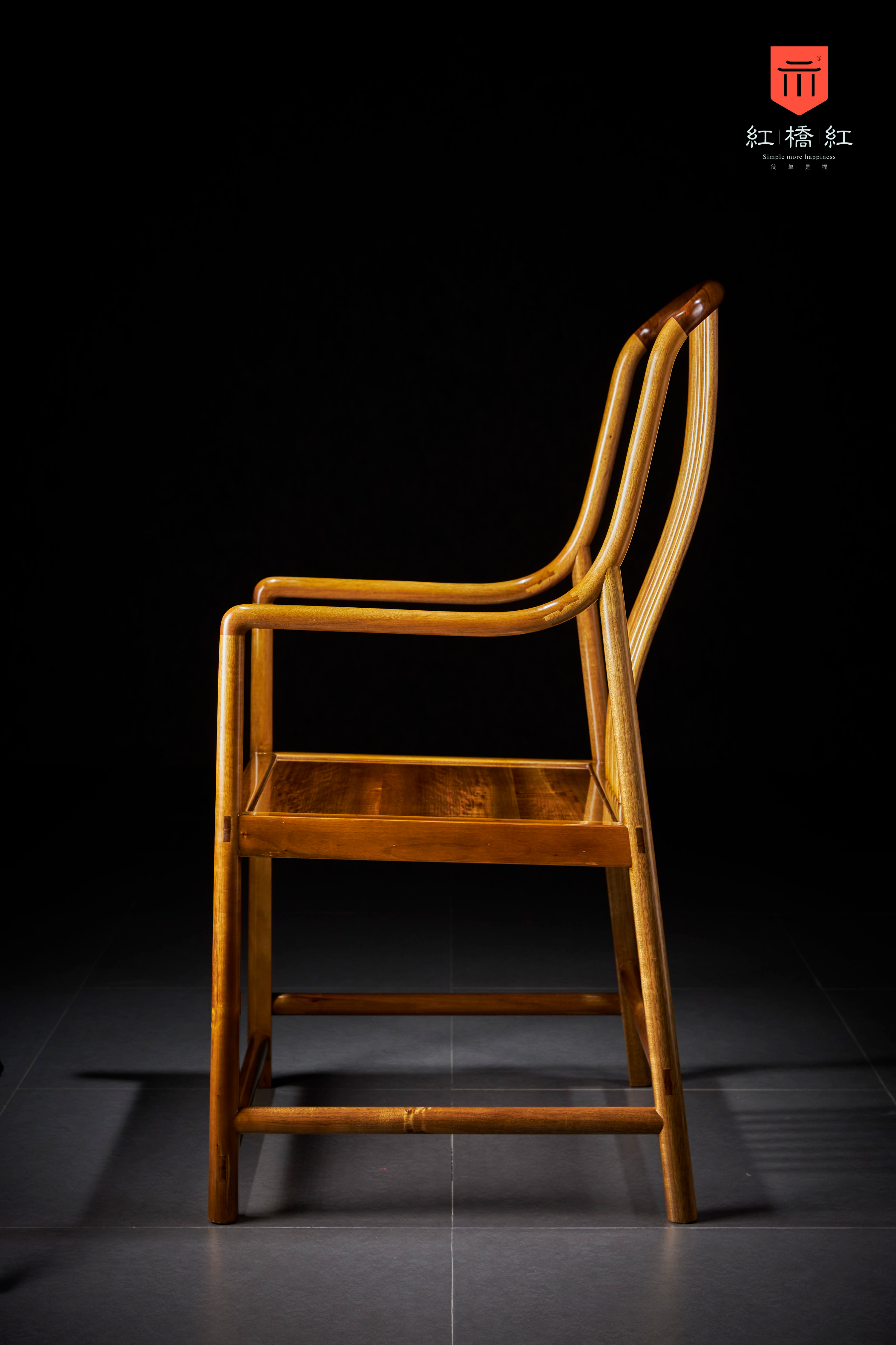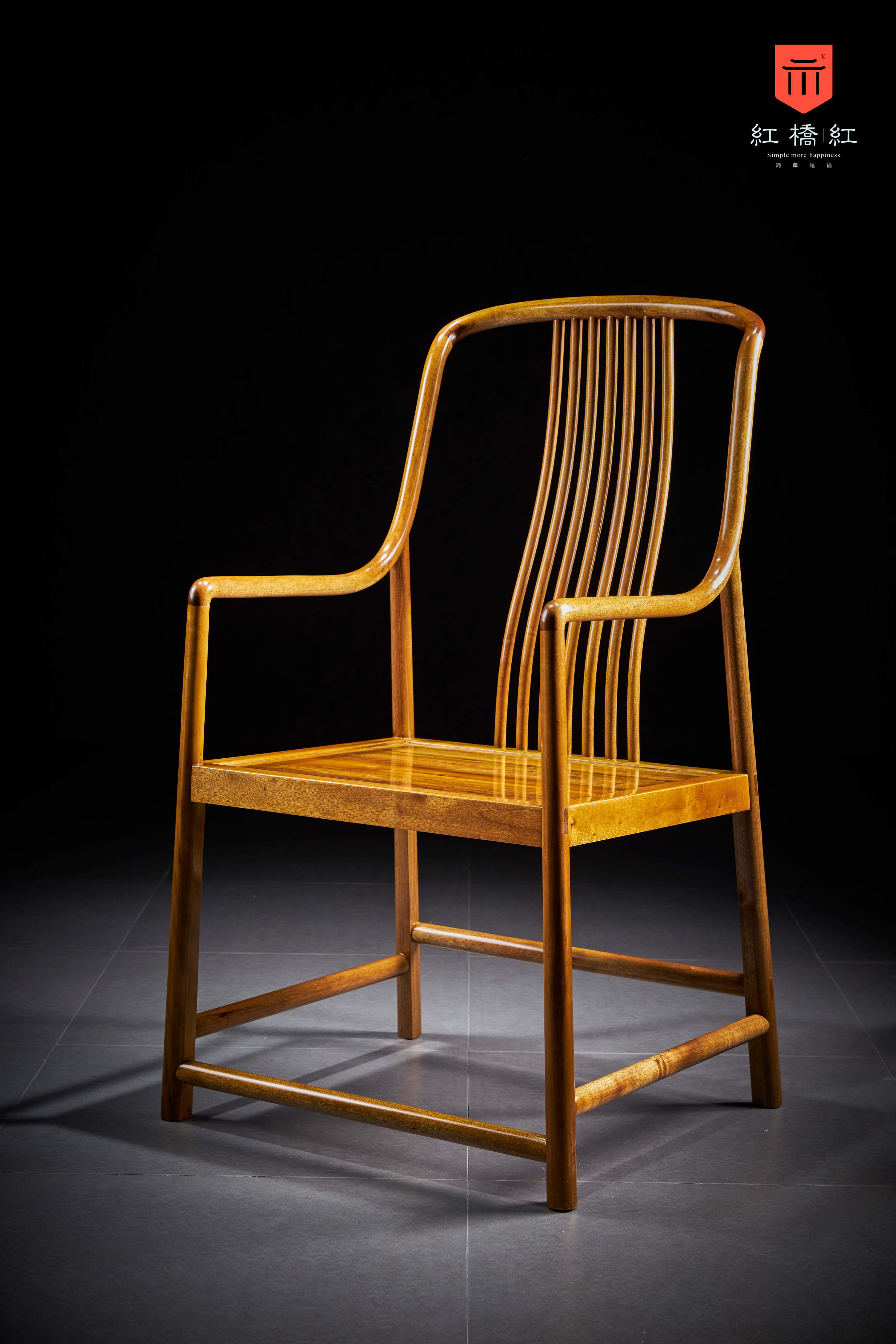 此高梳背椅,为扶手椅,风格疏朗通透,富现代气息。以金丝楠木制作,全器除座面为四面平的方材、腿足外圆里方外,通体框架采用圆材,整体方圆结合。三弯靠背采用曲棂式样,搭脑与扶手的线条柔婉,以烟袋锅榫结合。座面硬屉,四腿八挓,腿间安步步高赶枨。整器高挑,造型呈梯状,给人稳定之感。