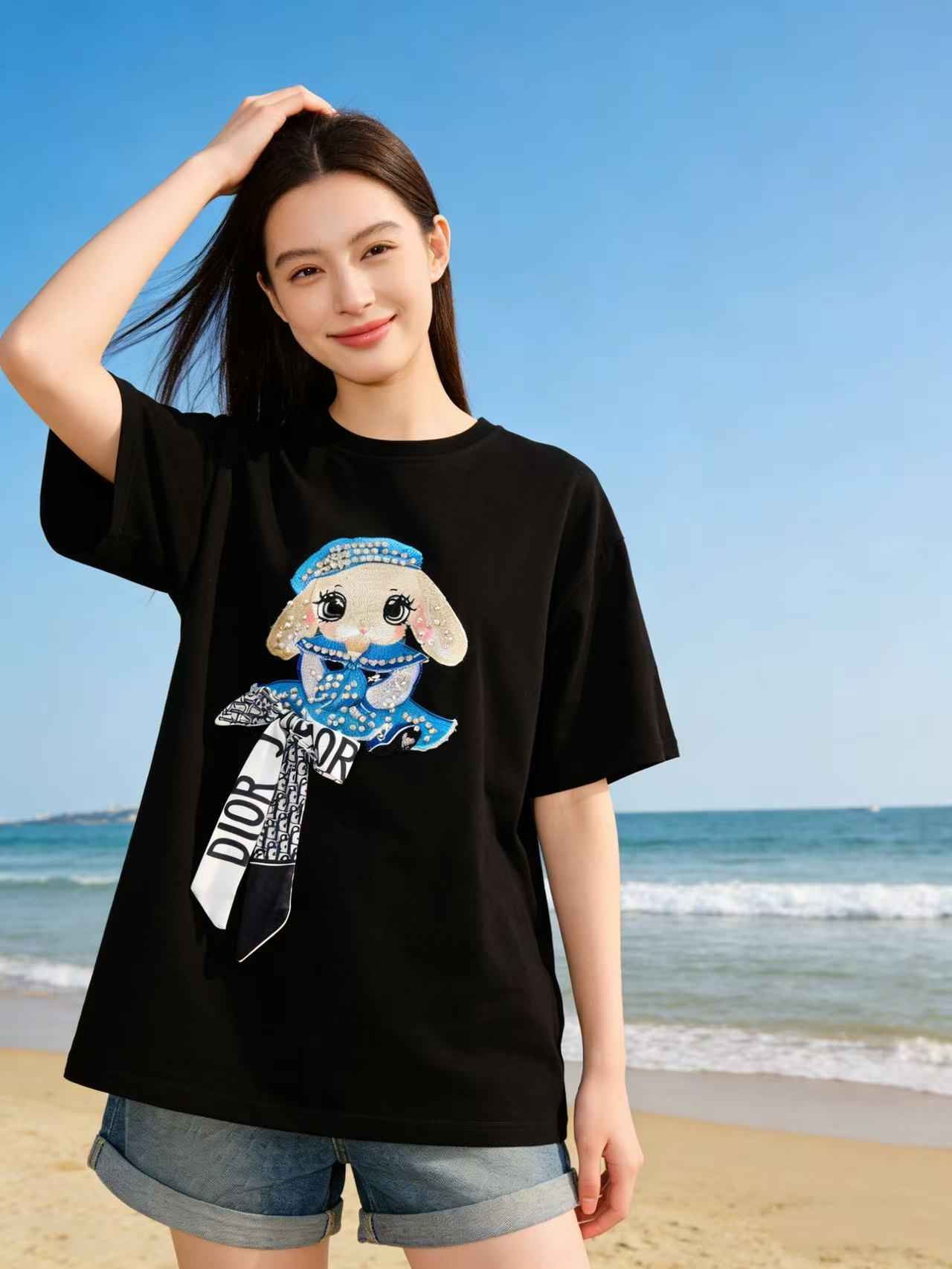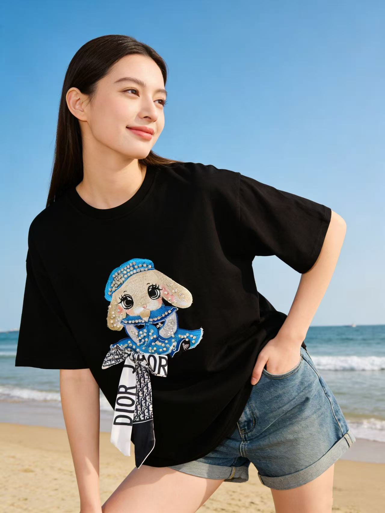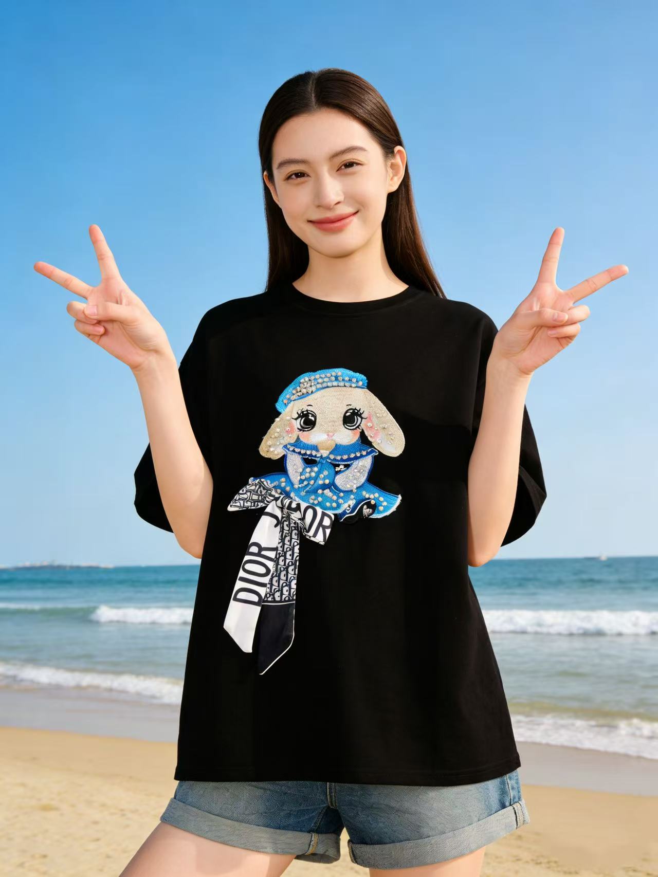 大版【自营】工艺/重工!镶钻精致兔子刺绣➕钉珠!潮牌复古宽松设计感中长短袖T恤-喜出