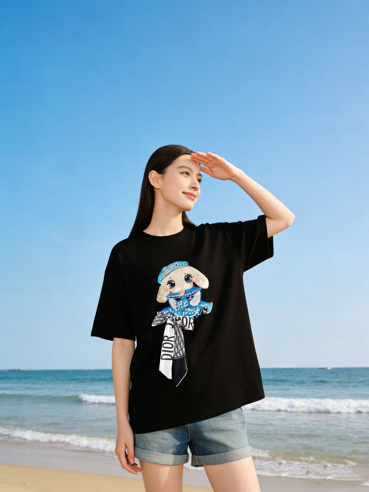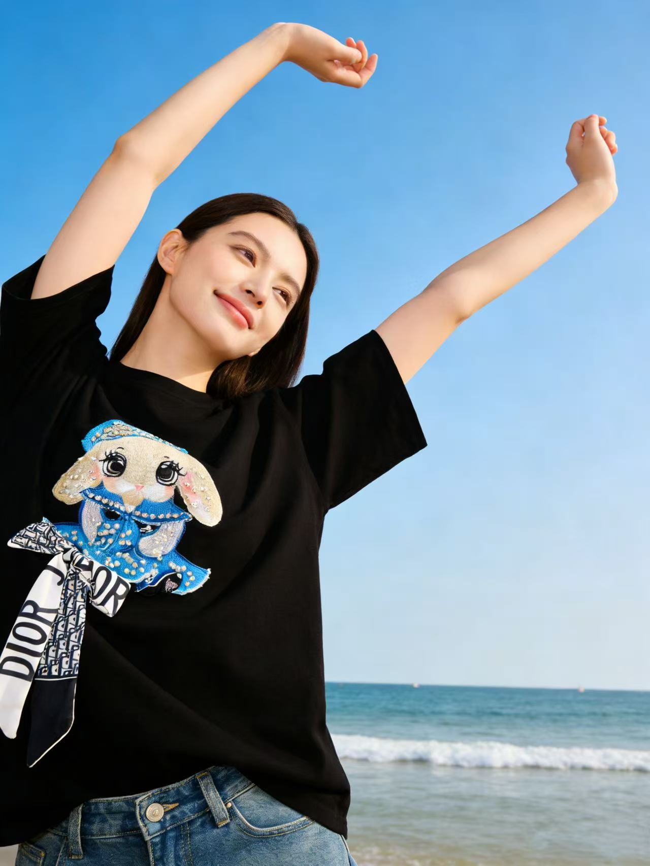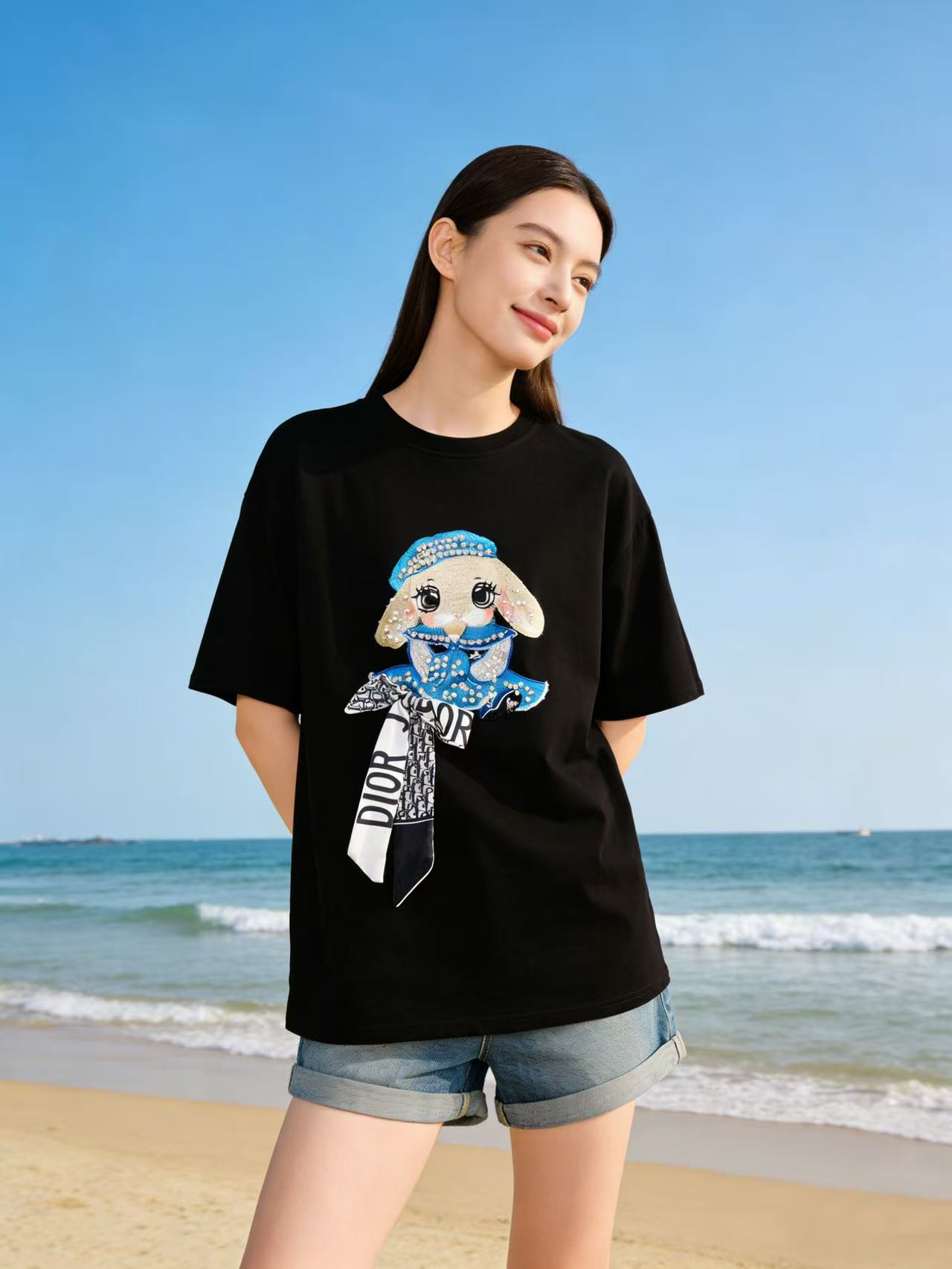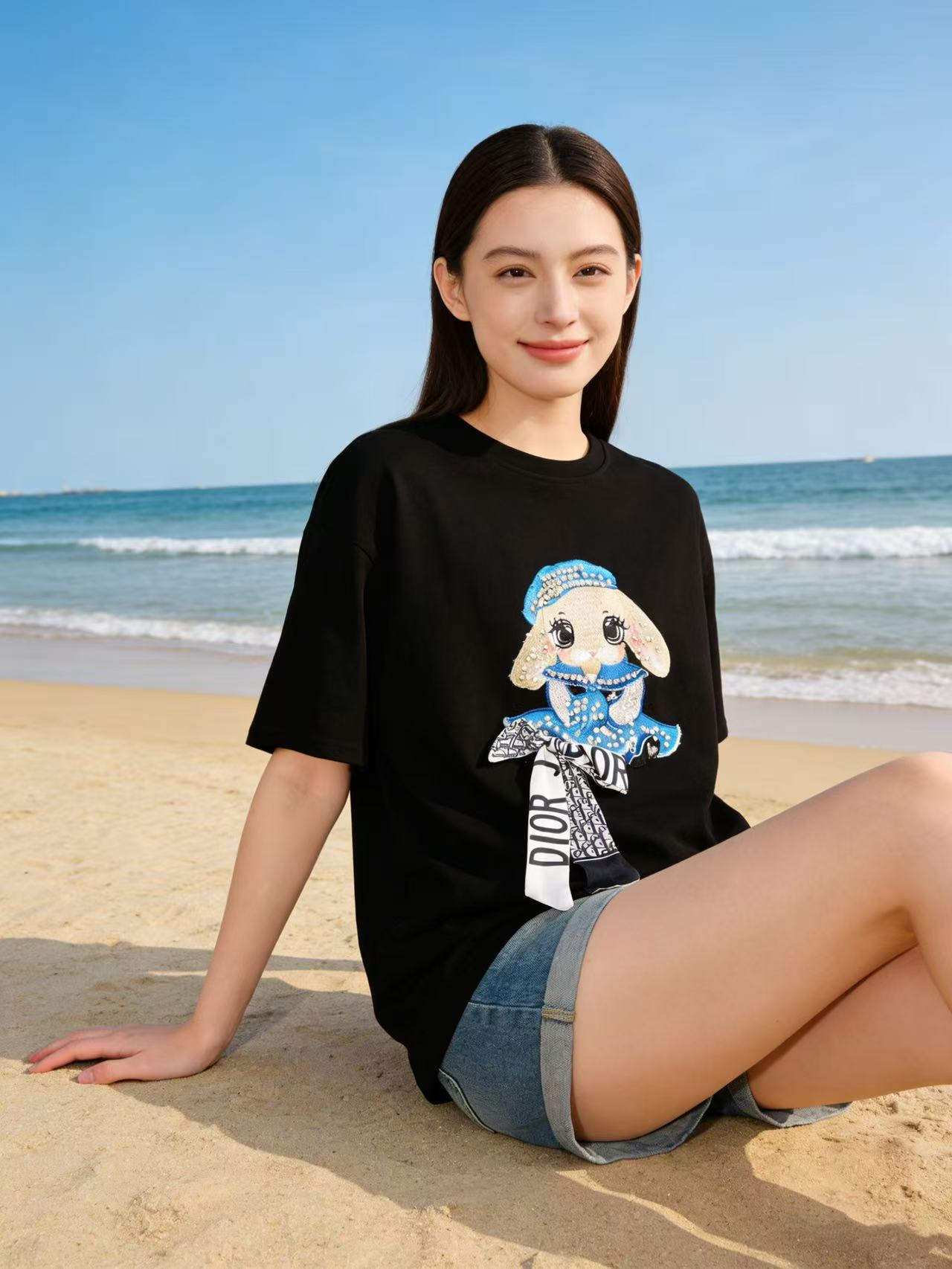 大版【自营】工艺/重工!镶钻精致兔子刺绣➕钉珠!潮牌复古宽松设计感中长短袖T恤-喜出