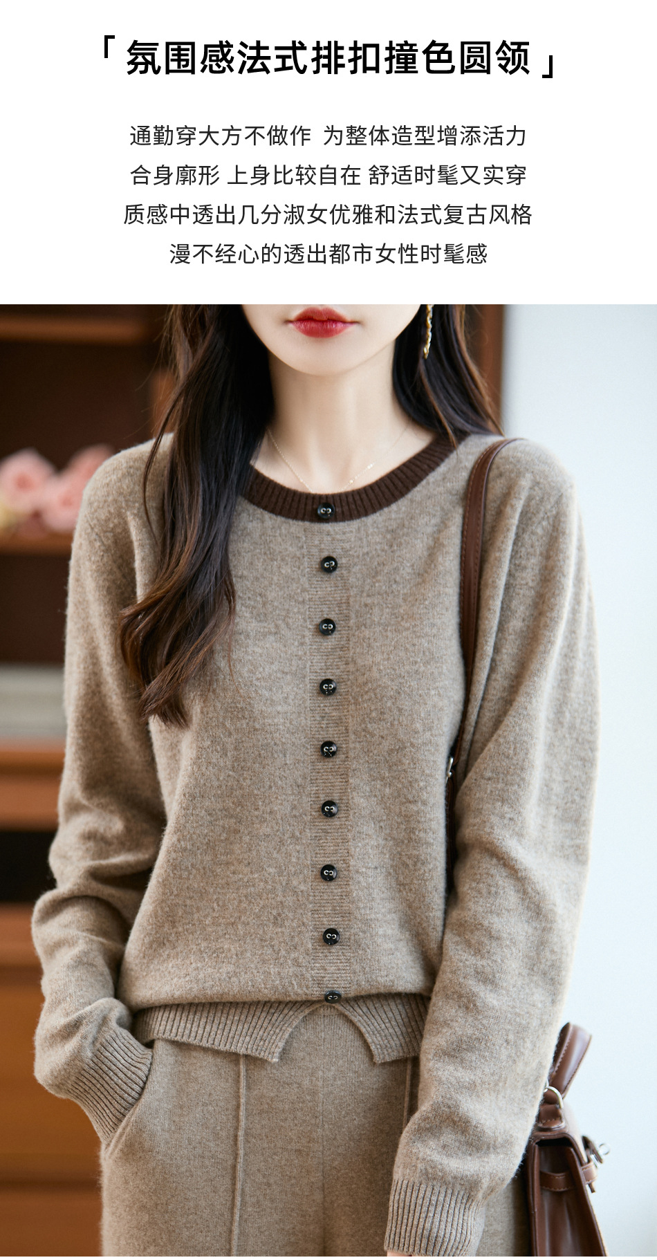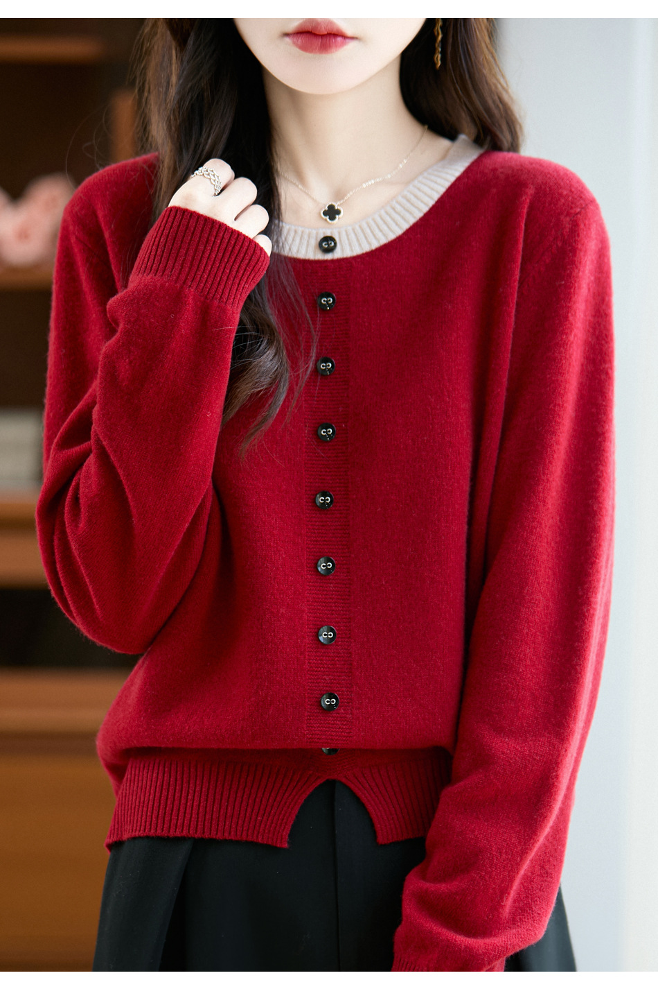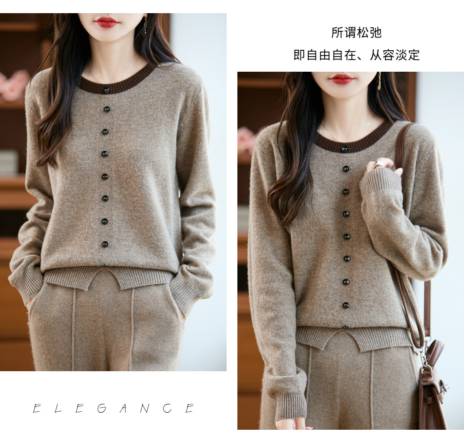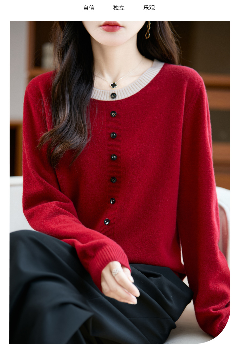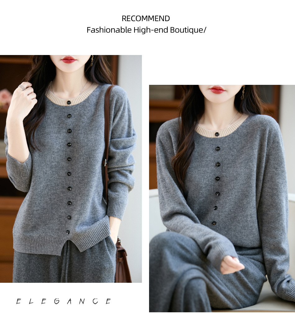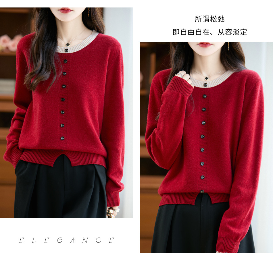 百媚生 100%羊毛圆领假两件拼色套头打底针织衫毛衣M2-452