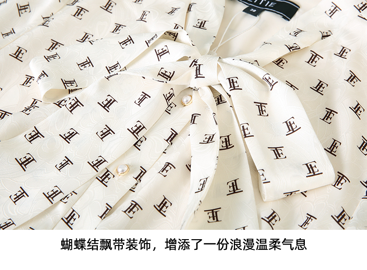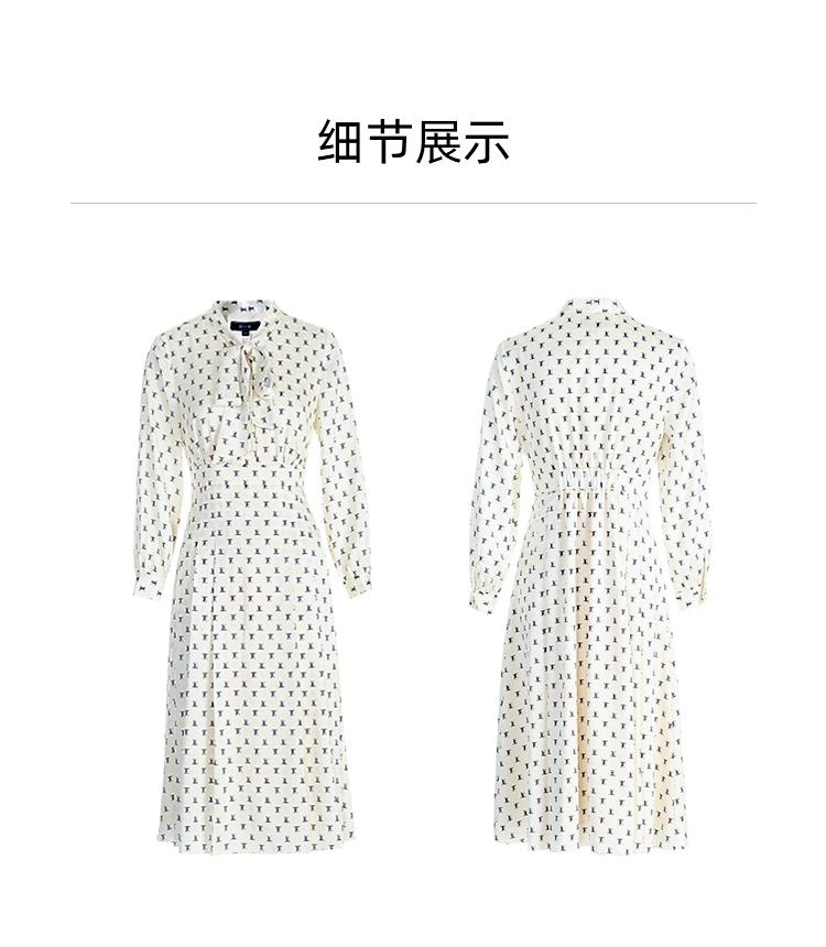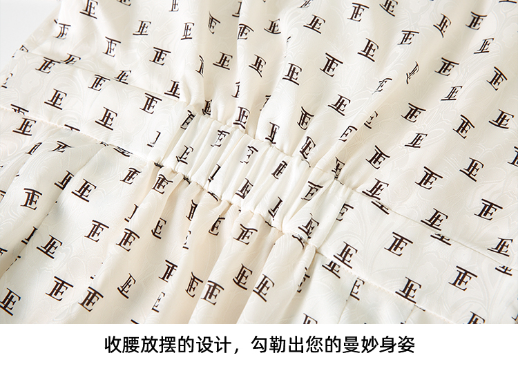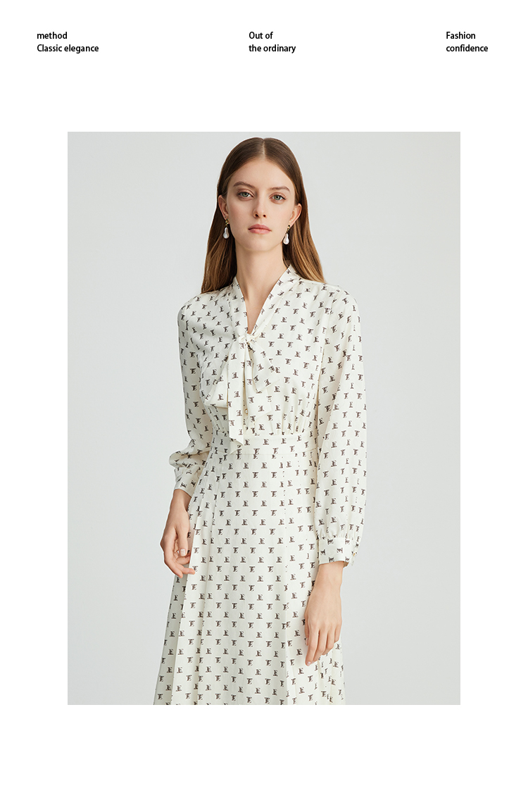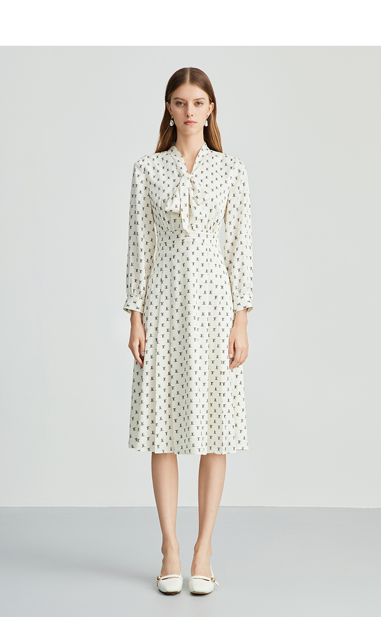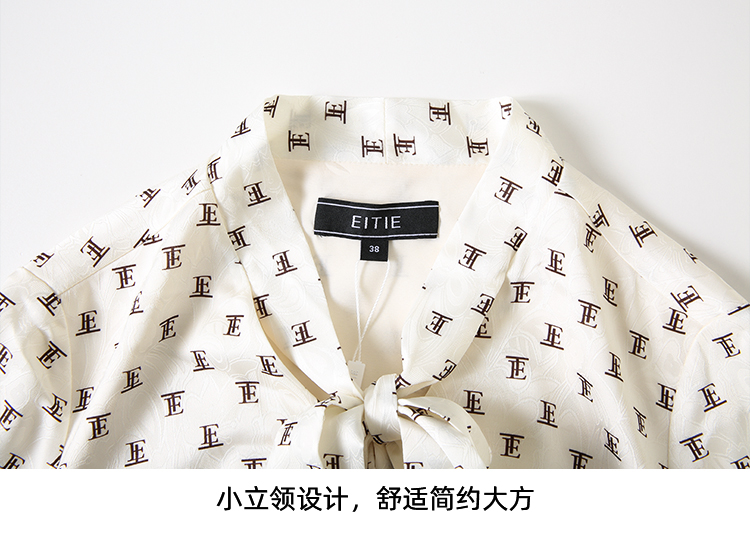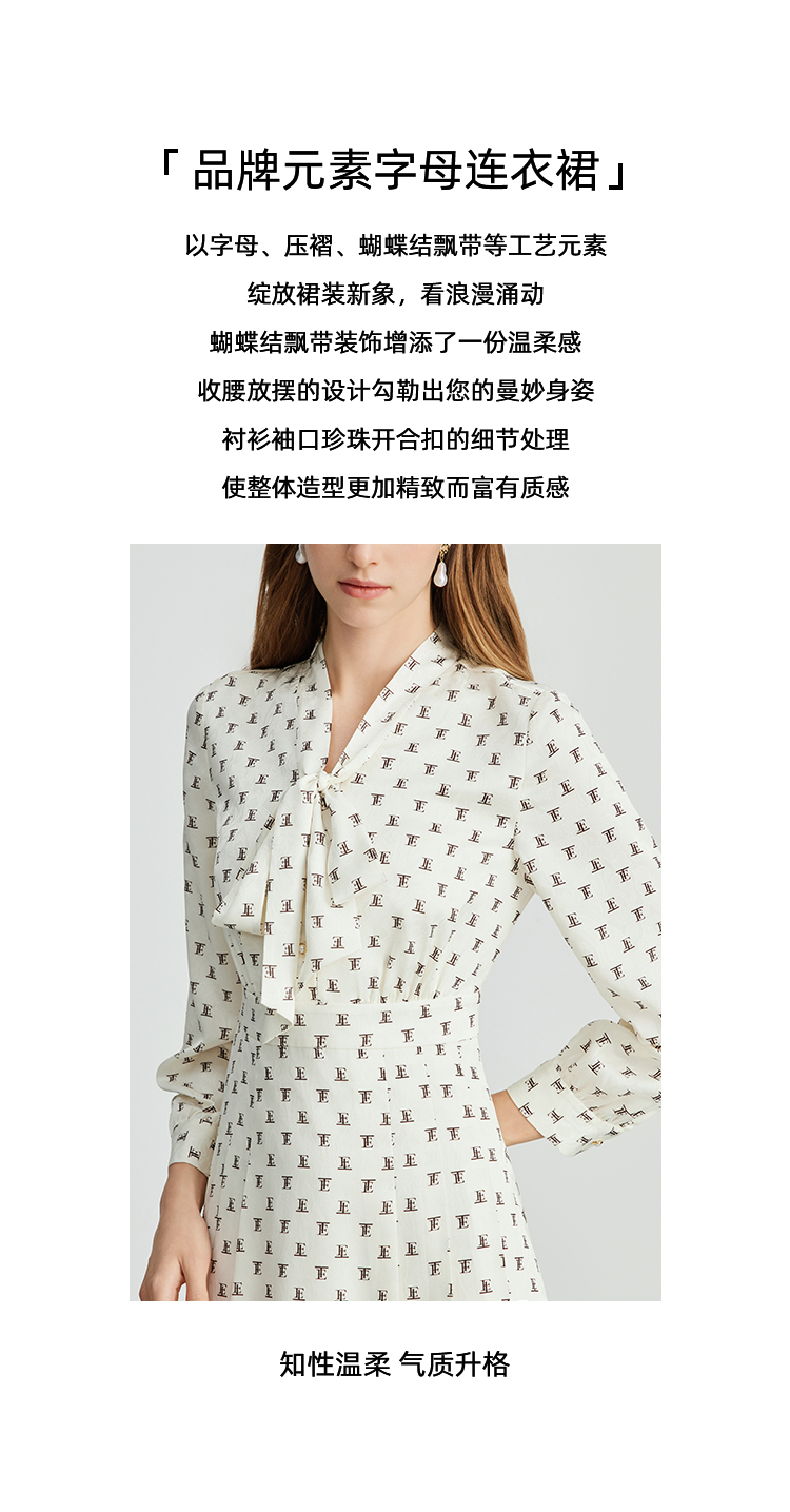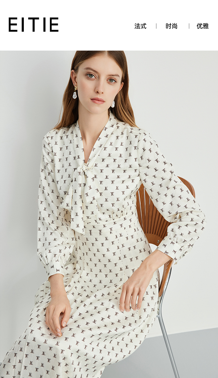 EITIE爱特爱气质复古通勤飘带V领字母印花显瘦连衣裙秋新款C2407410