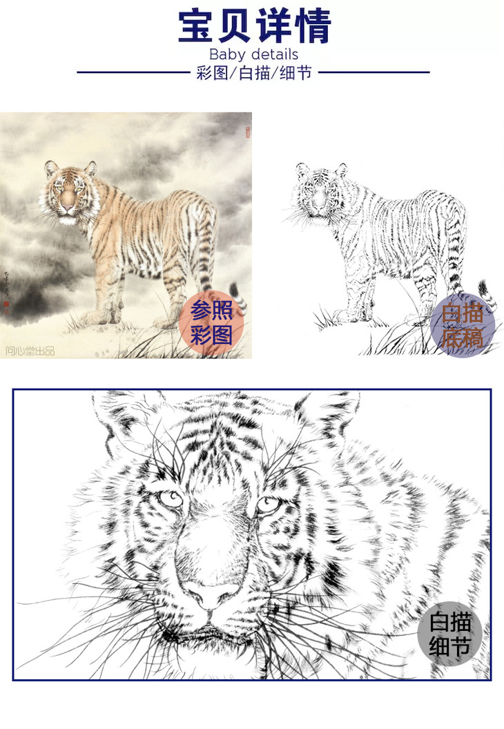 工笔动物白描底稿-老虎-王爱民-斗方小品册页-WH12