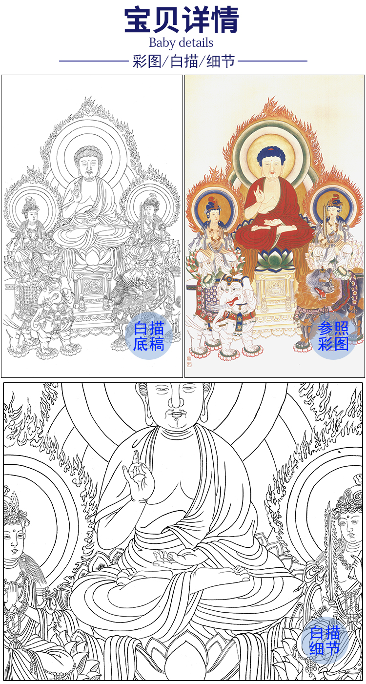 竖幅工笔人物白描底稿 佛像华严三圣-观音菩萨-SF02