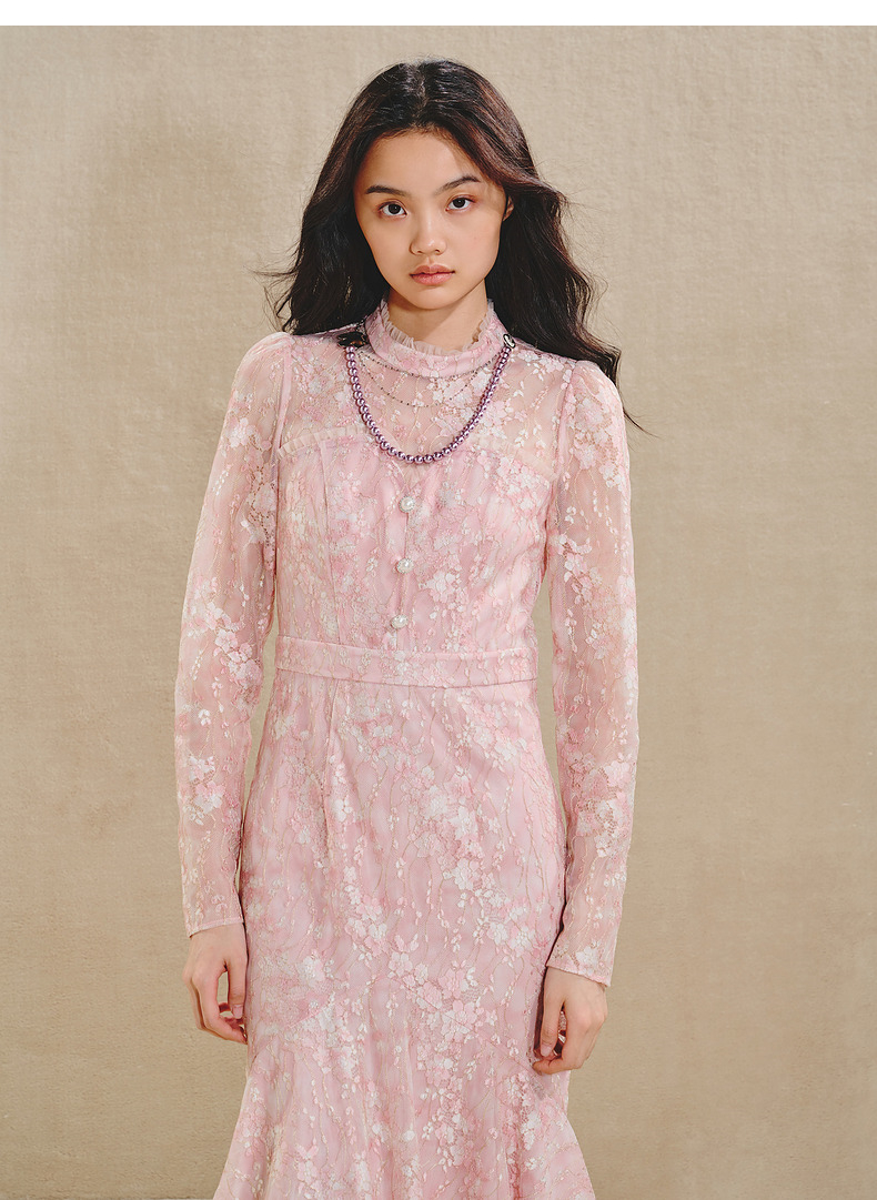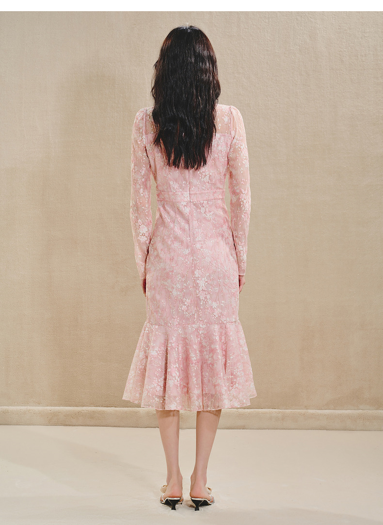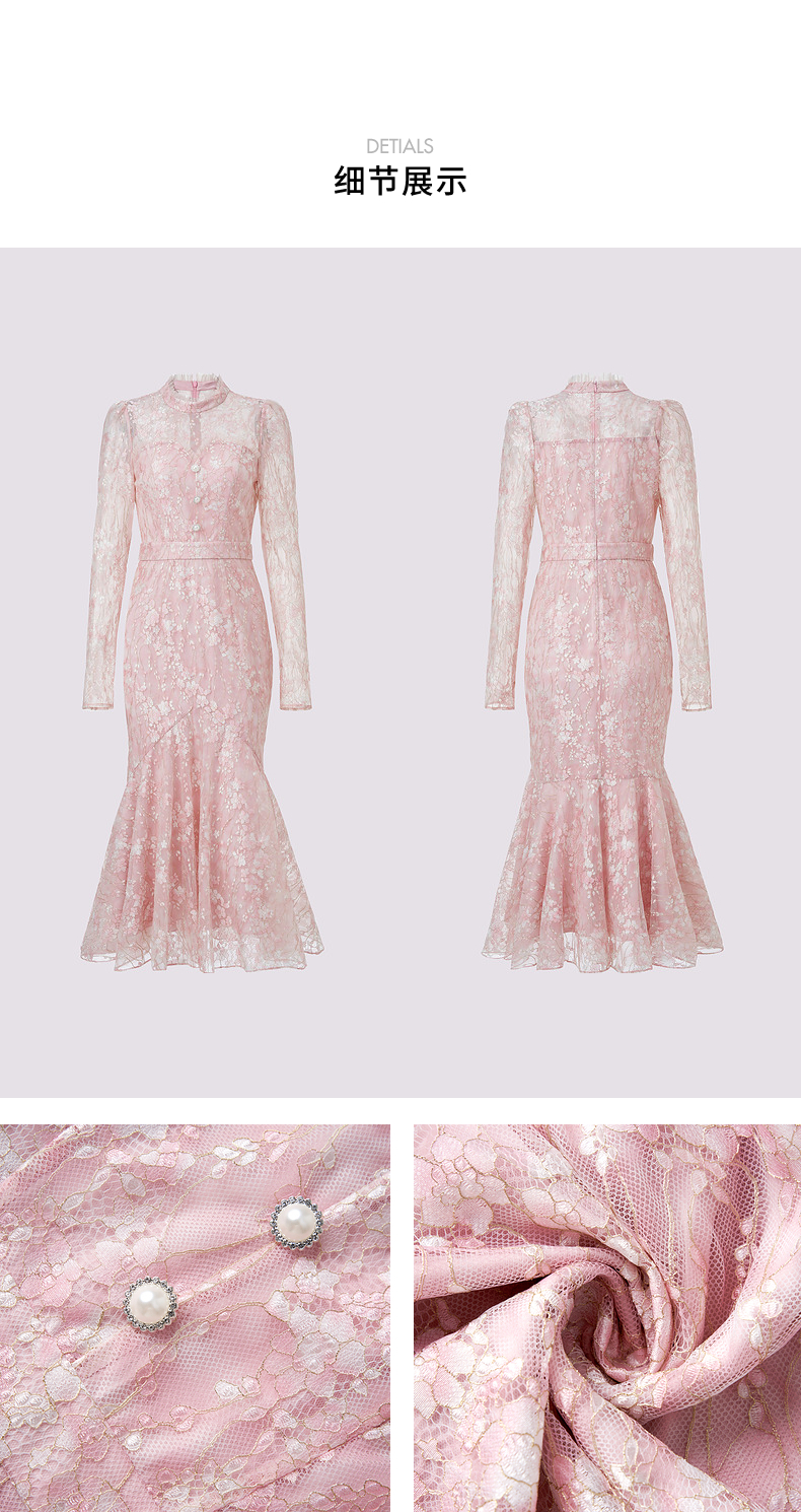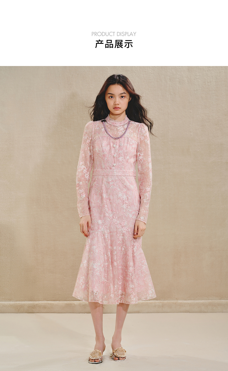 MAXRIENY*优雅浪漫感连衣裙2024秋冬新款鱼尾荷叶边蕾丝长裙(货号:MS85DR519)