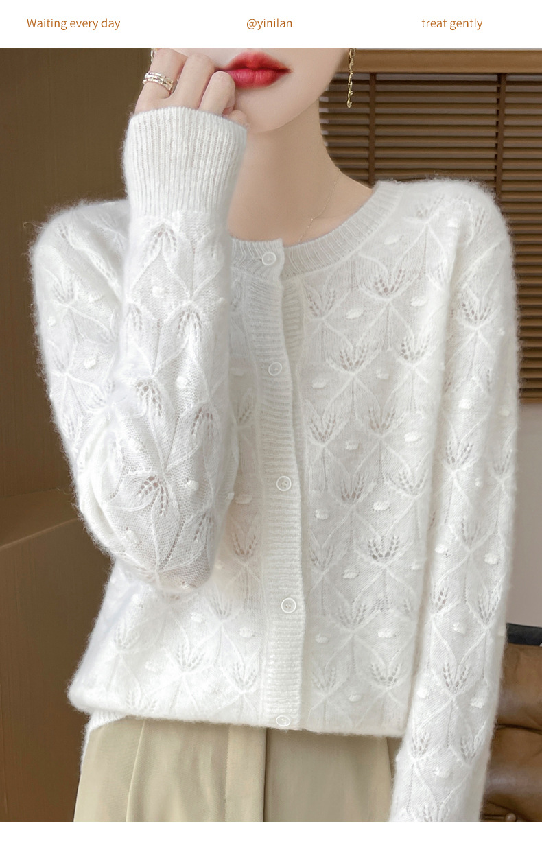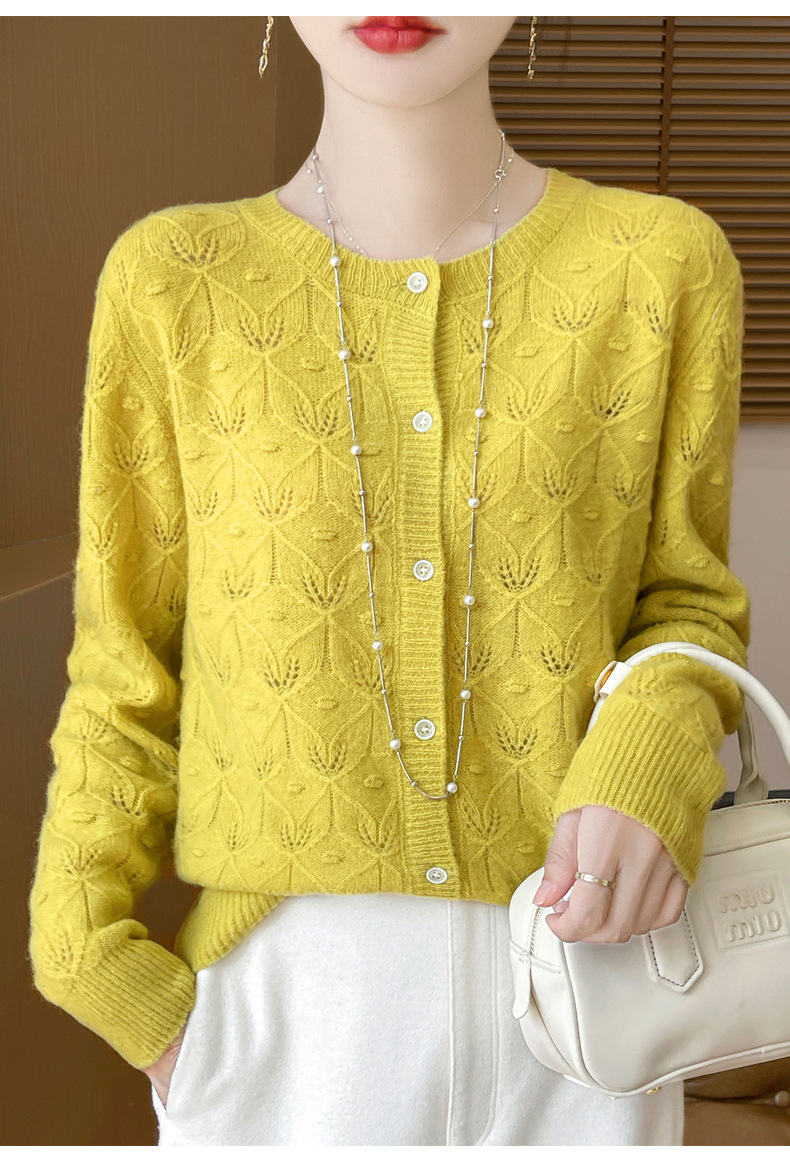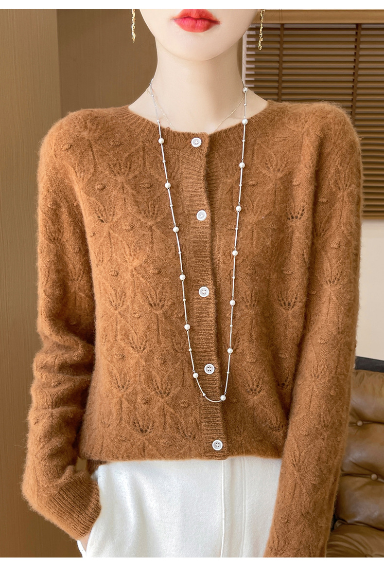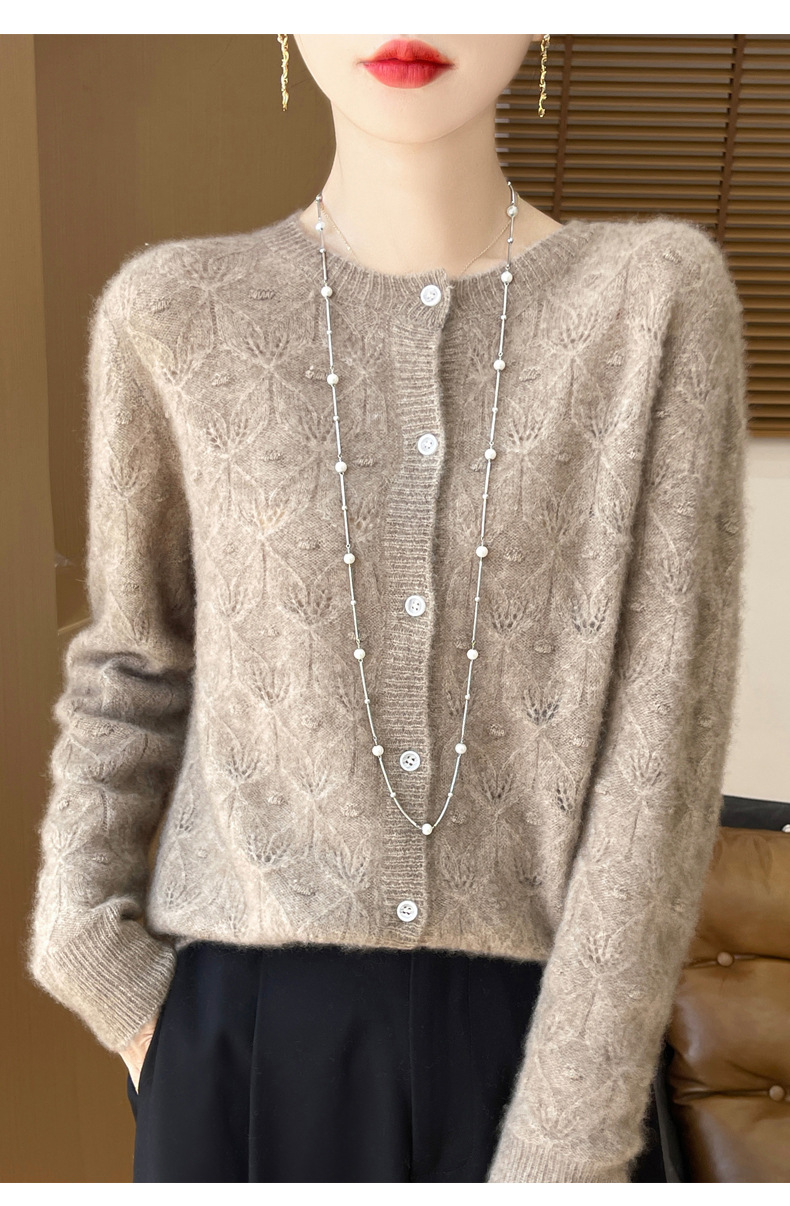 J1117羊毛开衫女25秋冬圆领镂空针织衫上衣宽松洋气提花毛衣女外套