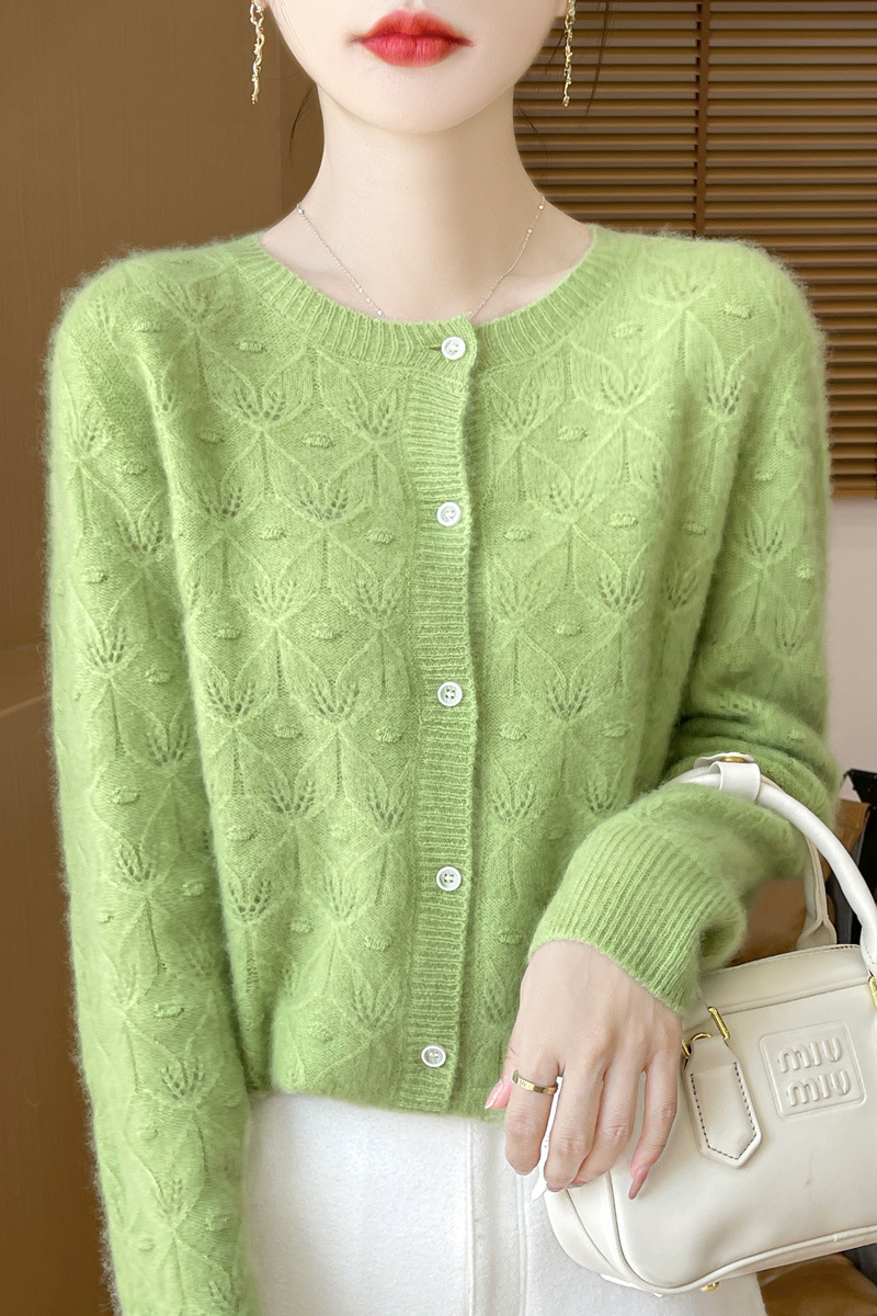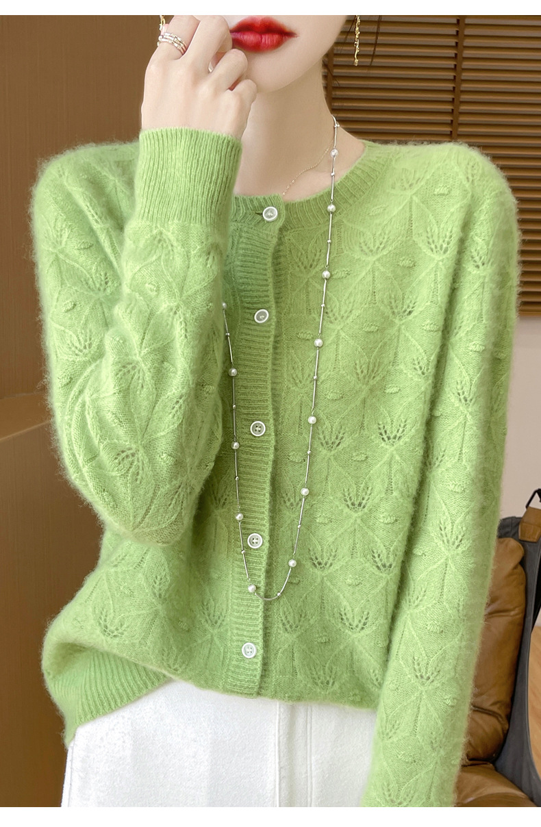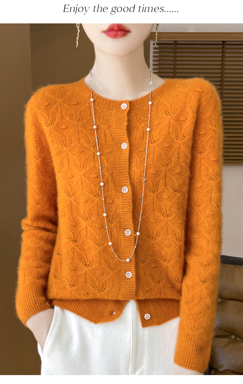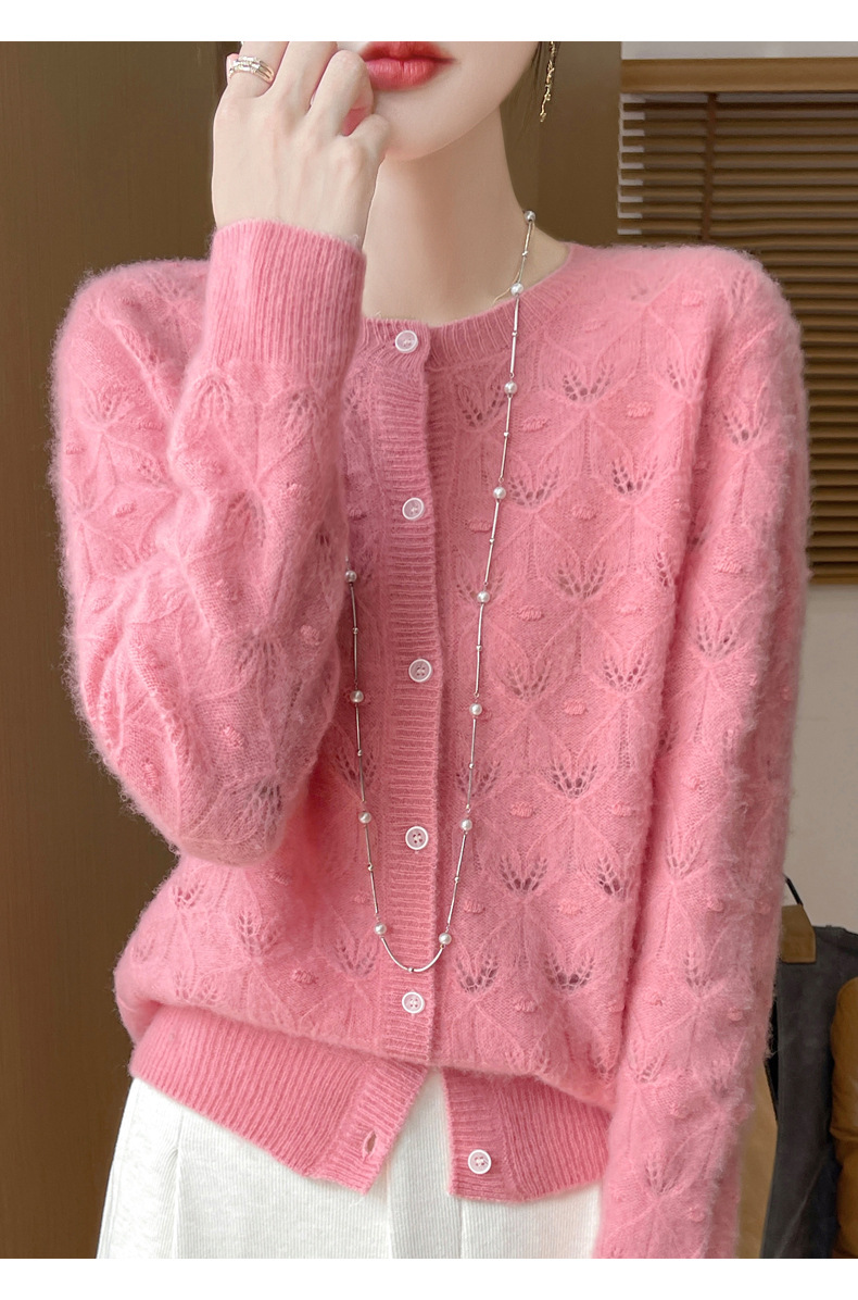 J1117羊毛开衫女25秋冬圆领镂空针织衫上衣宽松洋气提花毛衣女外套