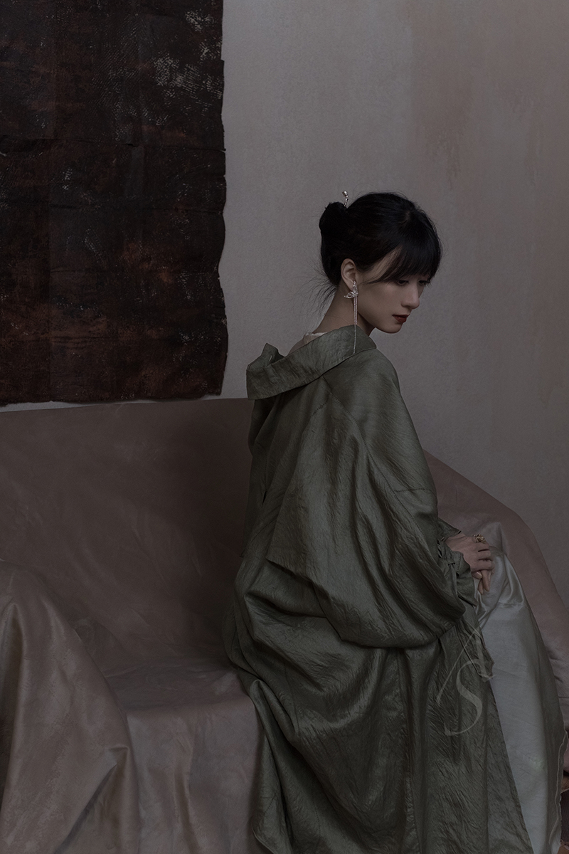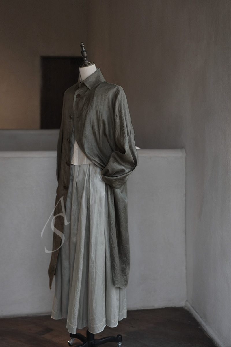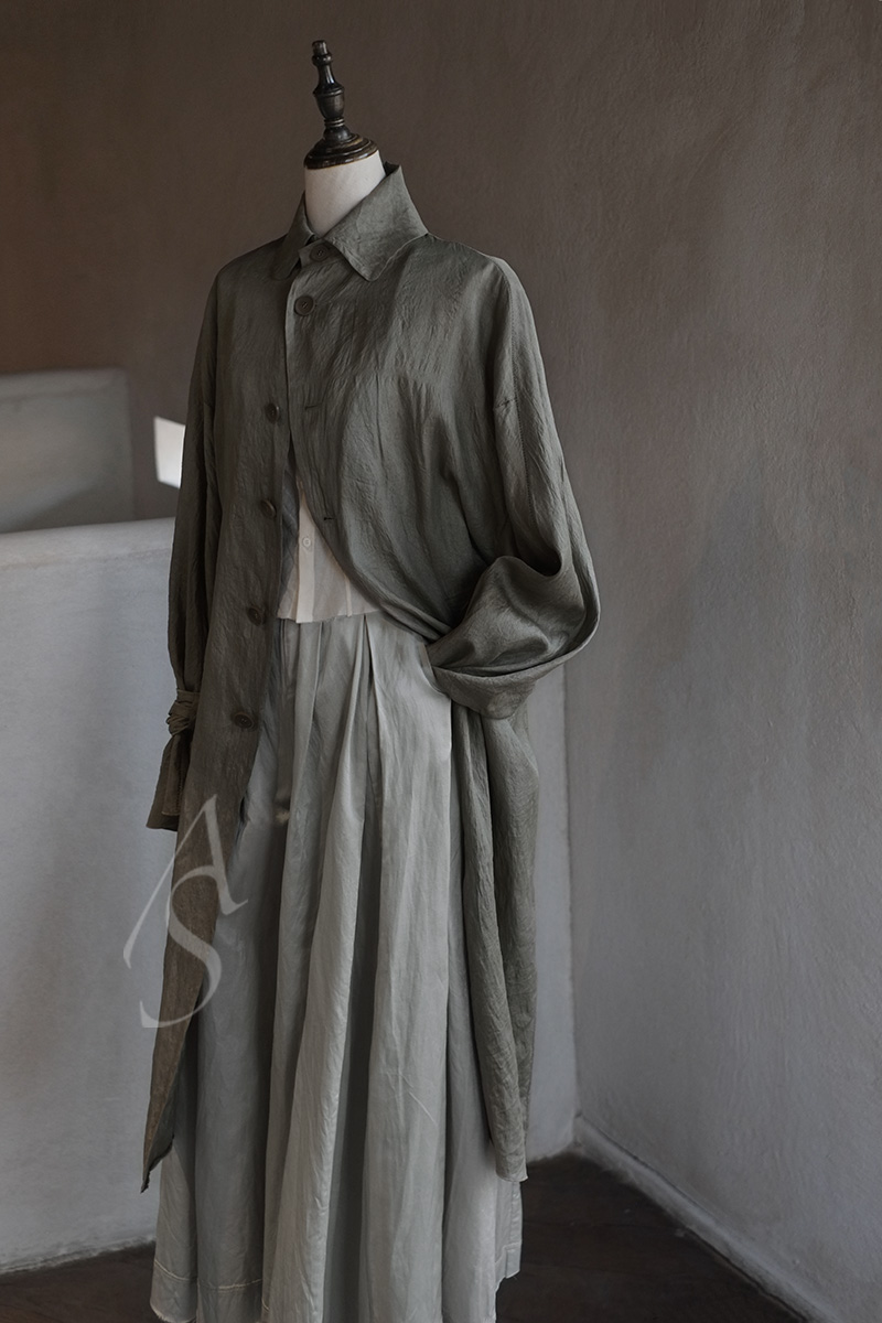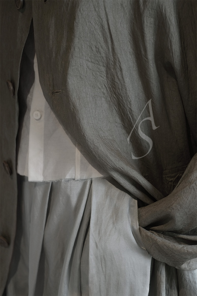 领角的弧线削弱了正式感,更富女性的温润气场;宫廷袖设计又在细节之处融入了淡淡的复古气息。采用柔软的桑蚕丝制作,植物染色工艺使之呈现柔和的光泽,表面随多次水洗处理而富有自然的褶皱肌理,宛若山中轻披雾霭的苍树。