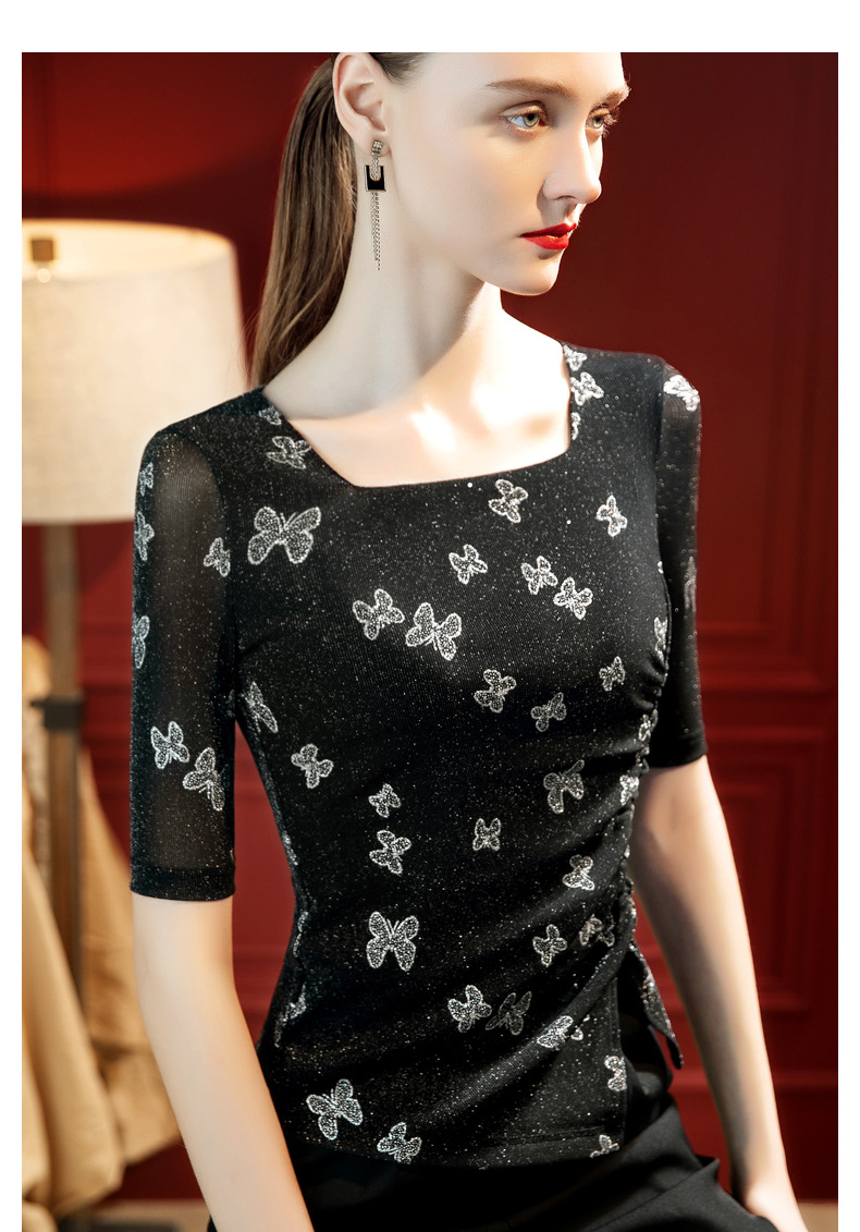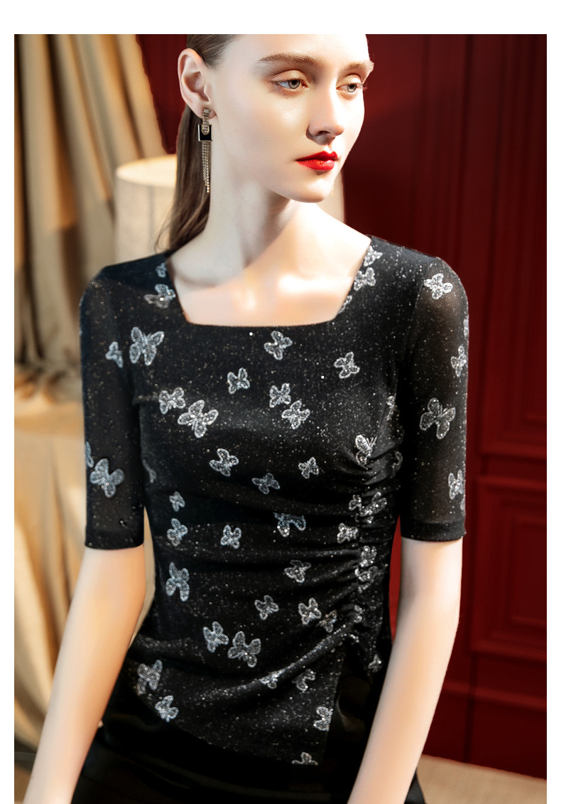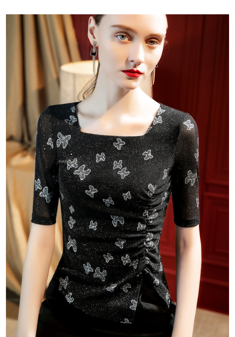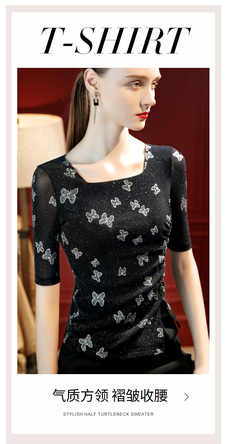 中袖网纱t恤,方领蝴蝶印花褶皱收腰上衣SG-T2Q2725