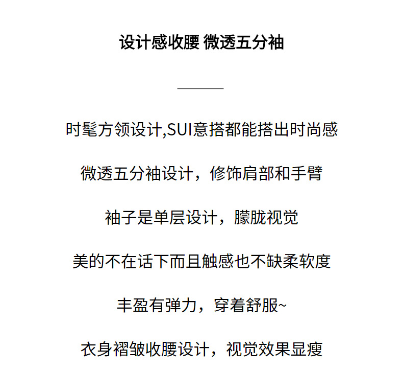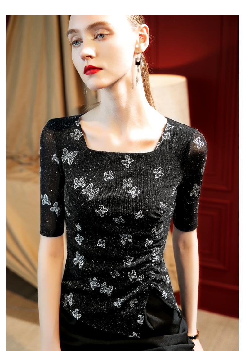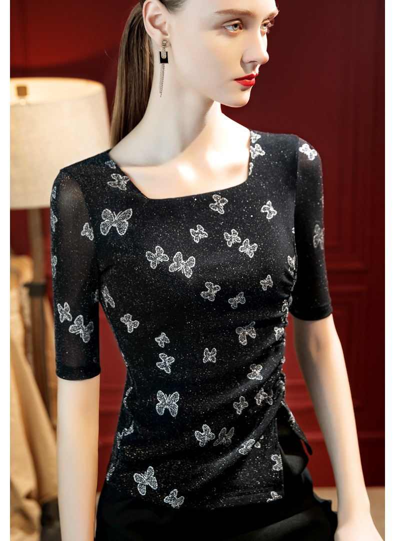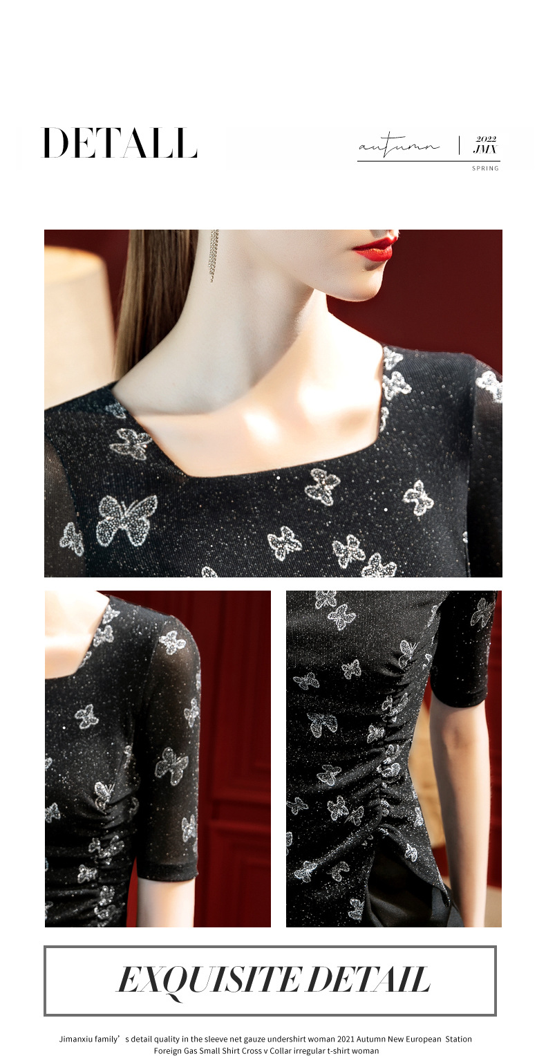 中袖网纱t恤,方领蝴蝶印花褶皱收腰上衣SG-T2Q2725