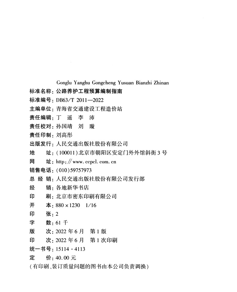 书名:公路养护工程预算编制指南(DB63/T 2011—2022)
