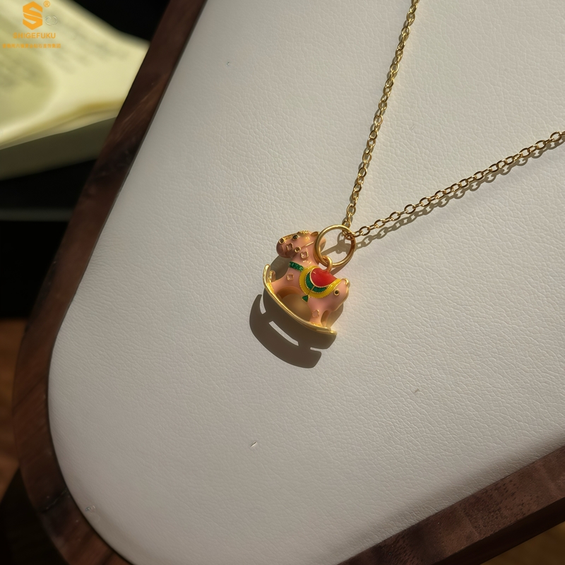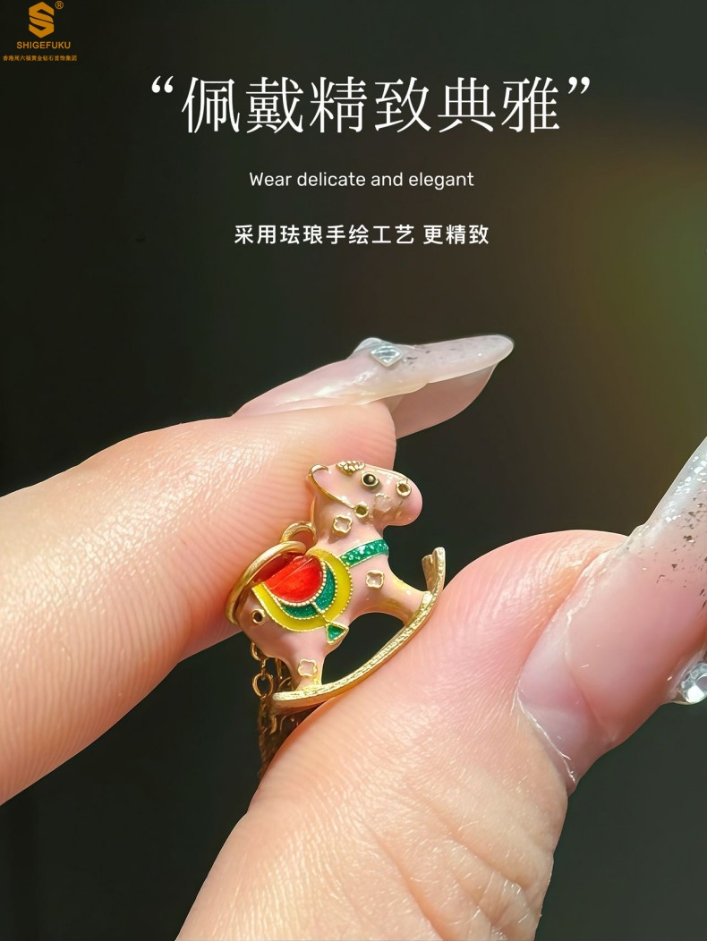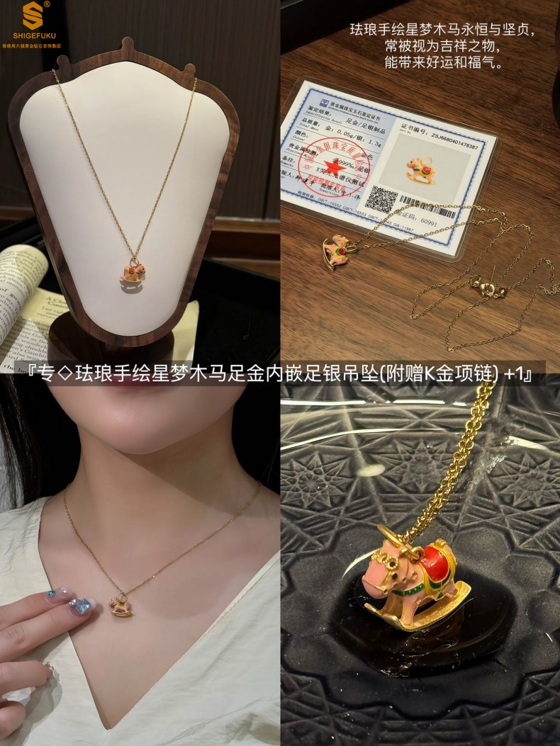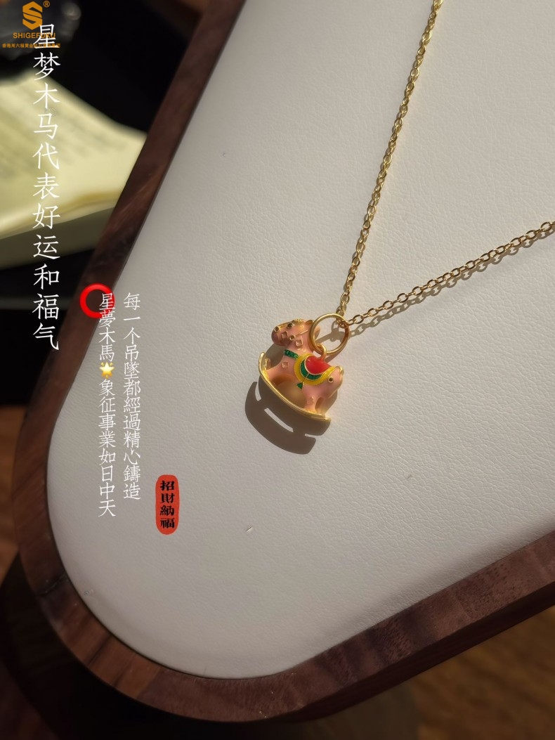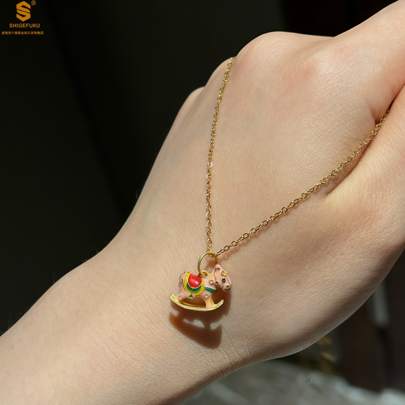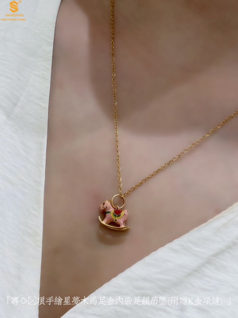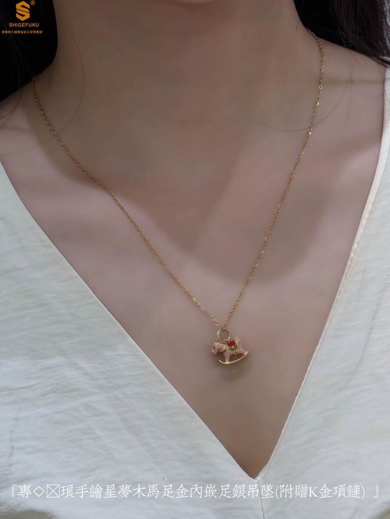 香港周六福黄金钻石首饰珐琅手绘星梦木马足金内嵌足银吊坠(附赠K金项链)