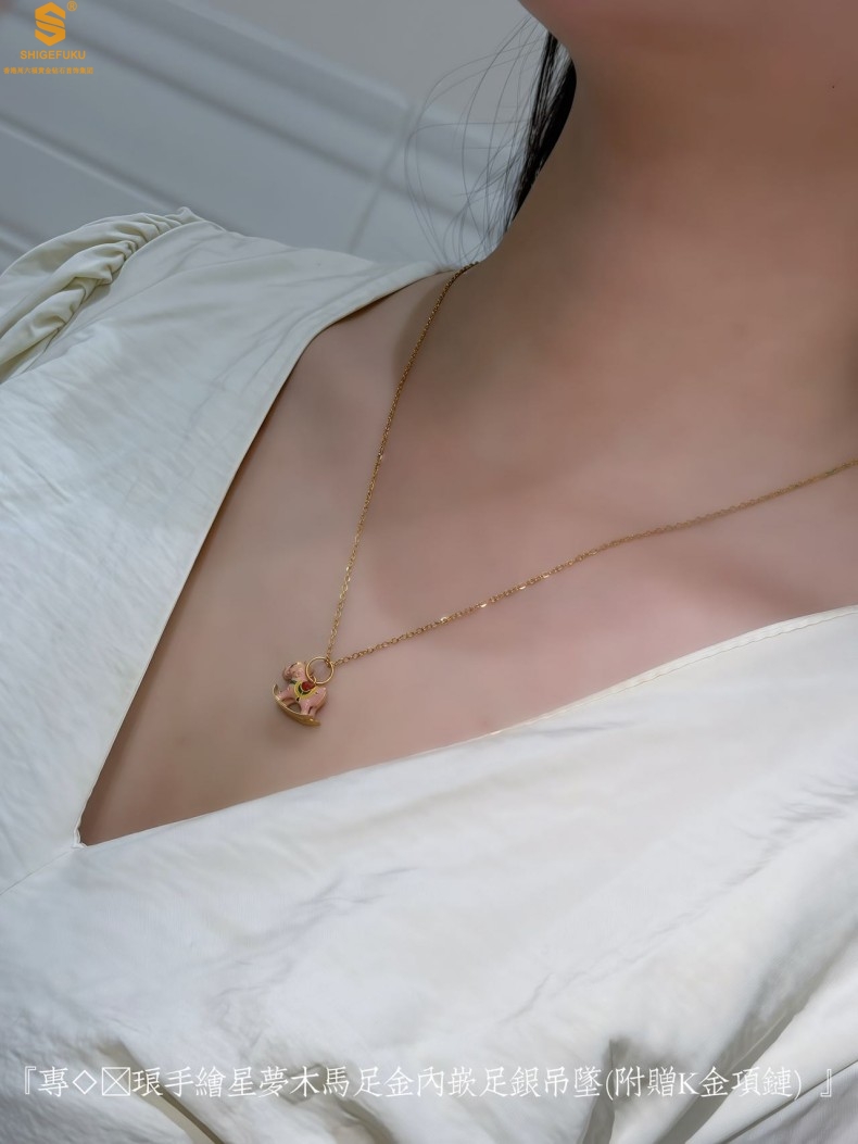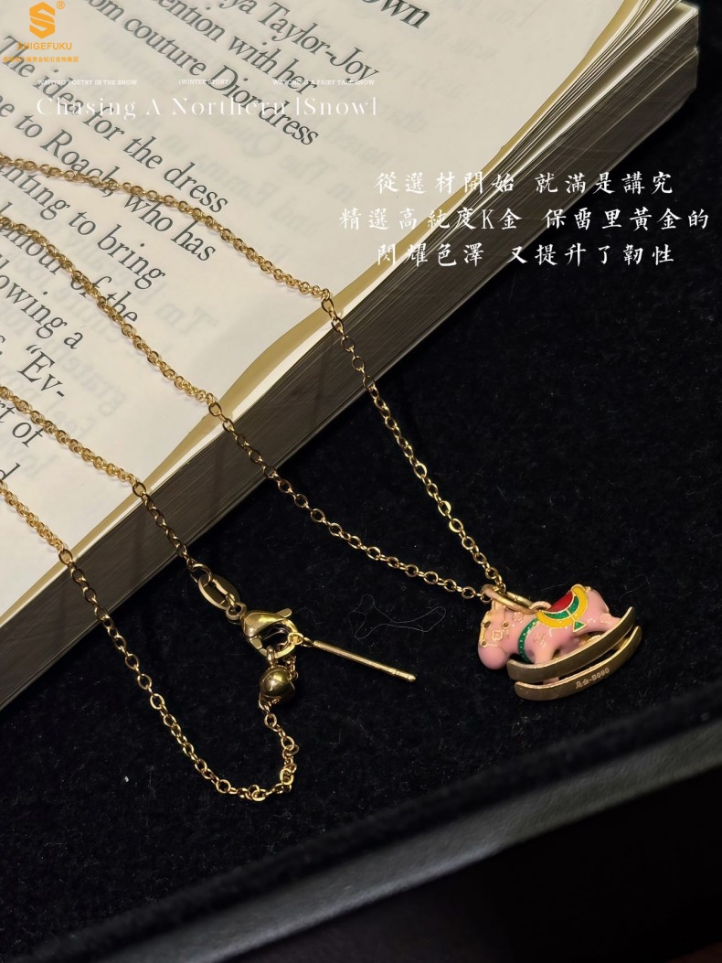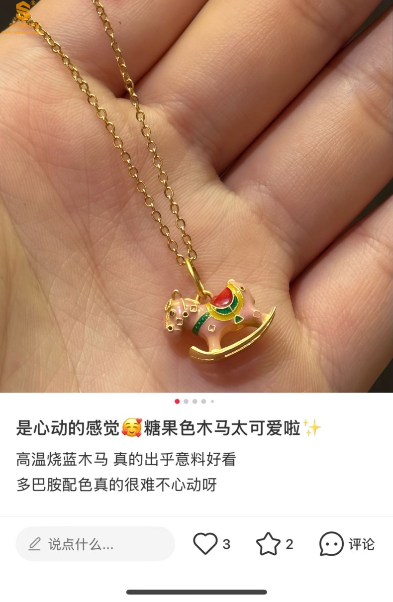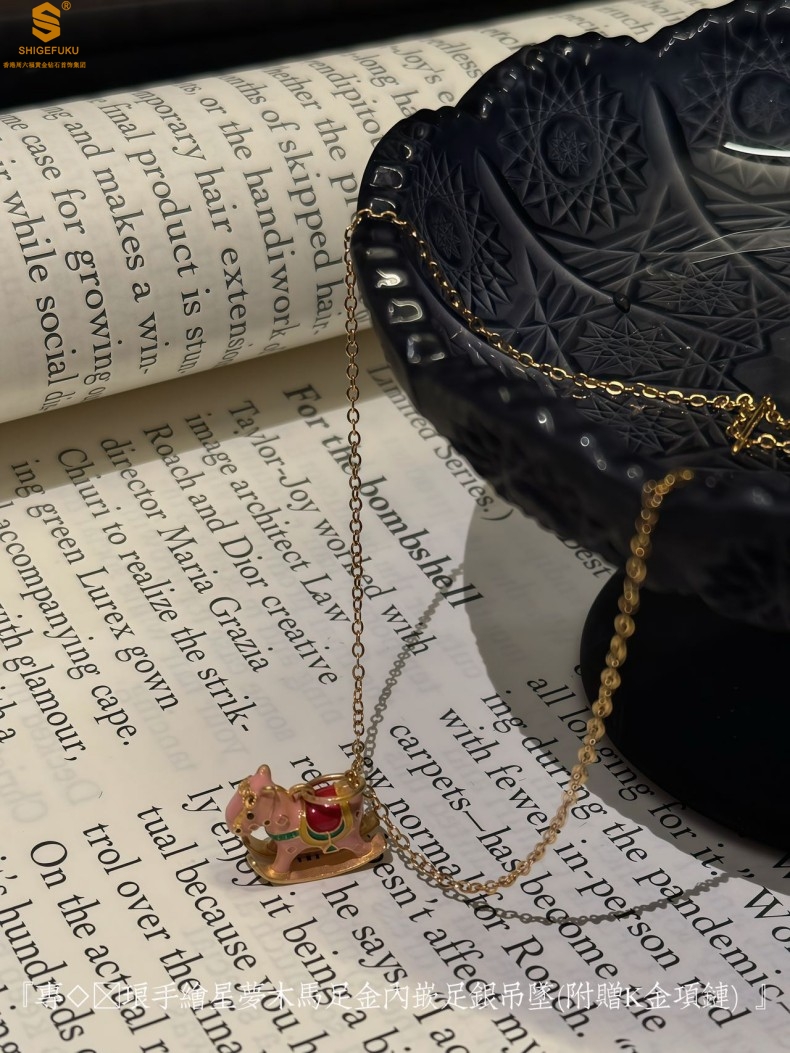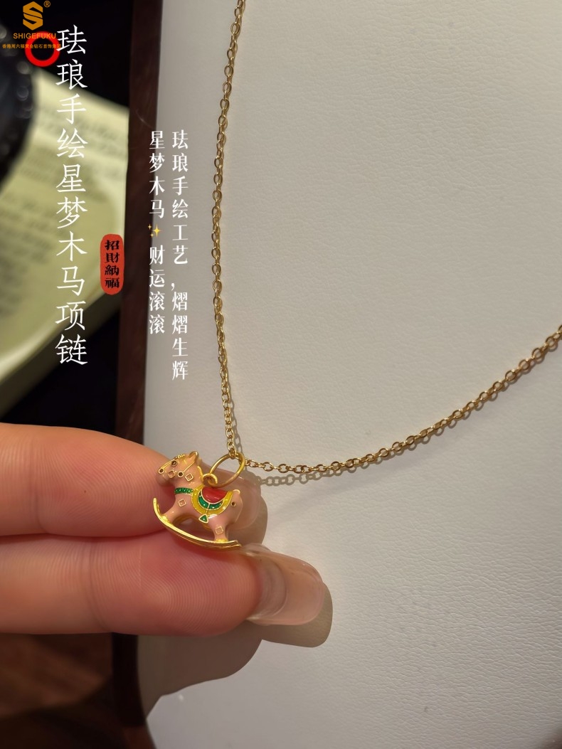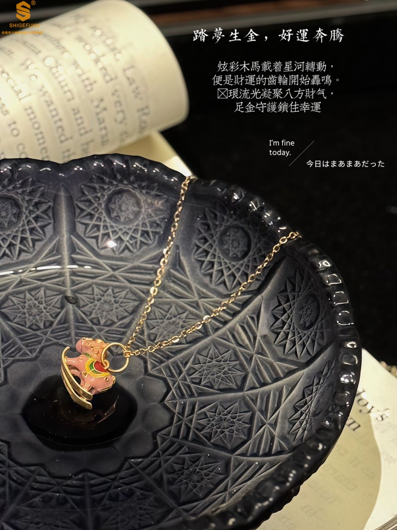 香港周六福黄金钻石首饰珐琅手绘星梦木马足金内嵌足银吊坠(附赠K金项链)