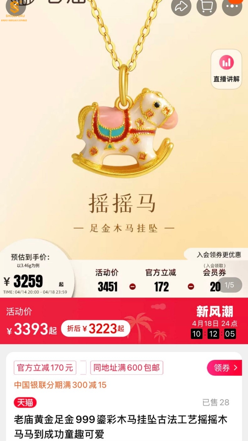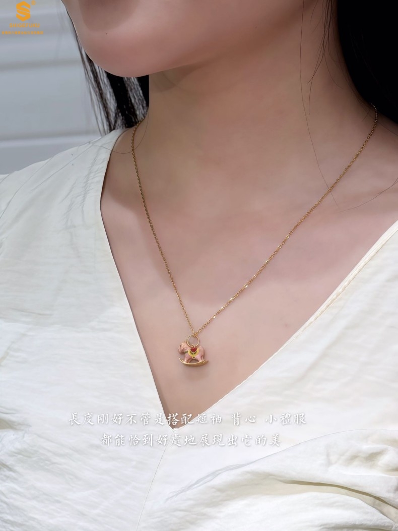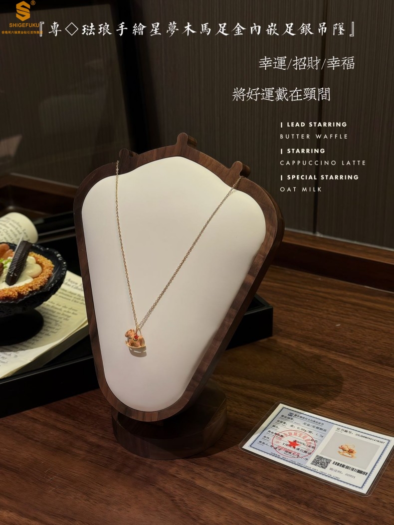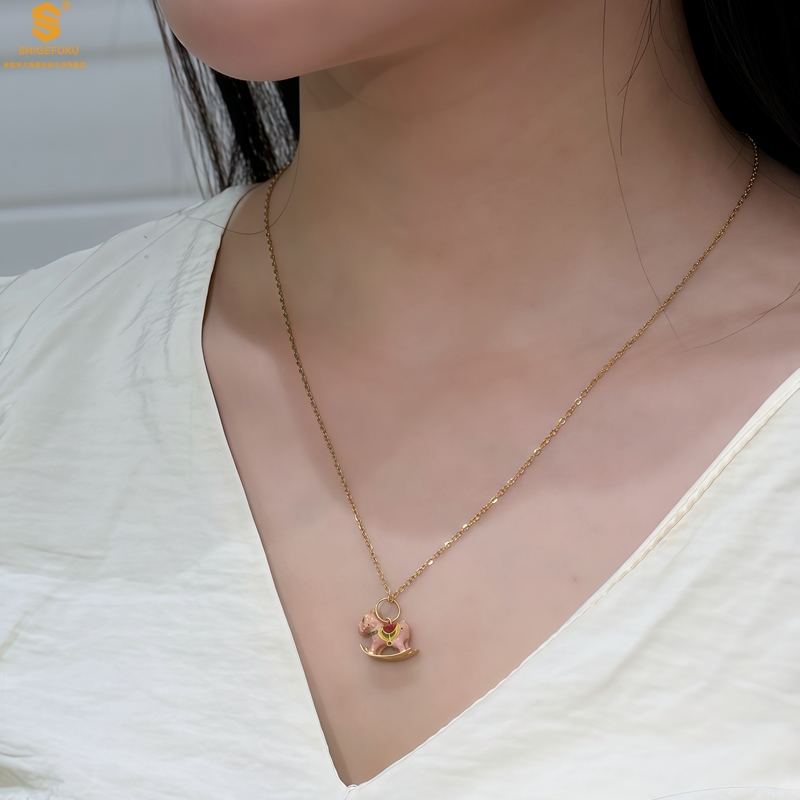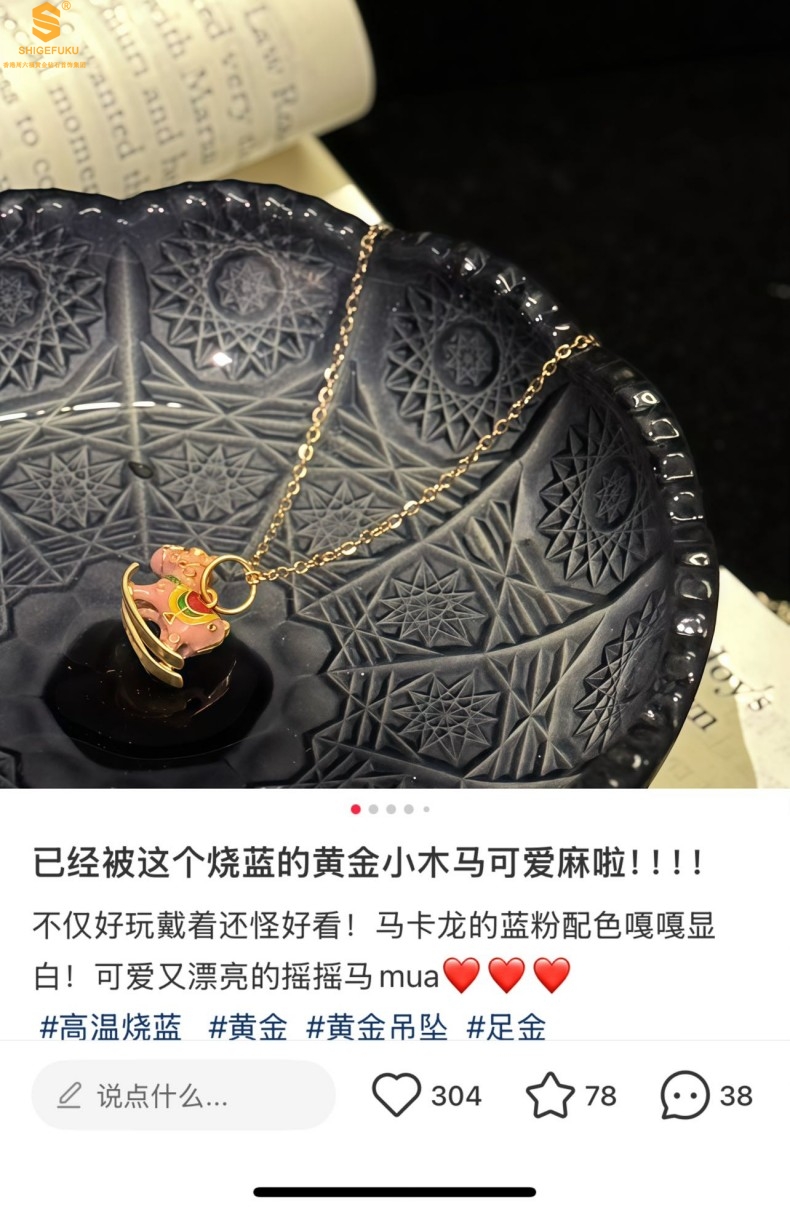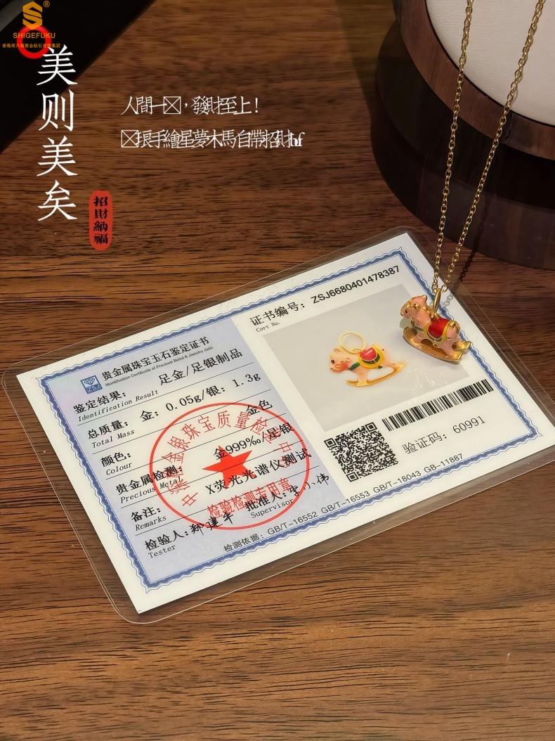 香港周六福黄金钻石首饰珐琅手绘星梦木马足金内嵌足银吊坠(附赠K金项链)