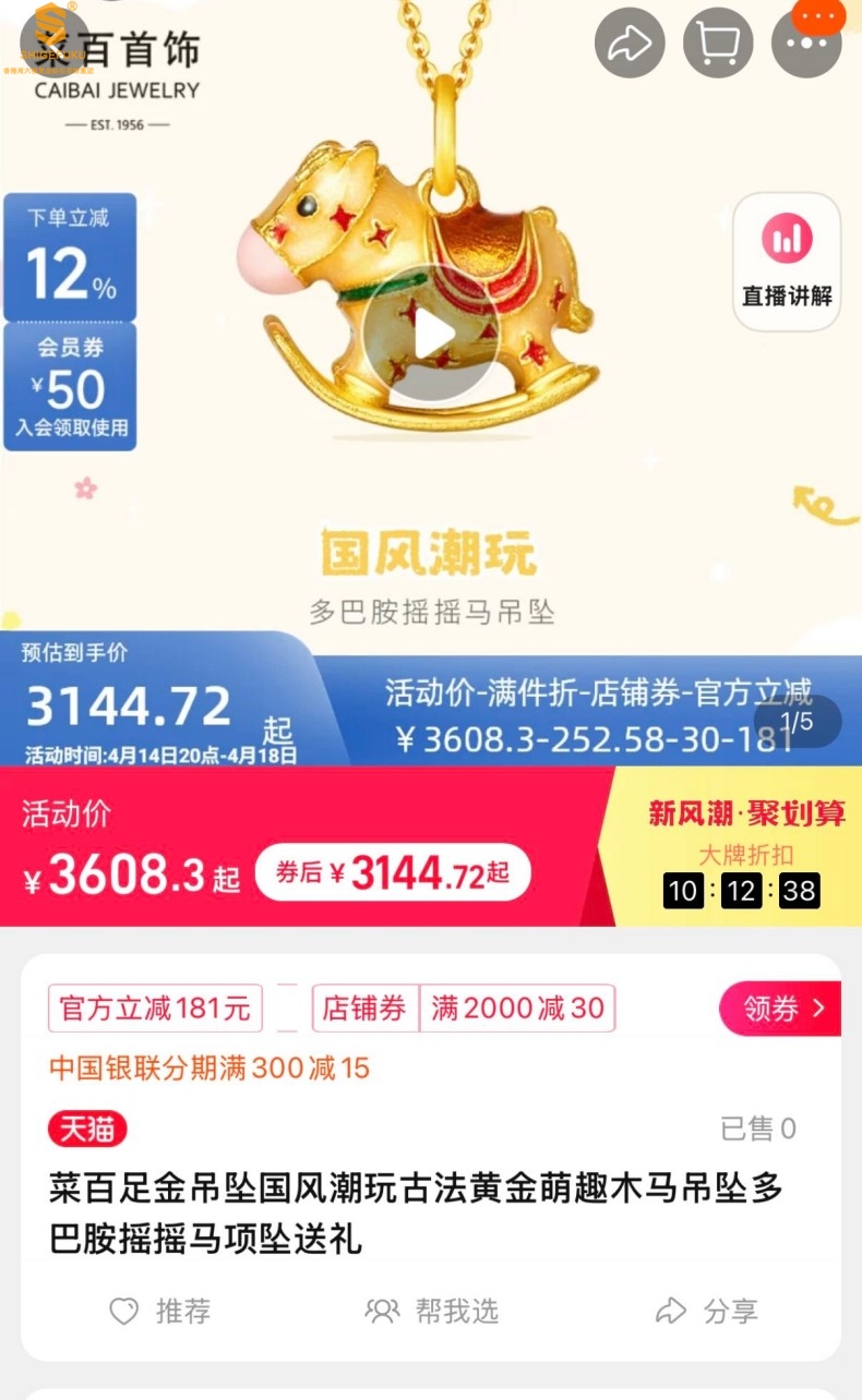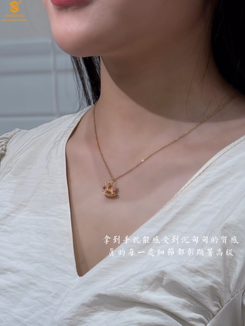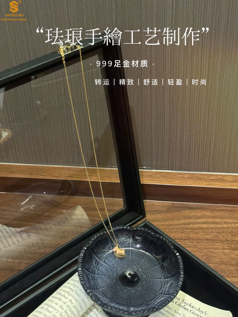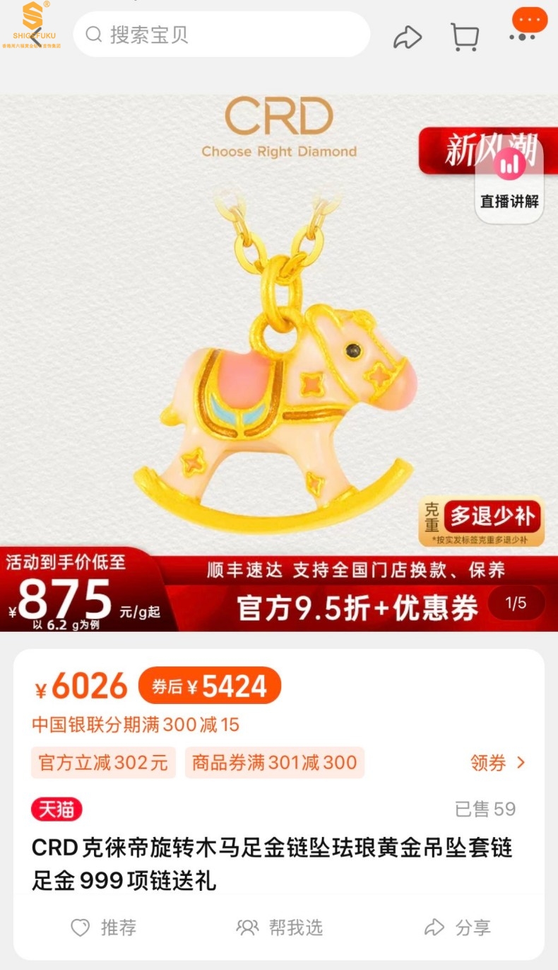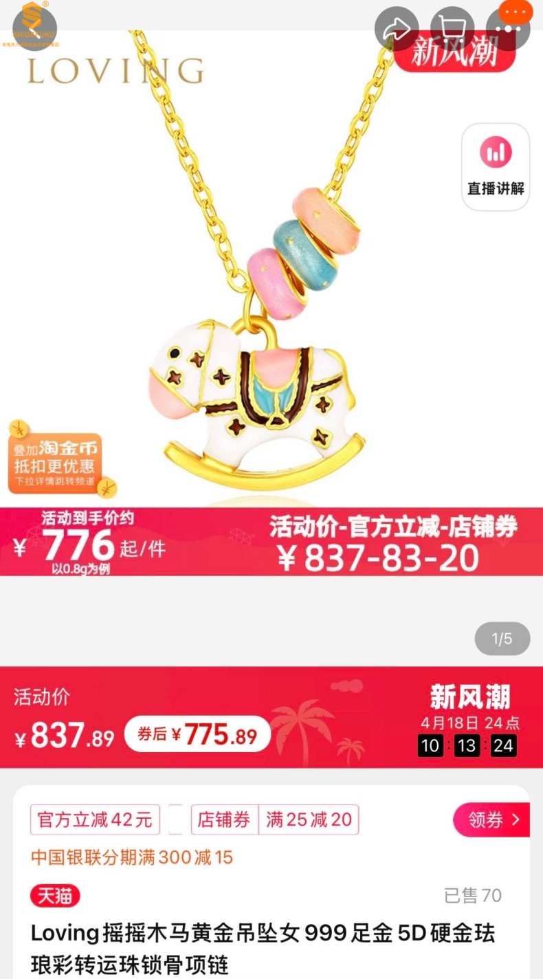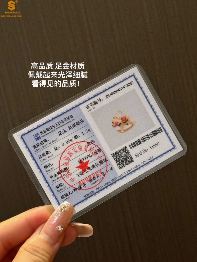 香港周六福黄金钻石首饰珐琅手绘星梦木马足金内嵌足银吊坠(附赠K金项链)