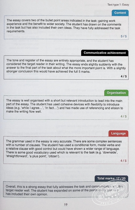 每个回答都有详细的评论,按评估标准(内容;沟通成就;组织;语言)分类,以及每个回答在考试中可以获得的分数的细目分类。