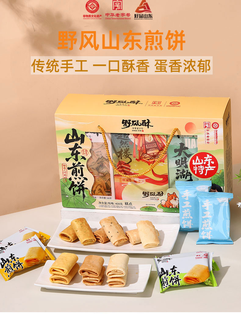 野风酥山东特产香酥糖酥煎饼礼盒408g手工薄脆甜咸味煎饼零食组合