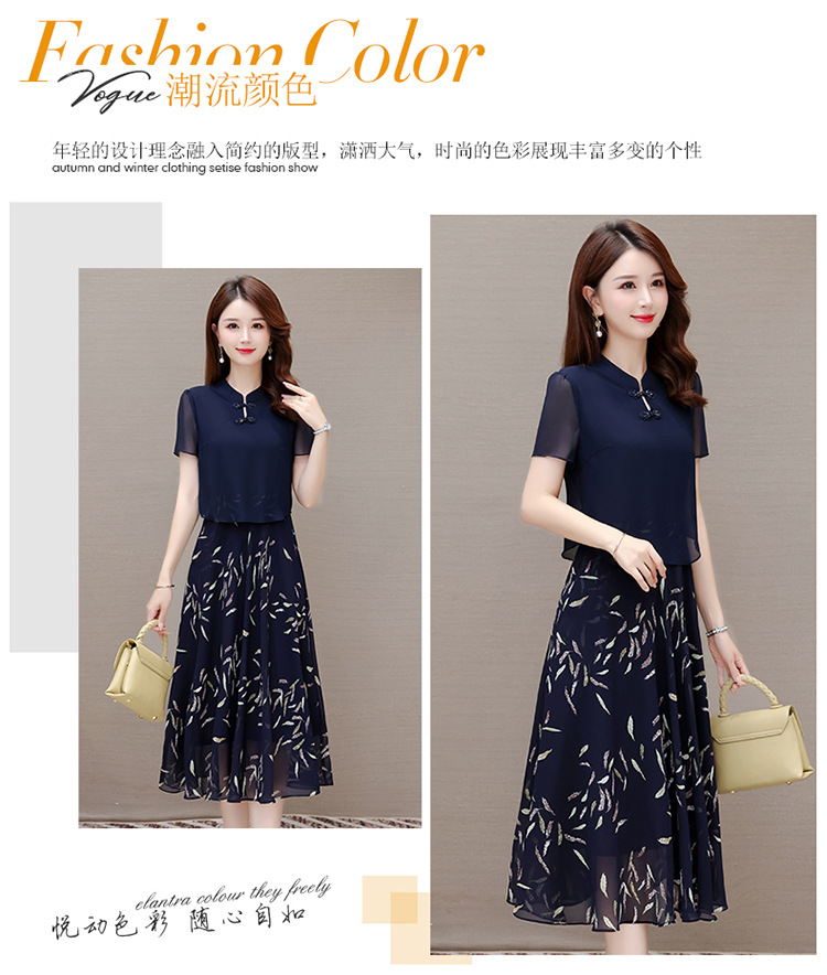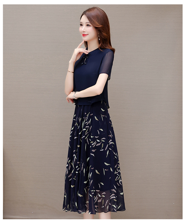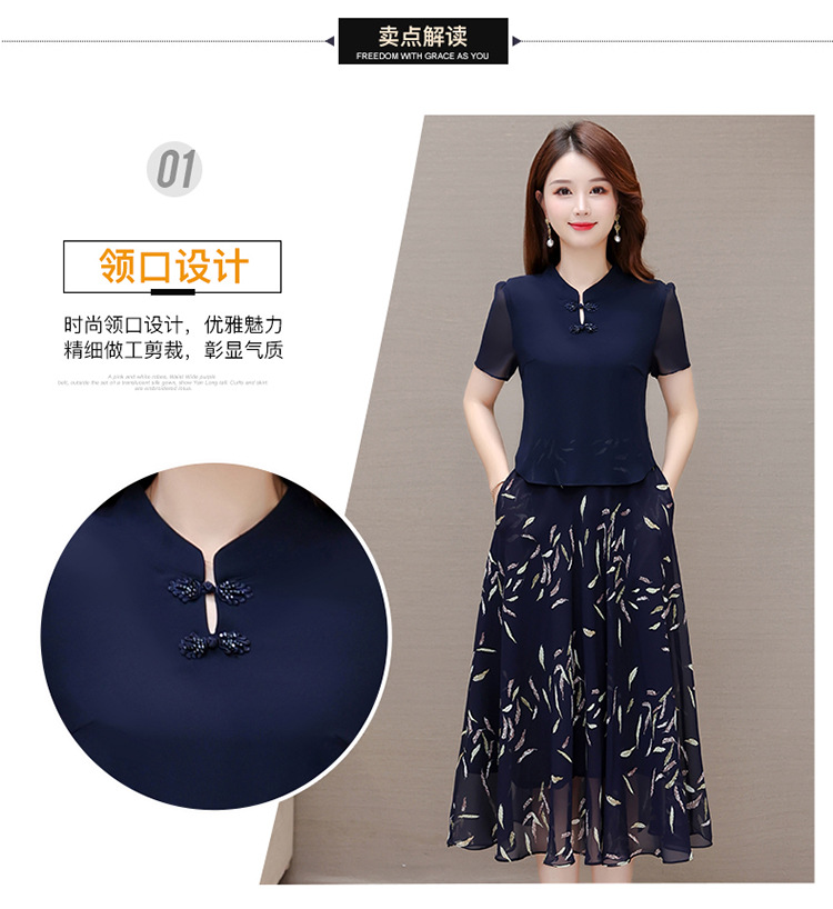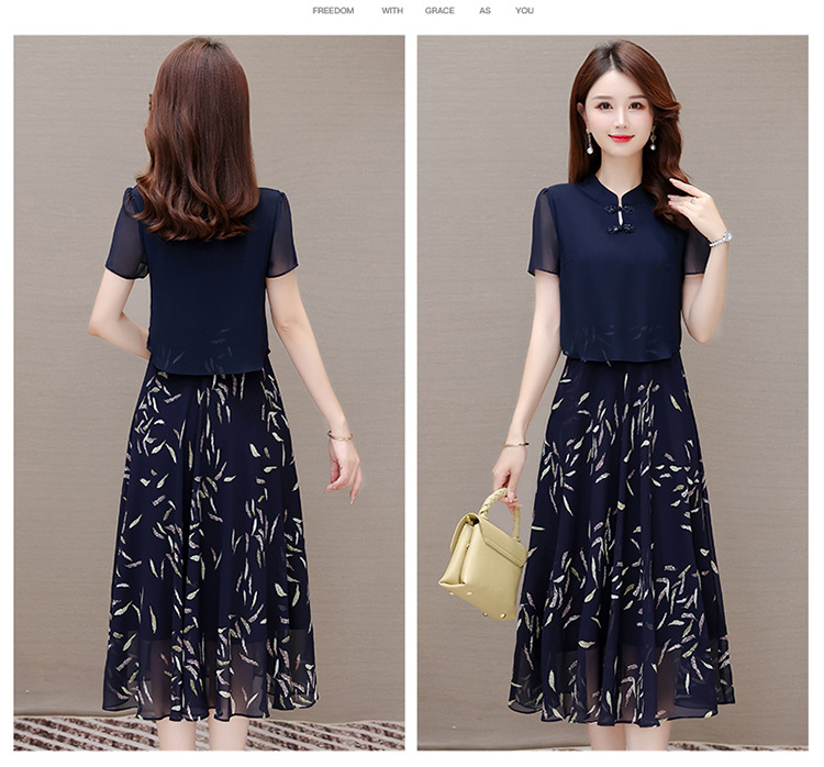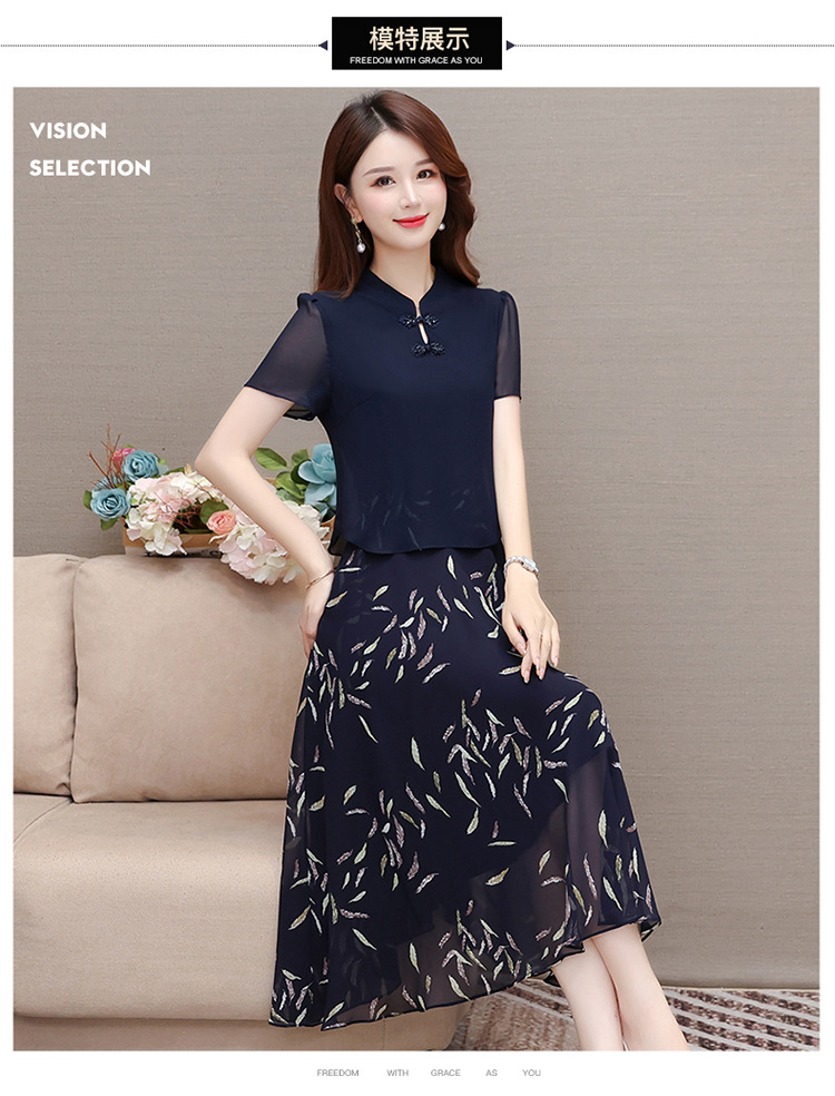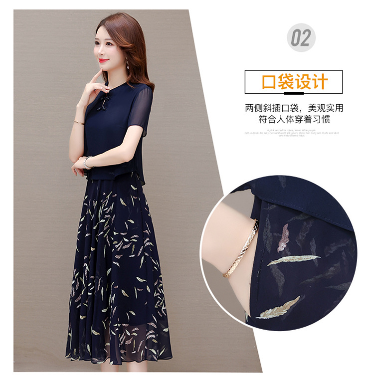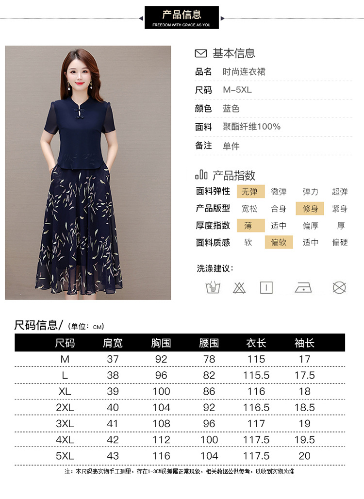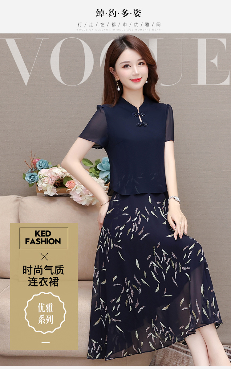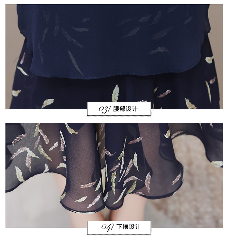 气质优雅,拼结高腰假两件雪纺裙女装中长款A字裙蓝色印花连衣裙QYM-KED-H1217 -Y