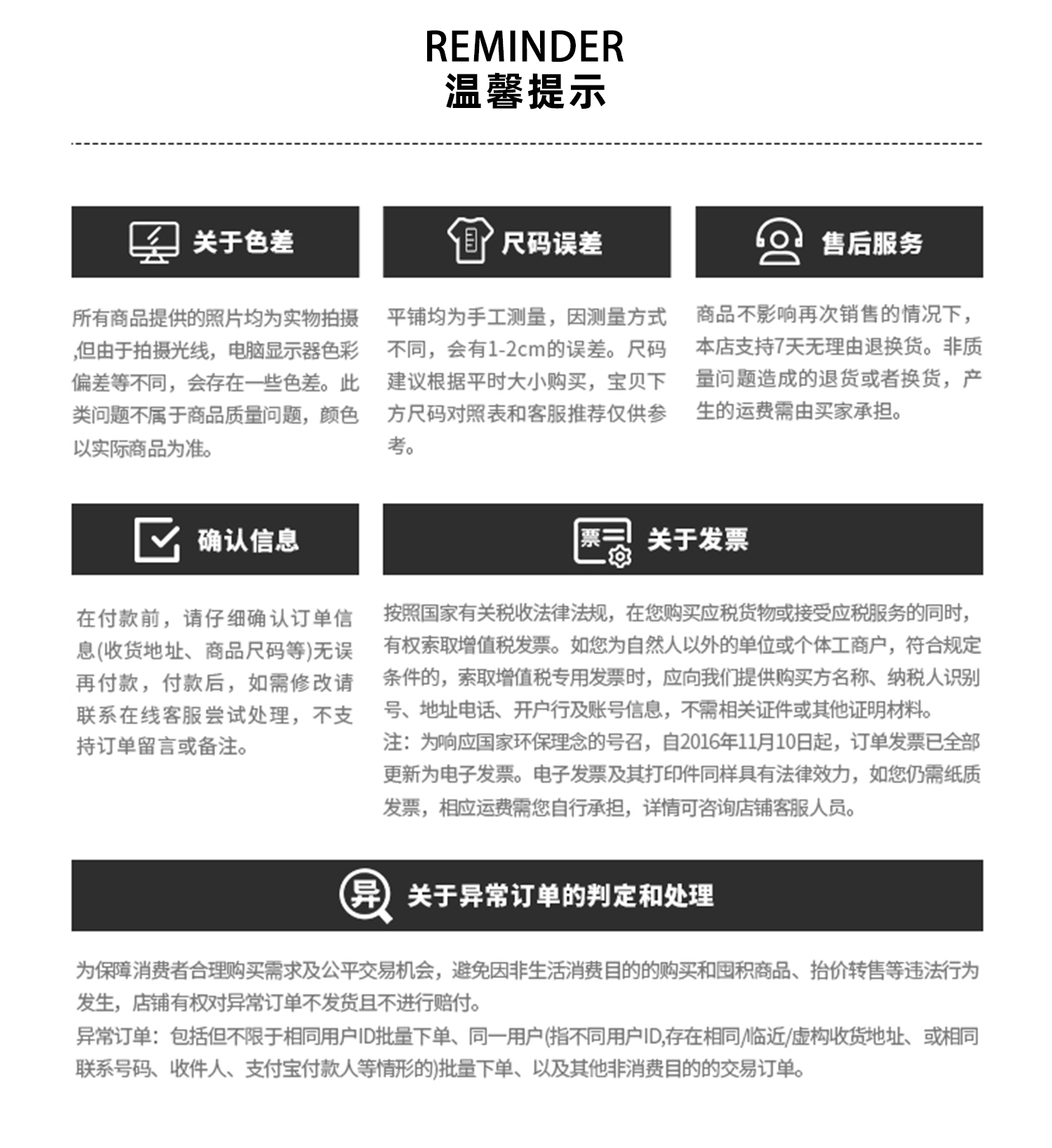 【质保/退货要求】收到7天内,保持完好无污损,吊牌没有拆,不合适可退换,非质量问题退换的运费由买家承担,需扣除6元发货运费;质量问题的退换运费由商家承担(普通快递寄回即可,运费承担6-12元),请当面验收,有质量问题请在签收24小时内附问题件照片和快递面单照片反馈! |