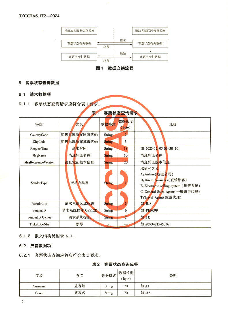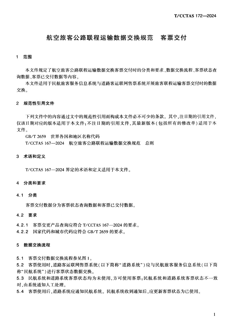 书名:航空旅客公路联程运输数据交换规范 客票交付T/CCTAS 172—2024