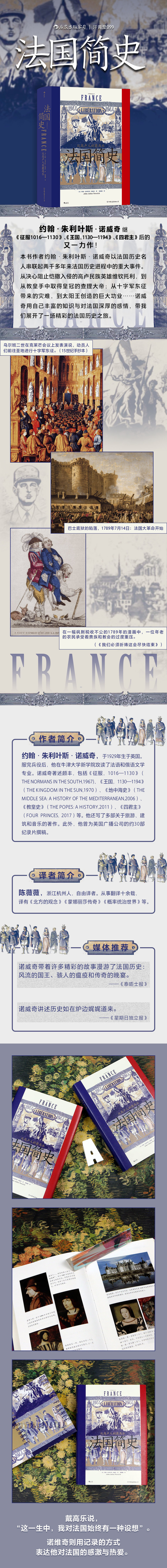 法国史是世界史中精彩而重要的一章。查理大帝、圣女贞德、路易十四、戴高乐等人物早已为读者所耳熟能详。这些伟大的人物是如何一步步塑造了对世界文明产生重大影响的法国的?本书作者约翰·朱利叶斯·诺威奇以法国历史名人串联起两千多年来法国历史进程中的重大事件。从决心阻止恺撒入侵的高卢民族英雄维钦托利,到从教皇手中取得皇冠的查理大帝;从十字军东征带来的灾难,到太阳王创造的巨大功业;从巴士底狱摧枯拉朽的猛攻,到法国军队搭乘出租车奔赴次世界大战战场的戏剧性场面……诺威奇用自己丰富的知识与对法国深厚的感情,带我们展开了一场精彩的法国历史之旅。