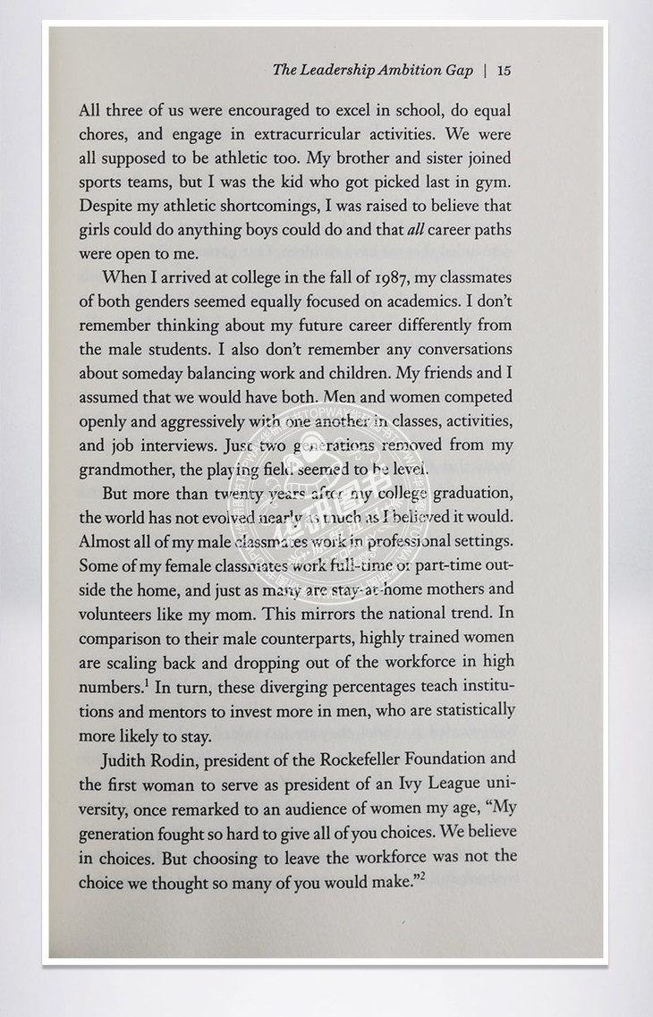在全世界197个国家首领中,只有22位女性——这个数据虽然与几十年前相比已经有了很大的进步,但还是足以说明,在当今世界女性仍不受待见。从全球的数据看来,女性在各国议员中占的比率仅仅为20%。而世界五百强企业中,只有18位女性CEO。在《向前一步》一书中,Facebook首席运营官桑德拉伯格,财富杂志非常具有影响力的商业女性之一,把自己在商业领域的成功经验呈现给读者,以亲身经历告诉全世界女性如何成就自己,把生命中的小事件转化为改变世界的大作为。