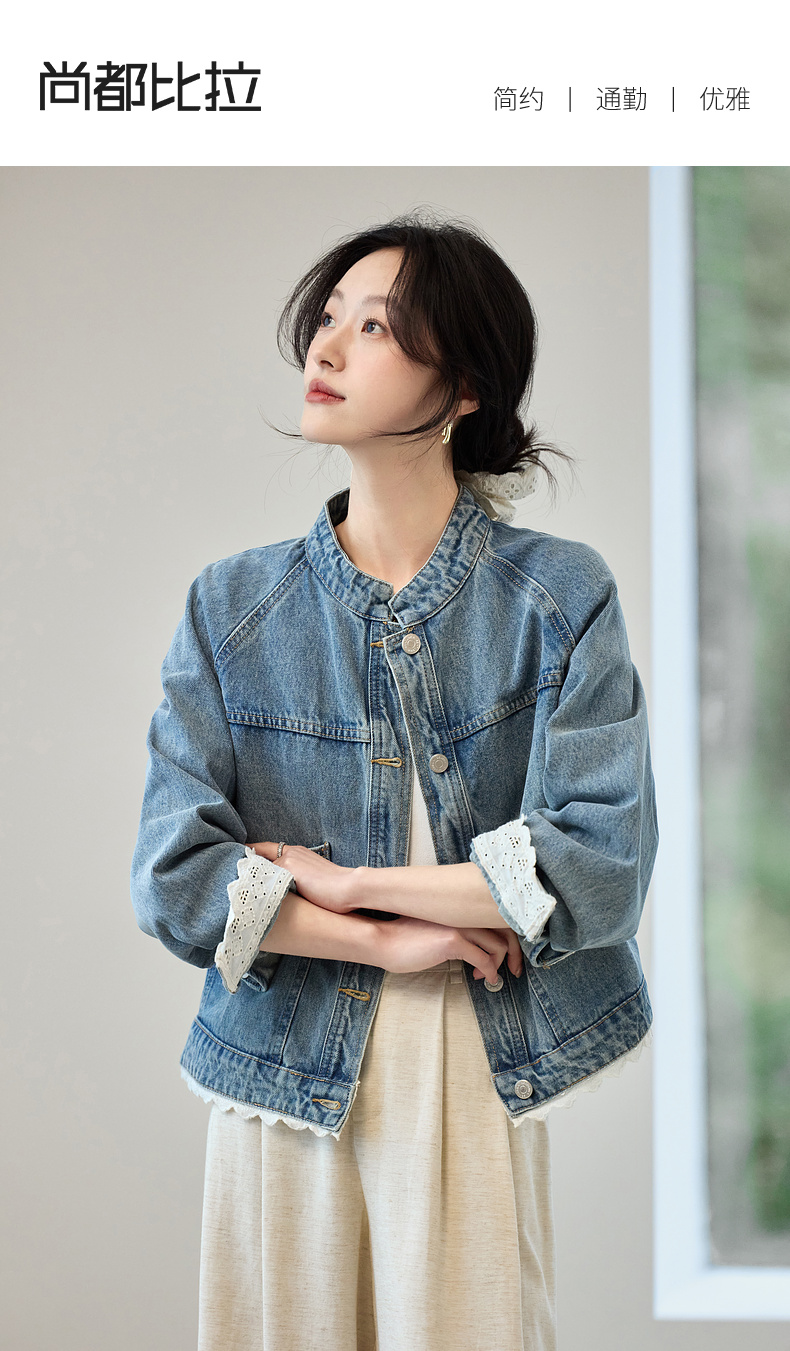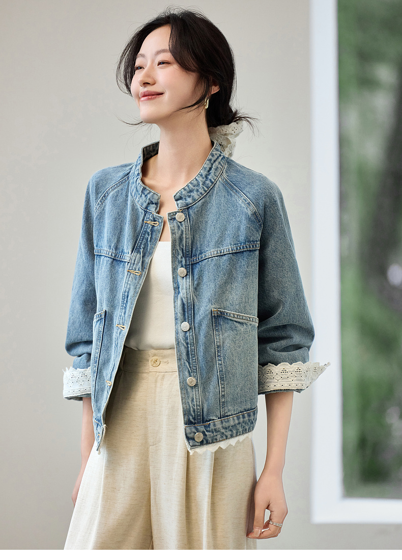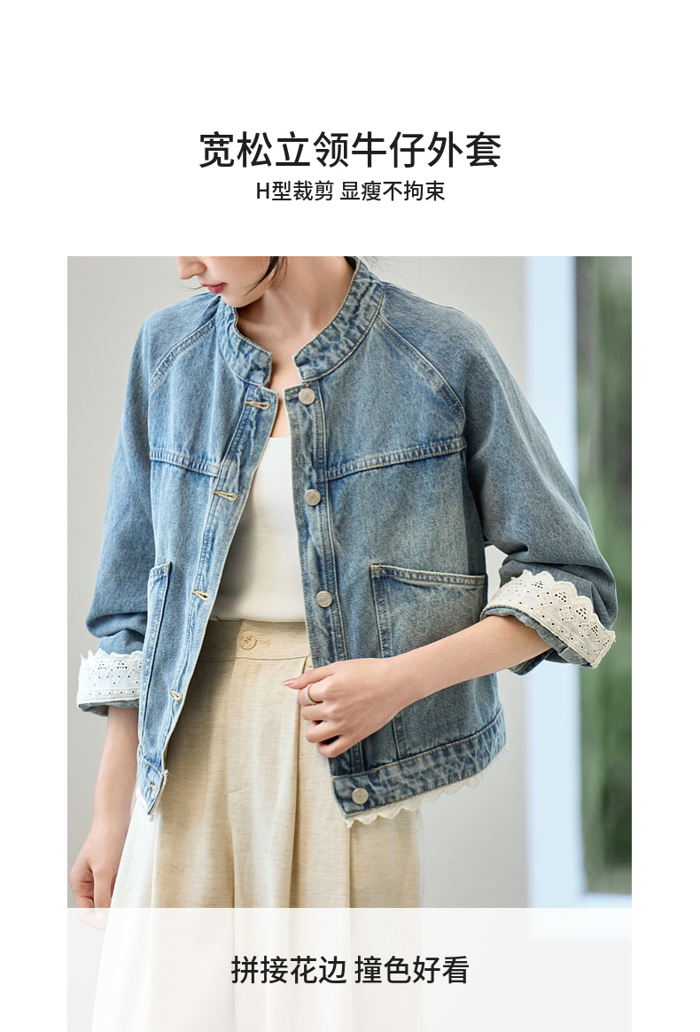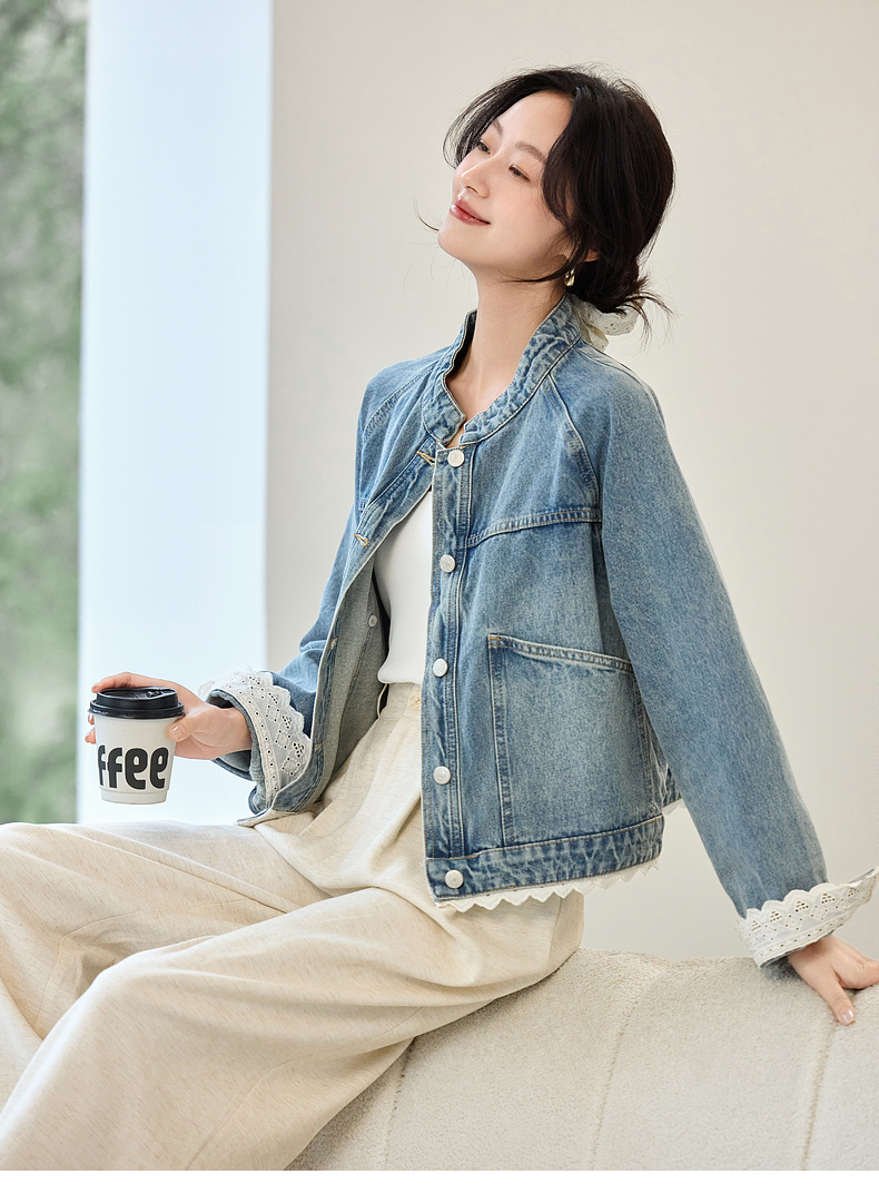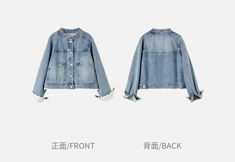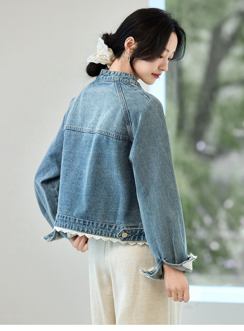 【内购】【拼接撞色花边】轻复古简约通勤立领插肩袖宽松显瘦纯棉牛仔外套-W51W80480
