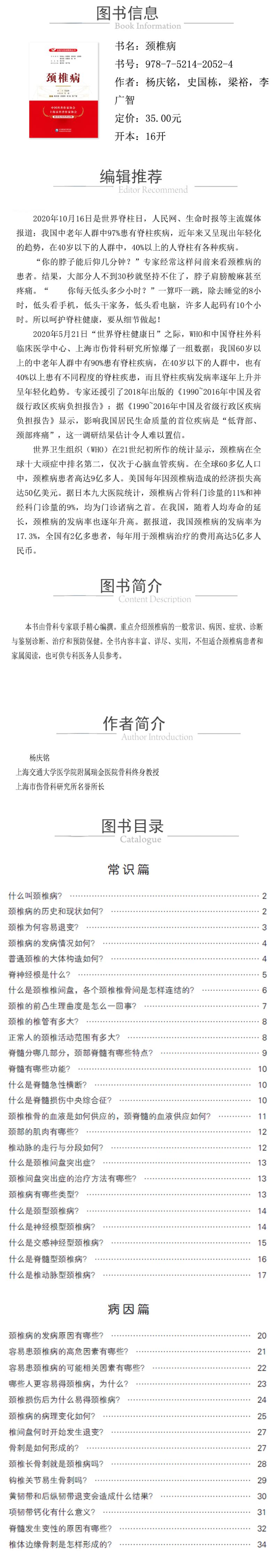 本书由骨科专家联手精心编撰。重点介绍颈椎病的一般常识、病因、症状、诊断与鉴别诊断、治疗和预防保健。全书内容丰富、详尽、实用,不但适合颈椎病患者和家属阅读,也可供专科医务人员参考。