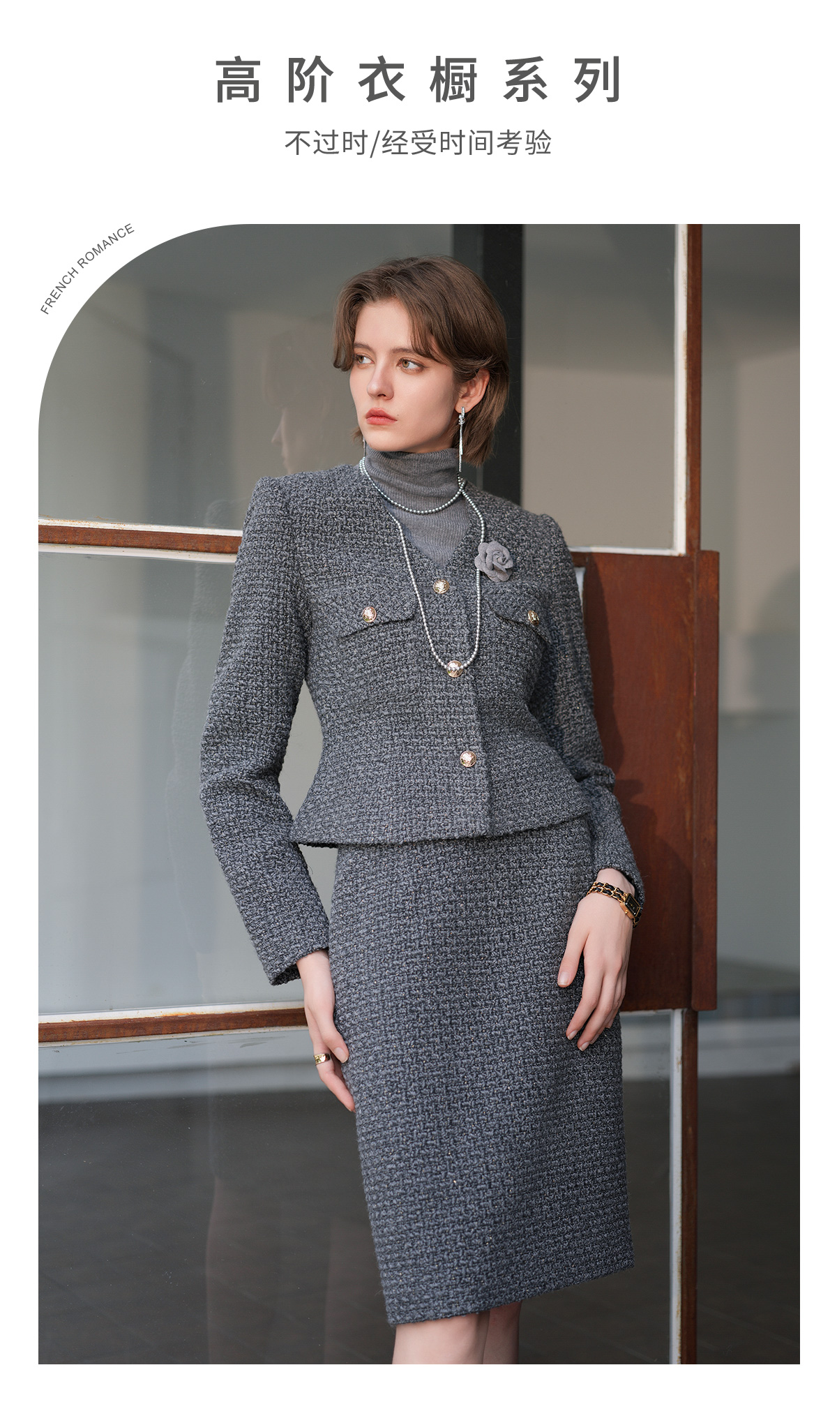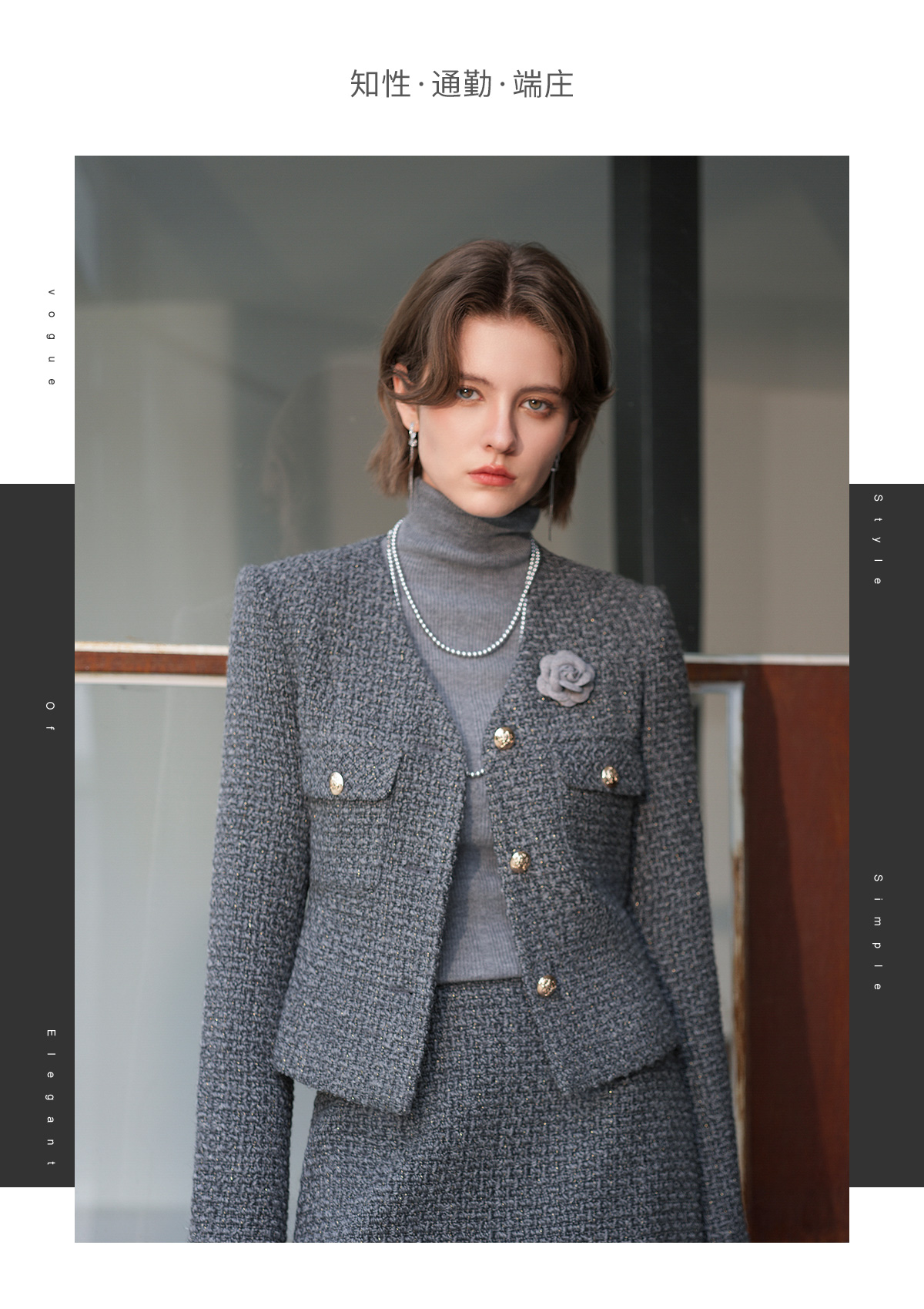 IWY/灰色长袖西装半裙职业工装遮腰显瘦轻熟风V领编织通勤干练套装CS2070